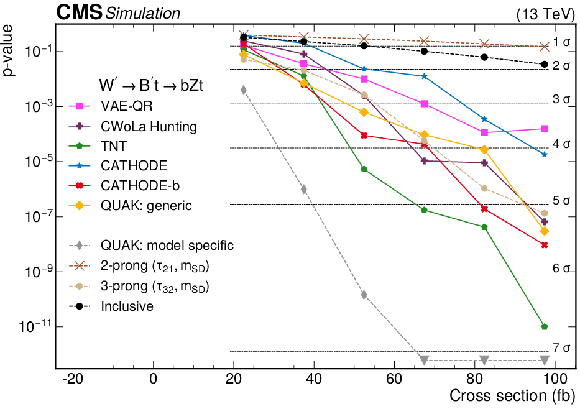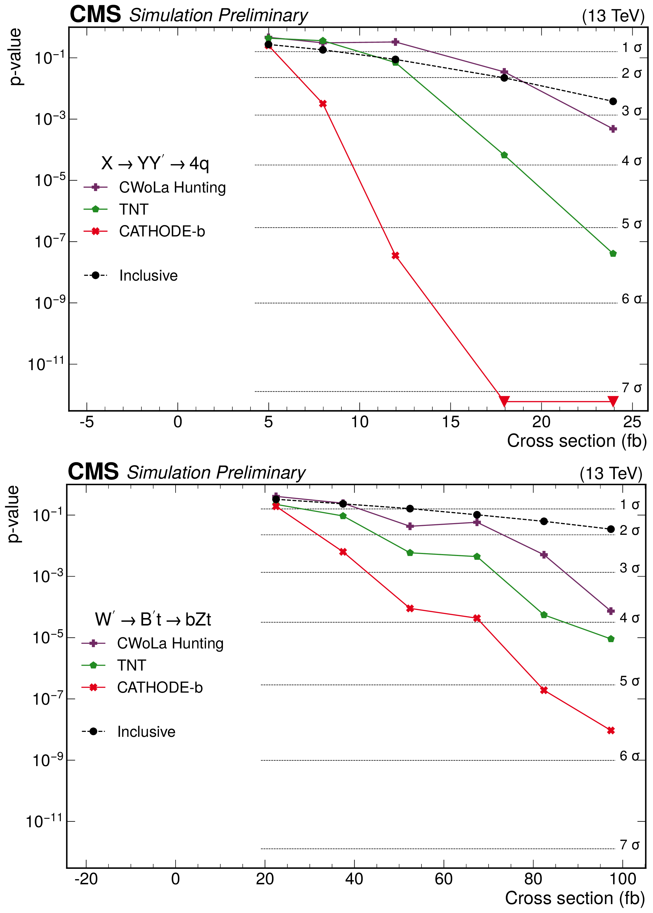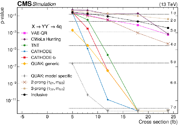 The $ p $-values as a function of the injected signal cross sections for the different analysis procedures modified to use a common set of input features, for two different signals: (upper) the 2-prong $ \mathrm{X}\to \mathrm{Y} \mathrm{Y'} \to 4 \mathrm{q} $ signal with $ m_\mathrm{X}= $ 3 TeV, $ m_\mathrm{Y}= $ 170 GeV, and $ M_\mathrm{Y'}= $ 170 GeV, and (lower) 3-prong $ \mathrm{W'} \to \mathrm{B'} \mathrm{t} \to \mathrm{b} \mathrm{Z} \mathrm{t} $ signal with $ M_\mathrm{W'}= $ 3 TeV and $ M_\mathrm{B'}= $ 400 GeV. Significance values larger than 7$ \sigma $ are denoted with downwards facing triangles. |