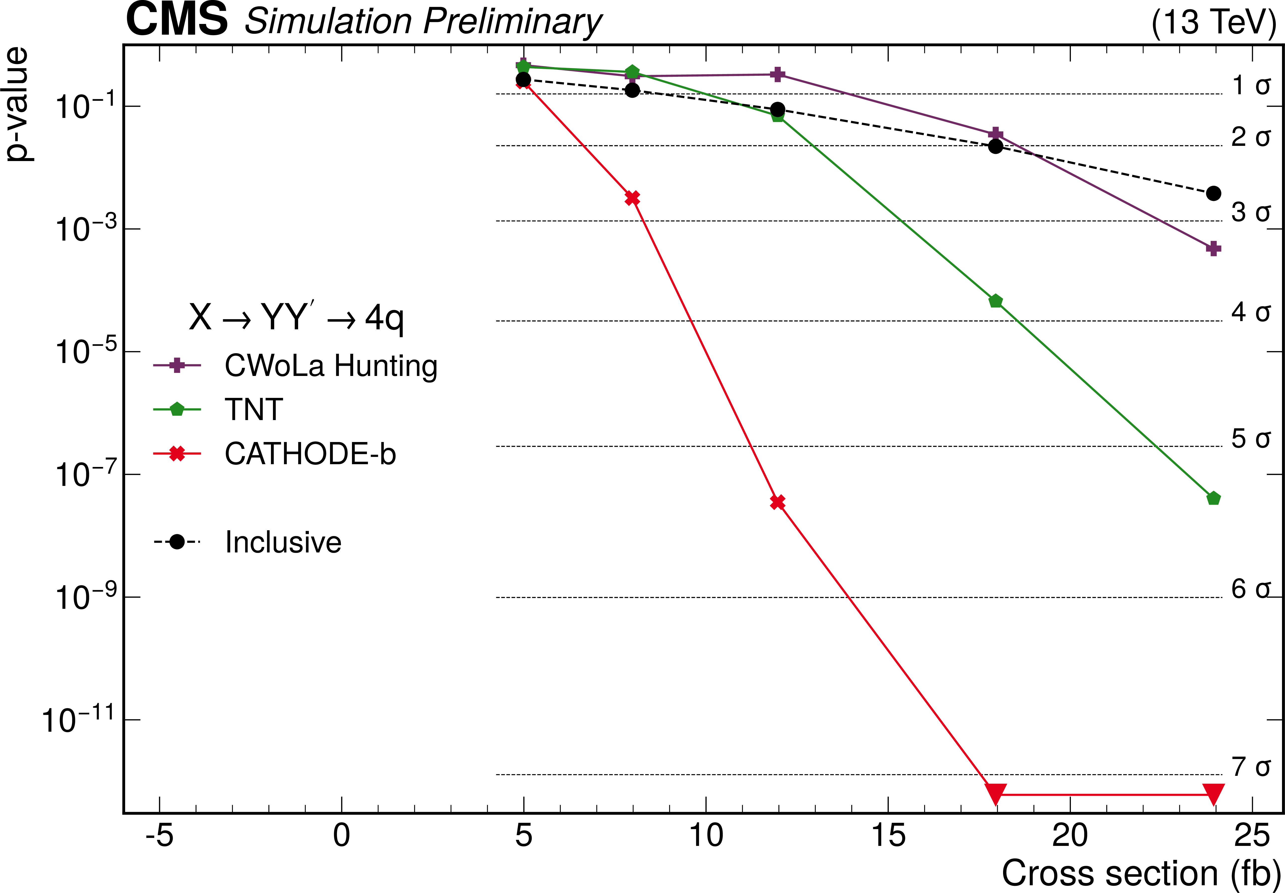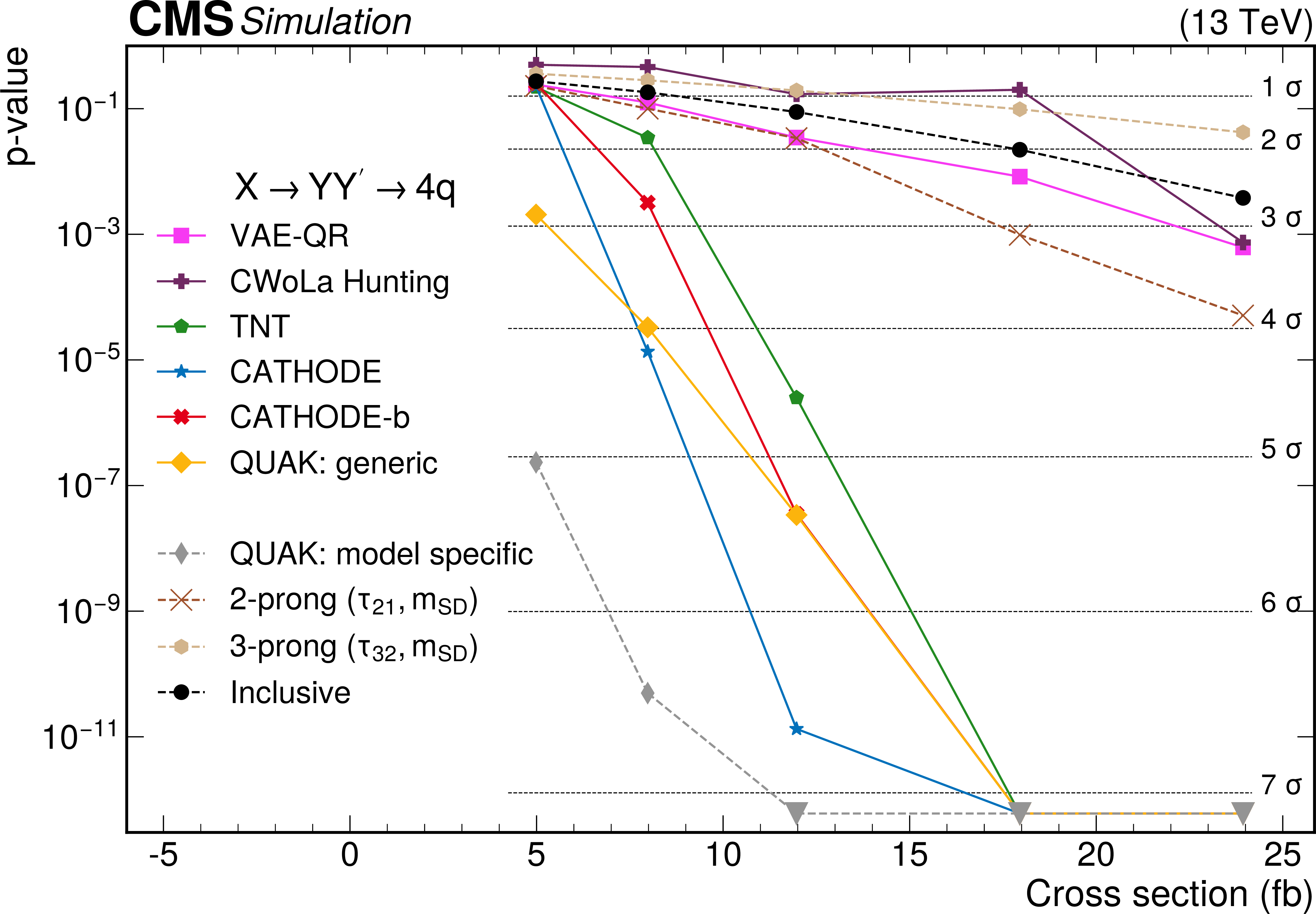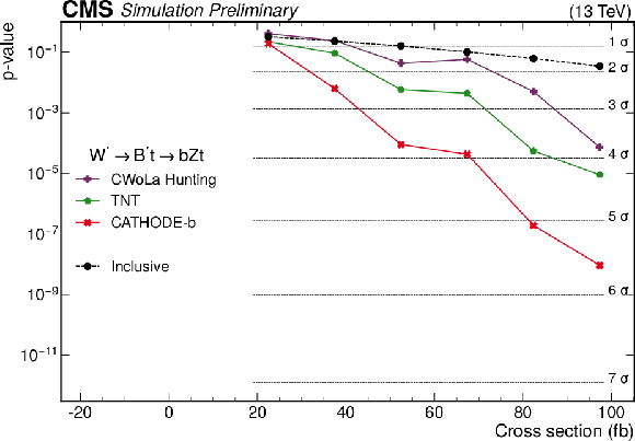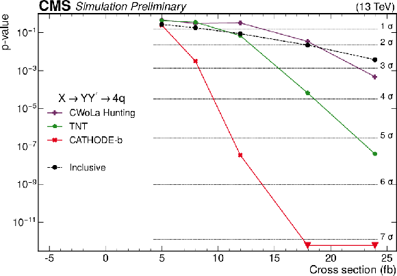 The $ p $-values as a function of the injected signal cross sections for the different analysis procedures for two different signals. The upper panel shows results for the 2-prong $ \mathrm{X}\to \mathrm{Y} \mathrm{Y'} \to 4 \mathrm{q} $ signal with $ m_{\text{X}} = $ 3 TeV, $ m_{\text{Y}} = $ 170 GeV, and $ m_{\text{Y'}} = $ 170 GeV, while the lower panel shows results for the 3-prong $ \mathrm{W'} \to \mathrm{B'} \mathrm{t} \to \mathrm{b} \mathrm{Z} \mathrm{t} $ signal with $ m_\mathrm{W'}= $ 3 TeV and $ m_{\mathrm{B'}}= $ 400 GeV. Significance values larger than 7$ \sigma $ are denoted with downwards facing triangles. Reproduced from Ref. [4]. |