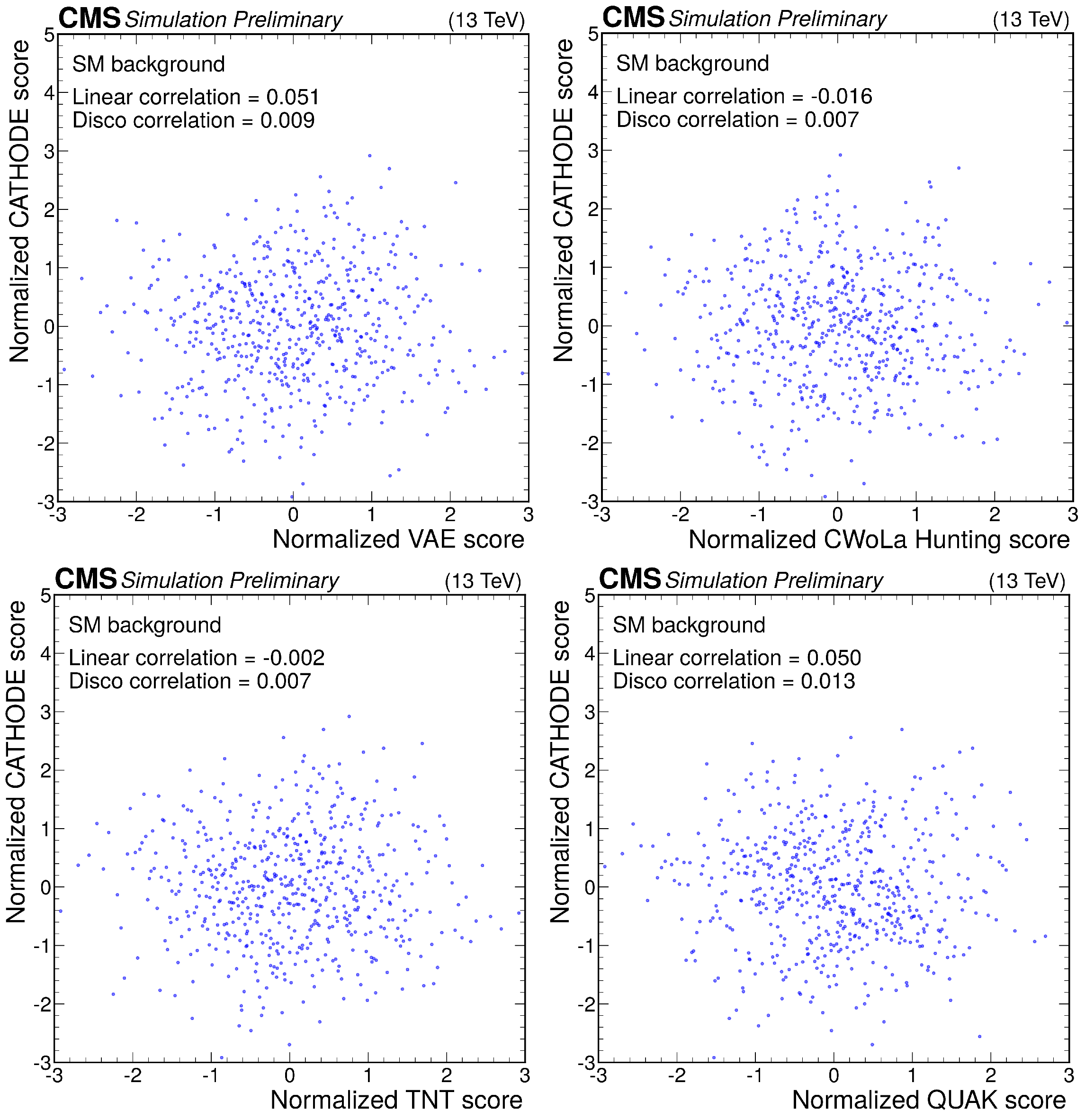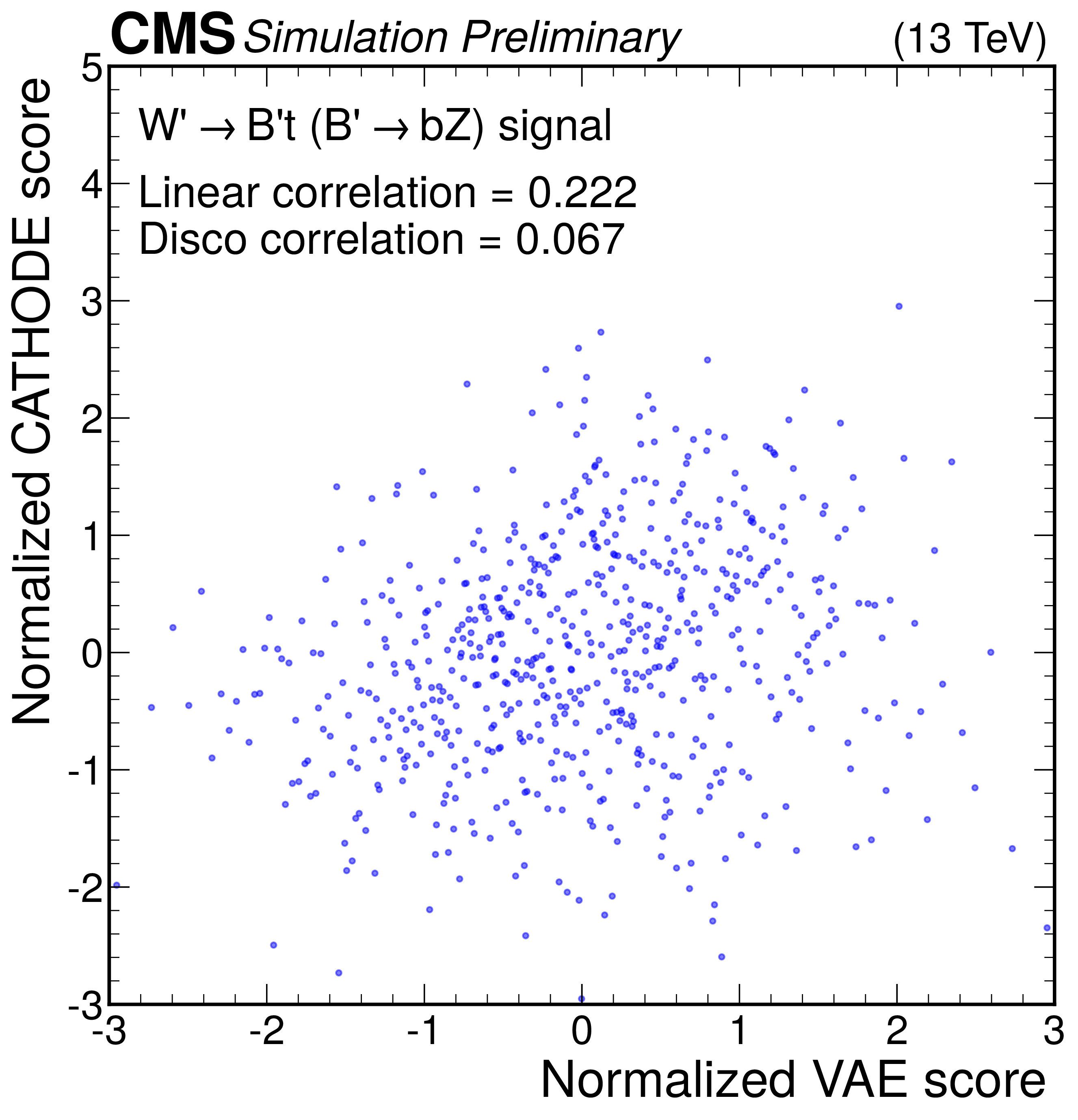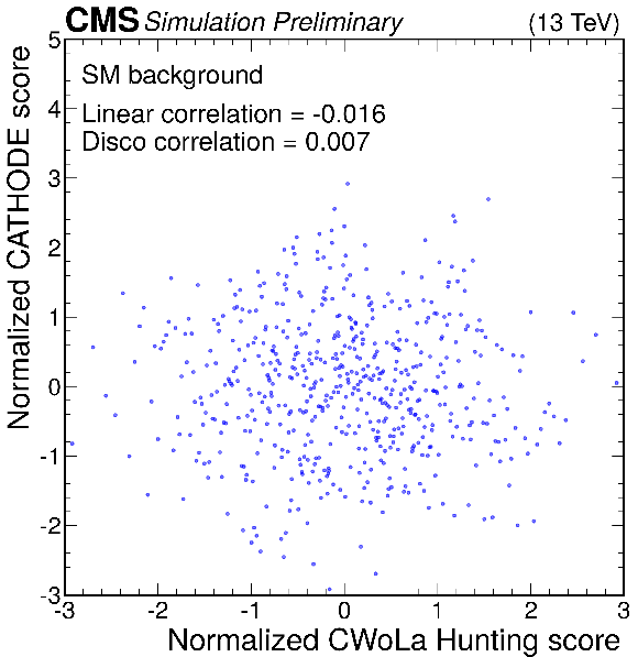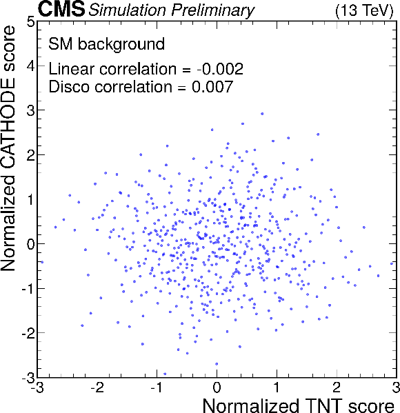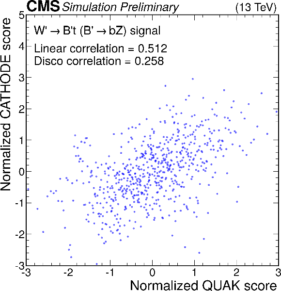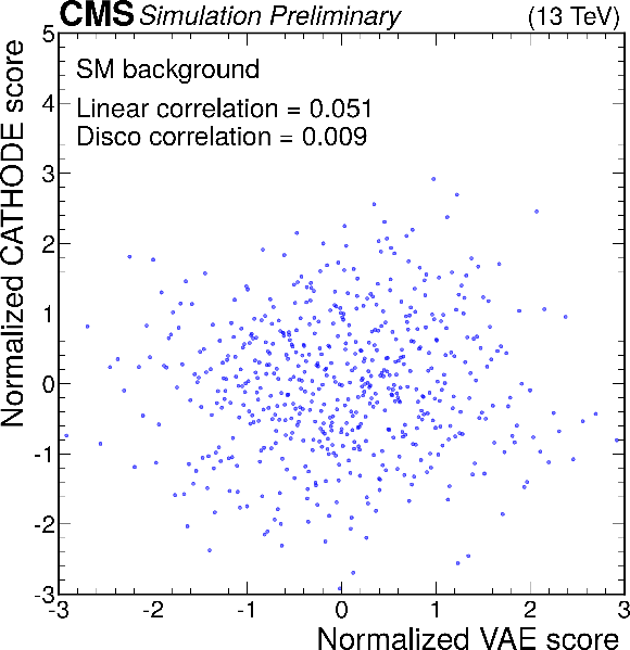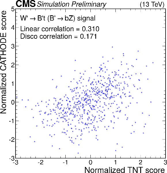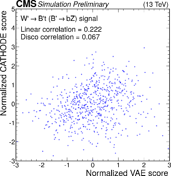 Anomaly score correlations of different methods on the $ \mathrm{W'} \to \mathrm{B'} \mathrm{t} \to \mathrm{b} \mathrm{Z} \mathrm{t} $ signal model. Scores are transformed to follow a normal distribution. The Pearson linear correlation coefficient and distance correlation (DisCo) are listed for each pairing. See text for details. |
