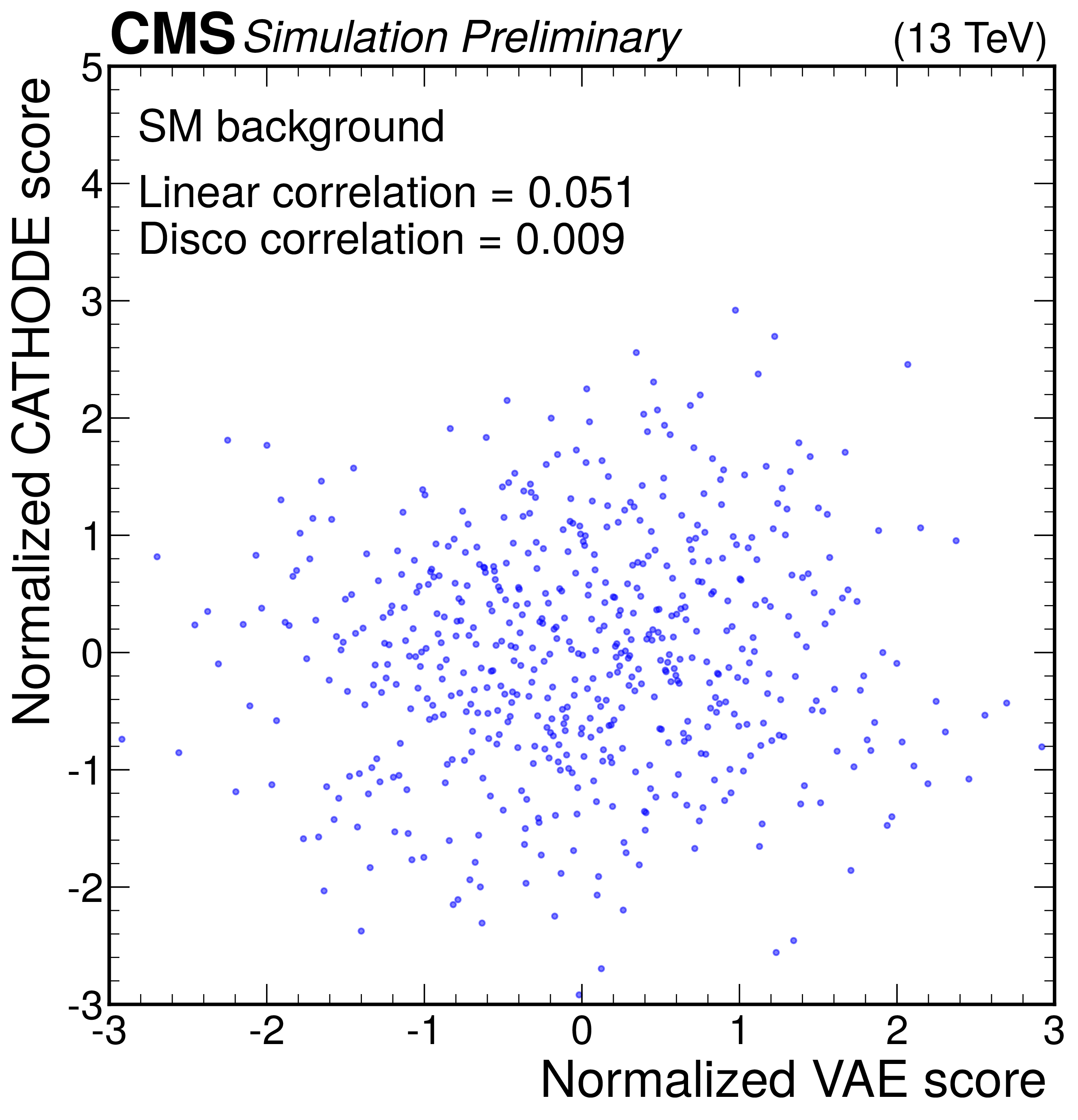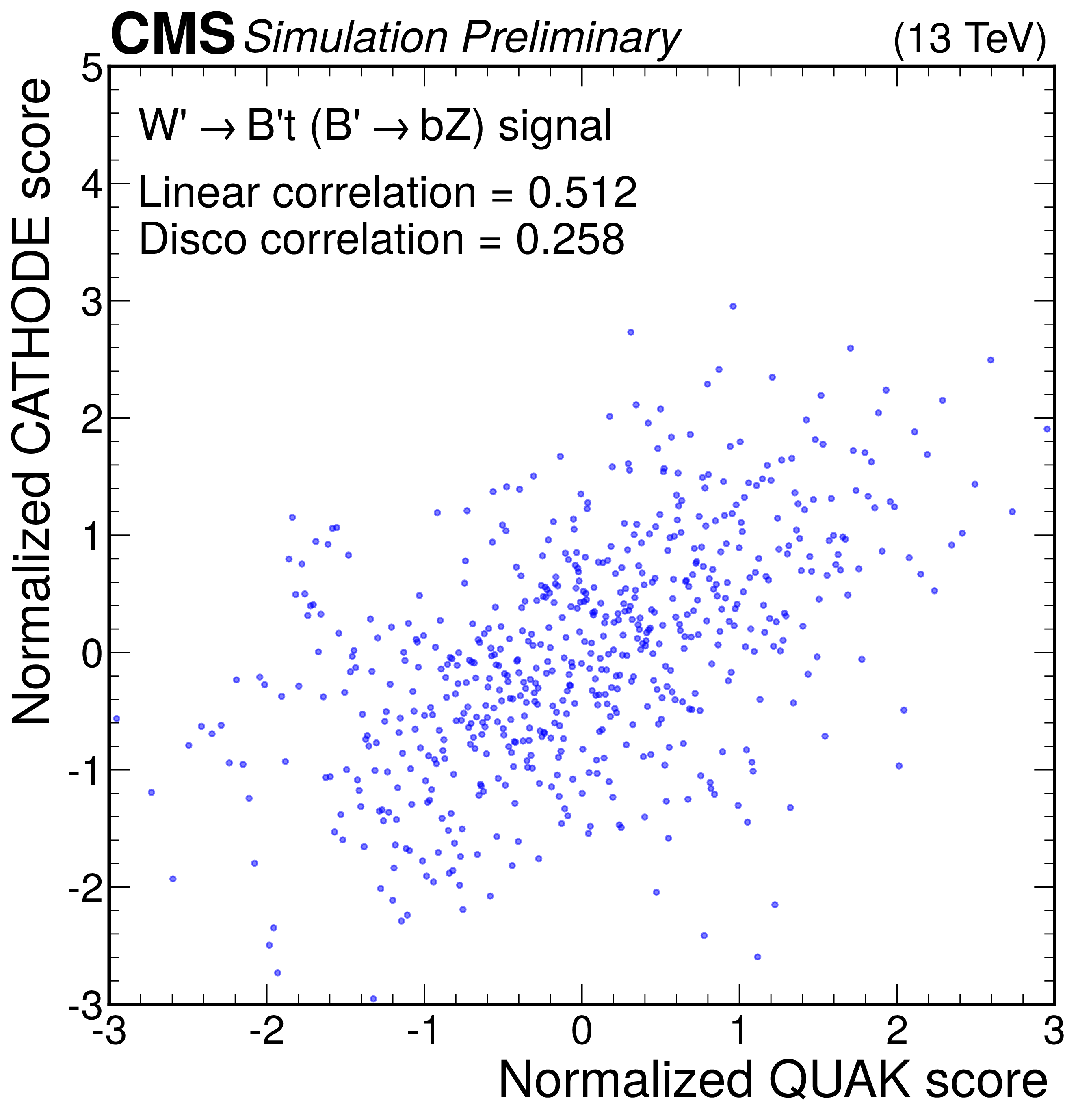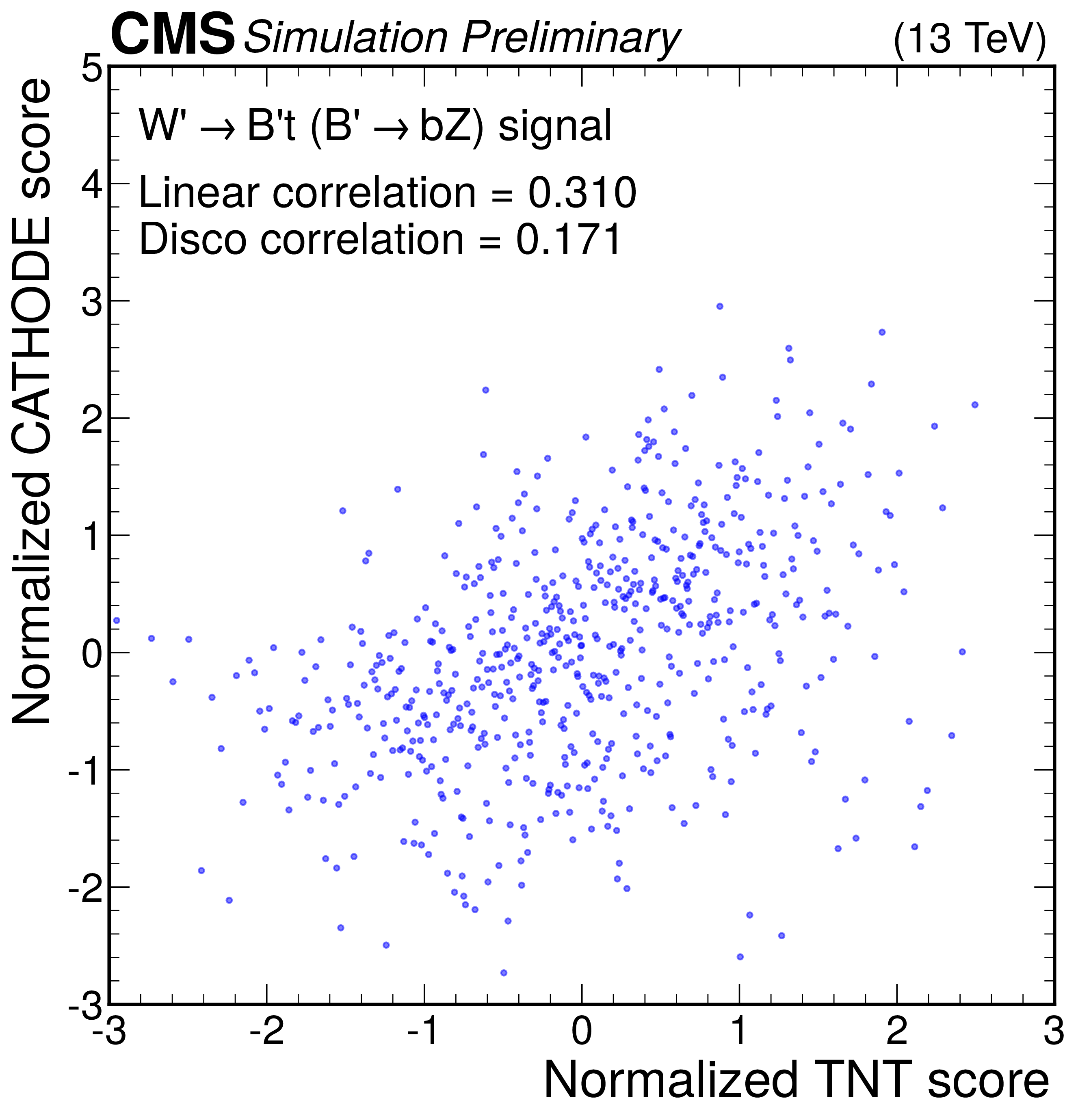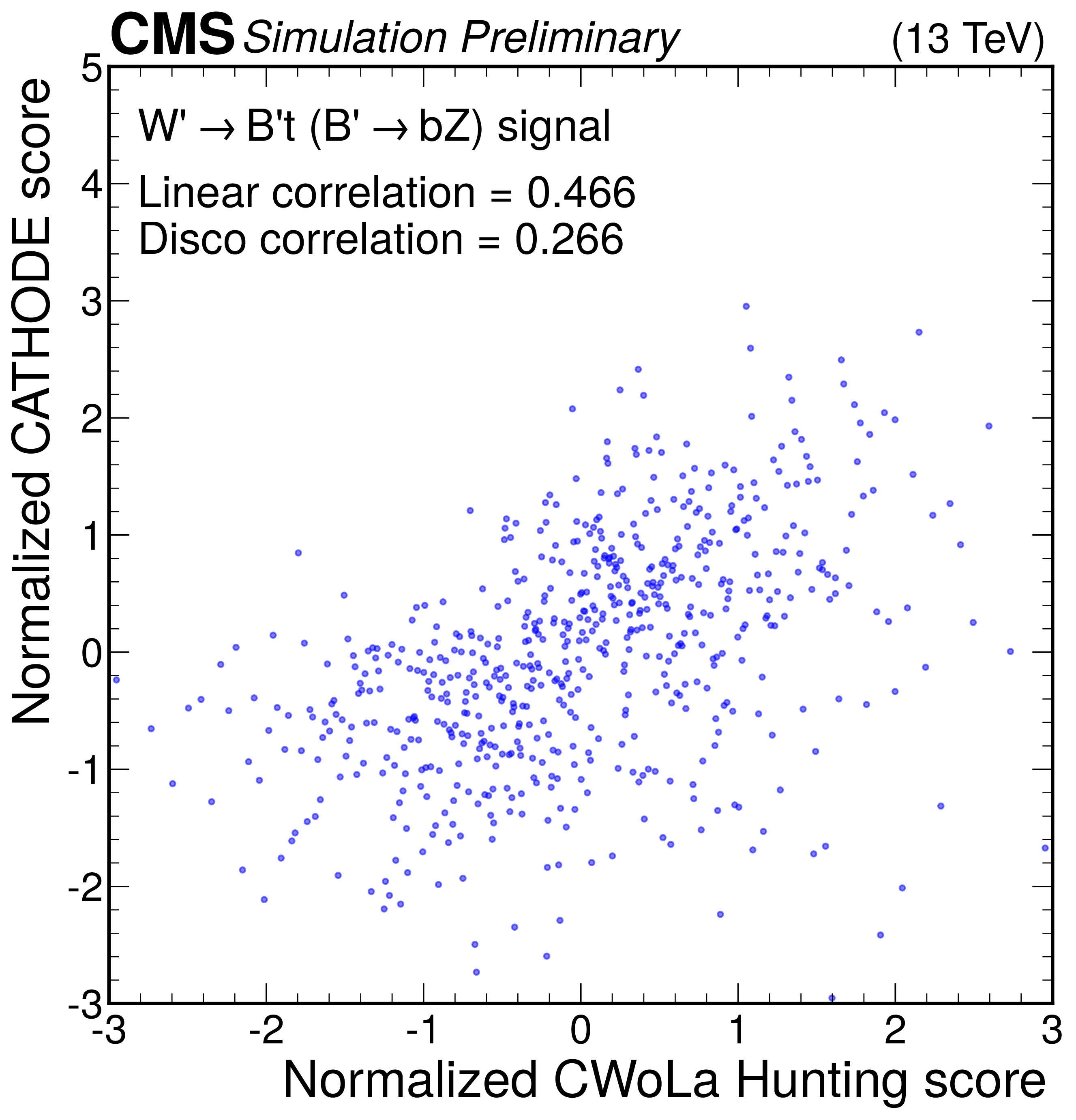 Anomaly score correlations of different methods on the $ \mathrm{W'} \to \mathrm{B'} \mathrm{t} \to \mathrm{b} \mathrm{Z} \mathrm{t} $ signal model. Scores are transformed to follow a normal distribution. The Pearson linear correlation coefficient and distance correlation (DisCo) are listed for each pairing. See text for details. |