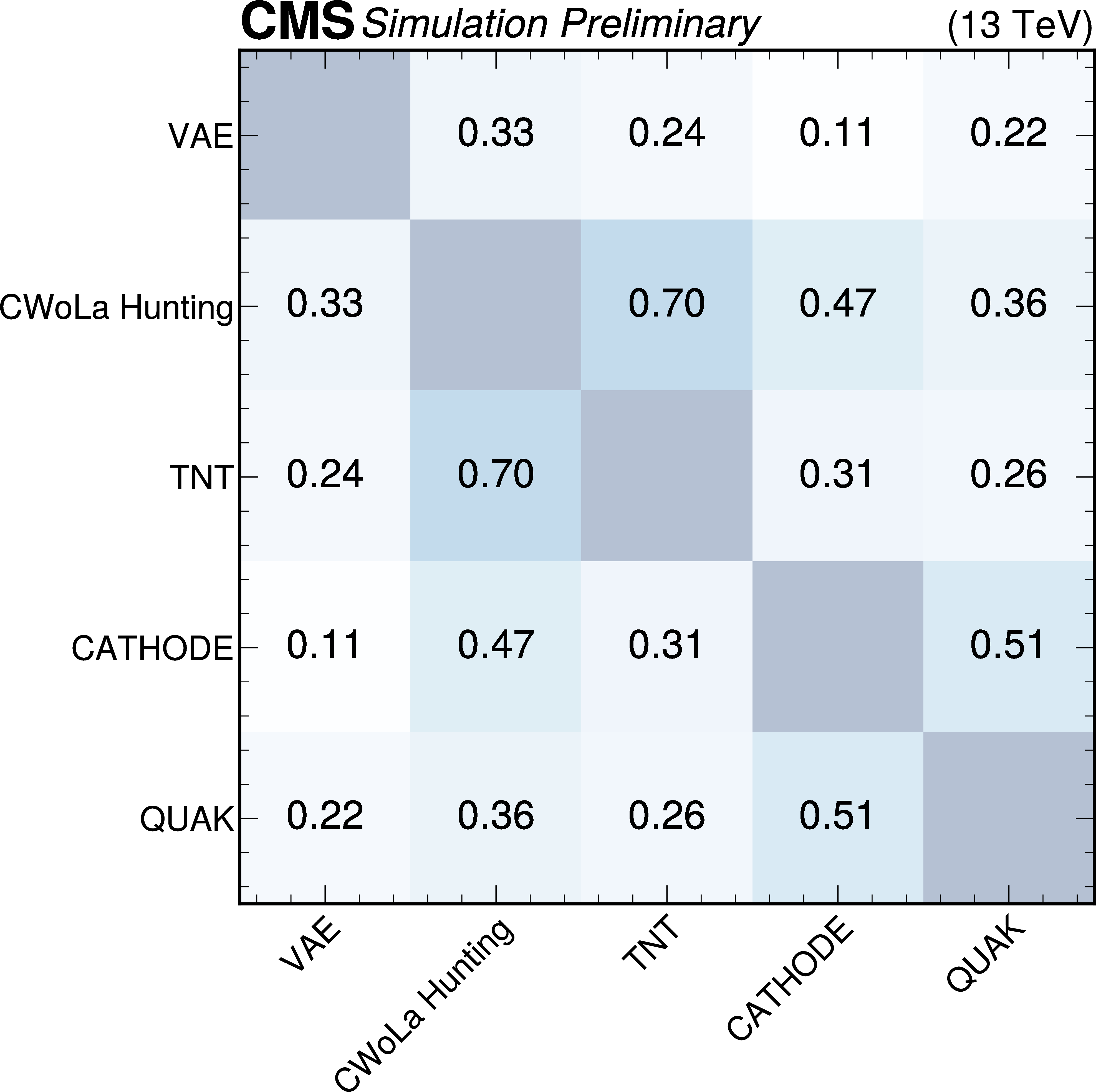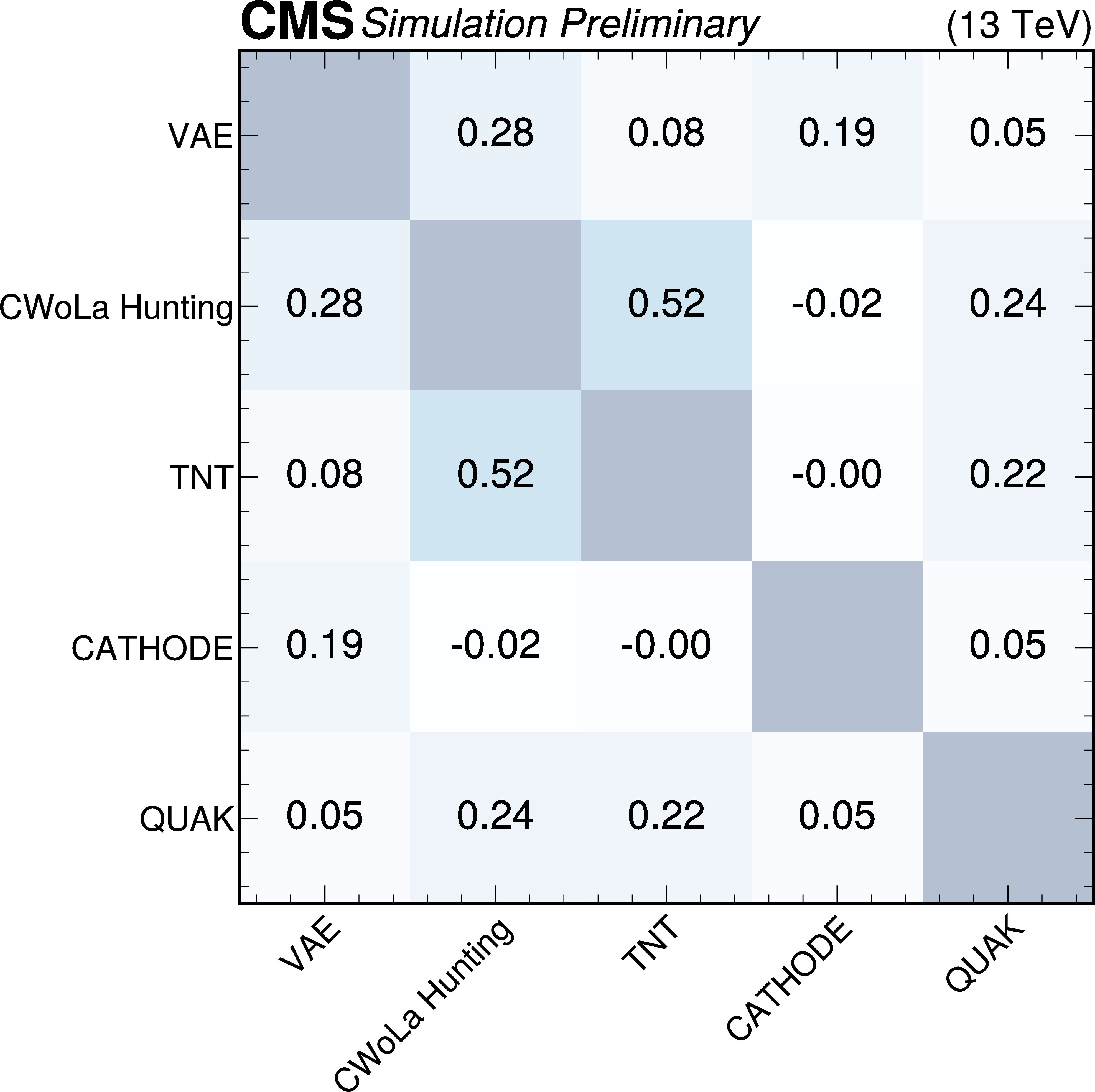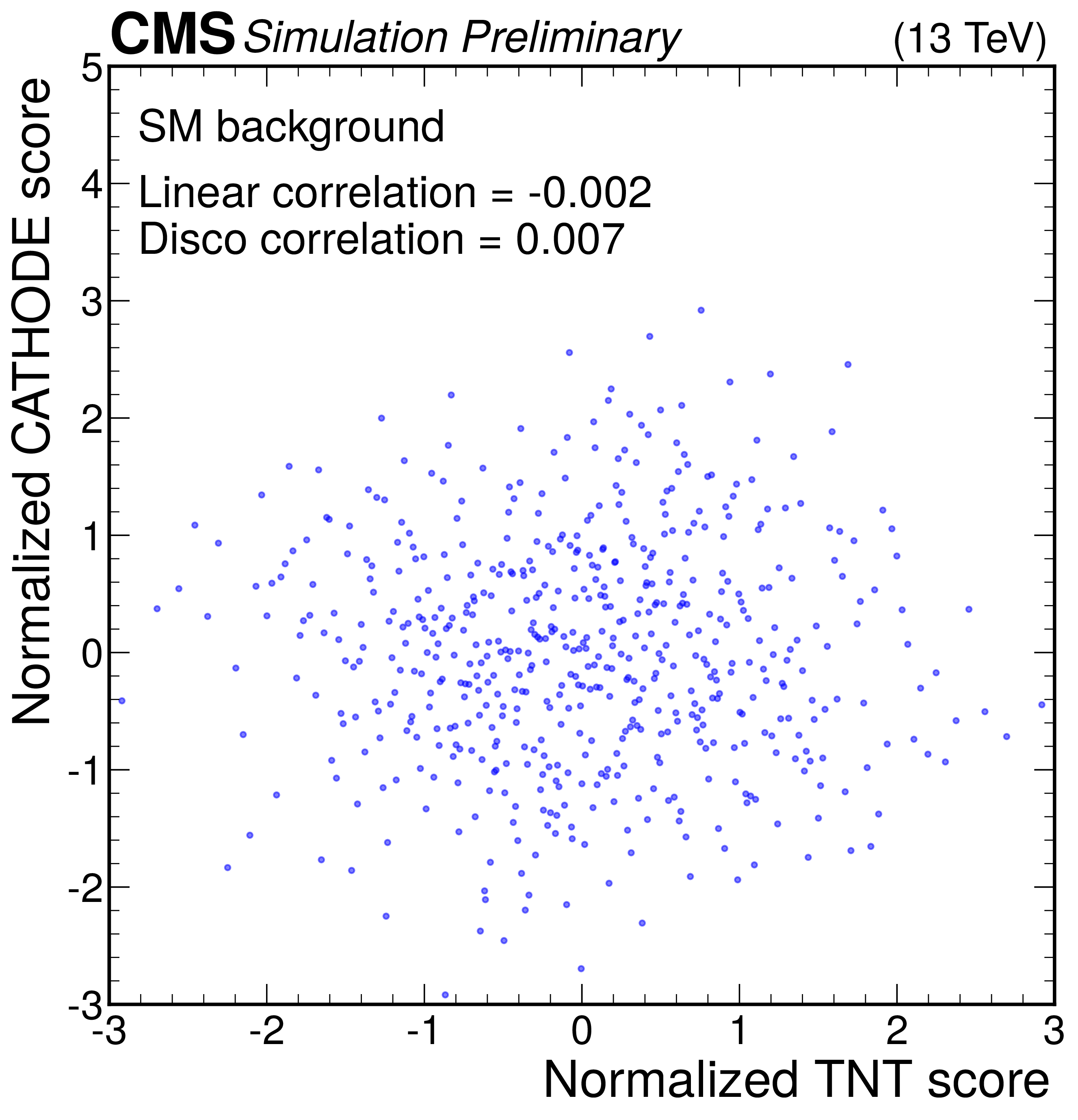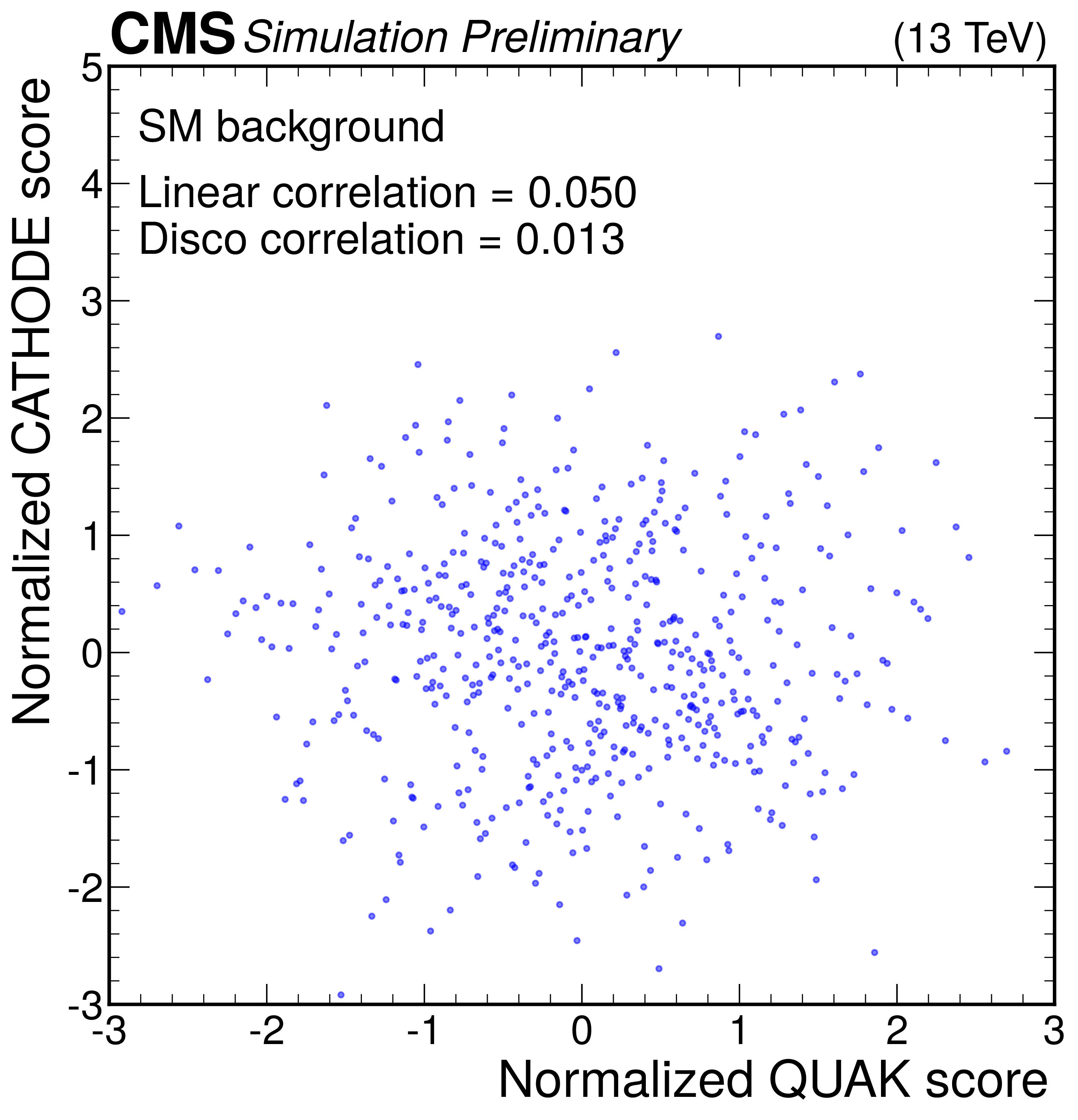 Anomaly score correlations of different methods on the $ \mathrm{W'} \to \mathrm{B'} \mathrm{t} \to \mathrm{b} \mathrm{Z} \mathrm{t} $ signal model. Scores are transformed to follow a normal distribution. The Pearson linear correlation coefficient and distance correlation (DisCo) are listed for each pairing. See text for details. |