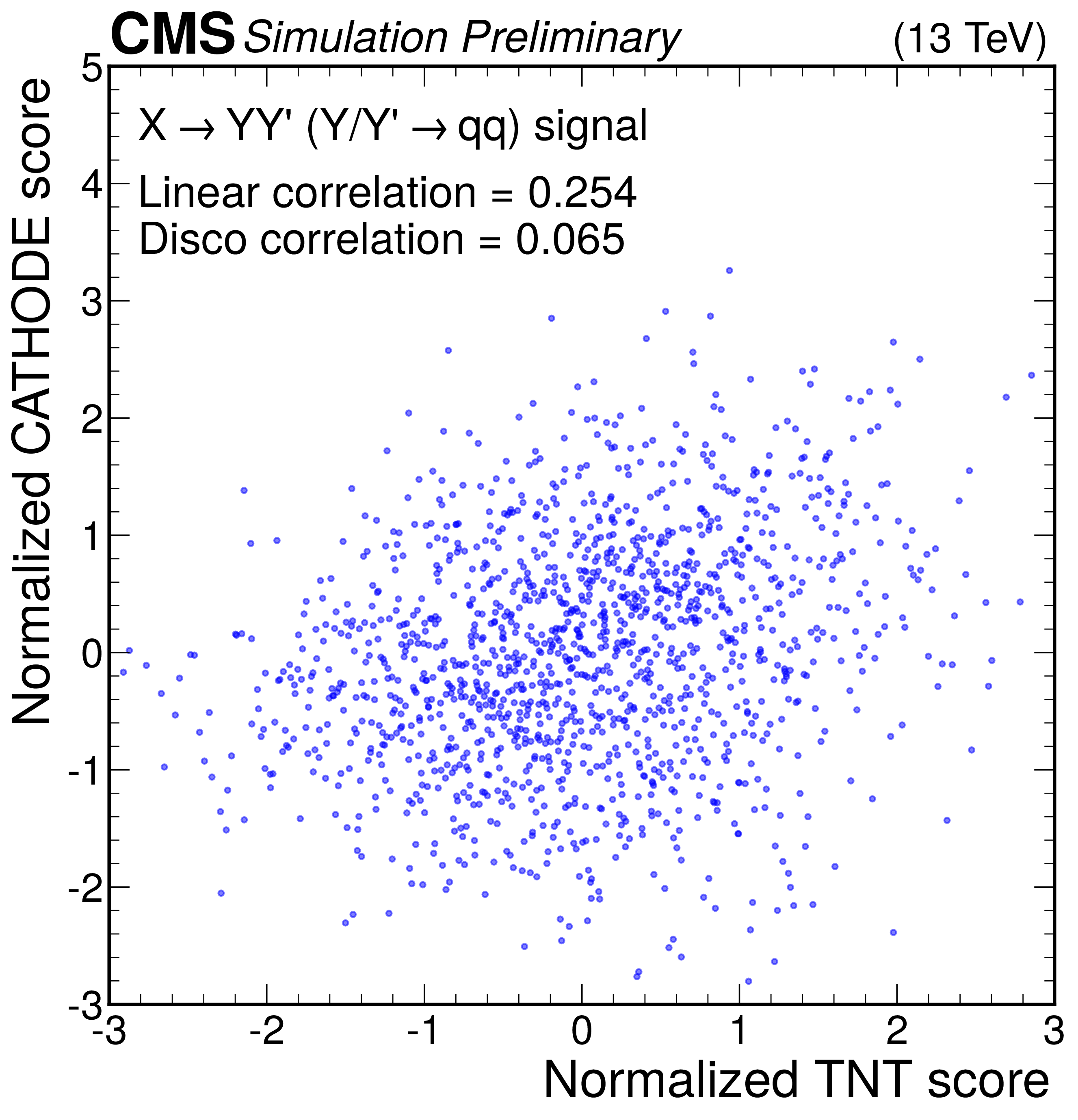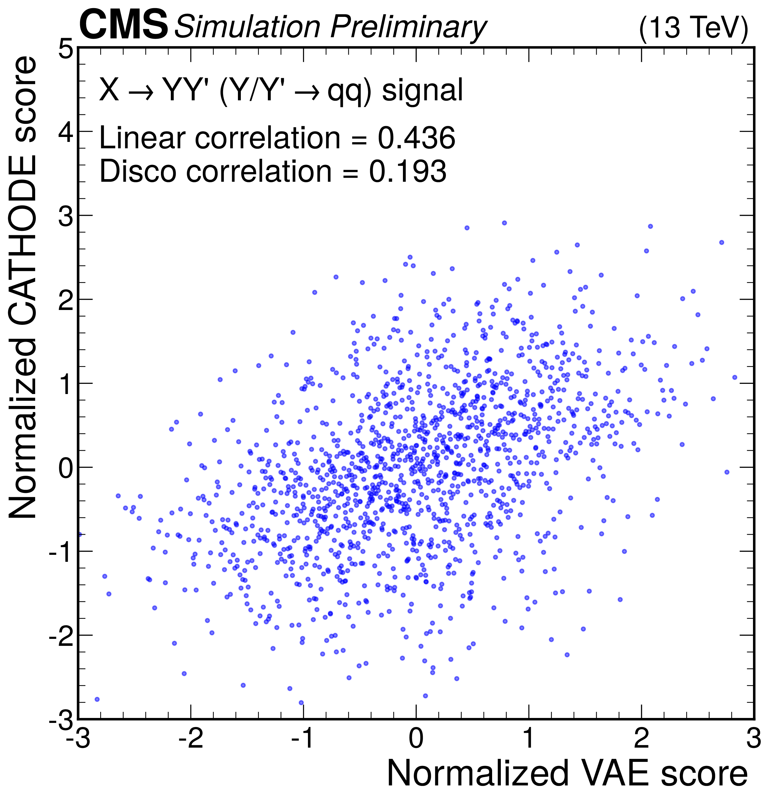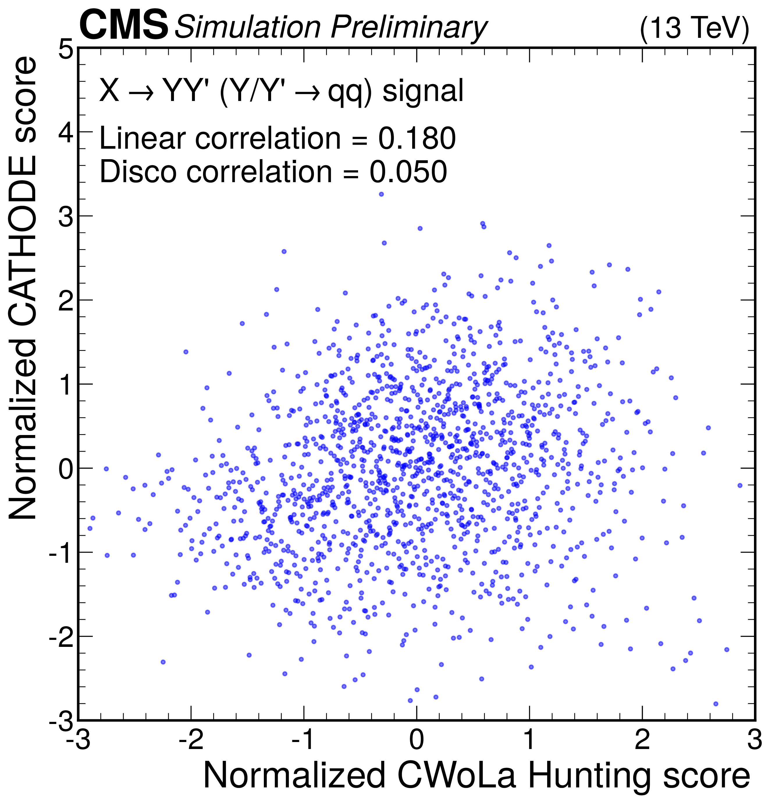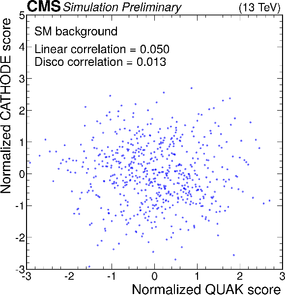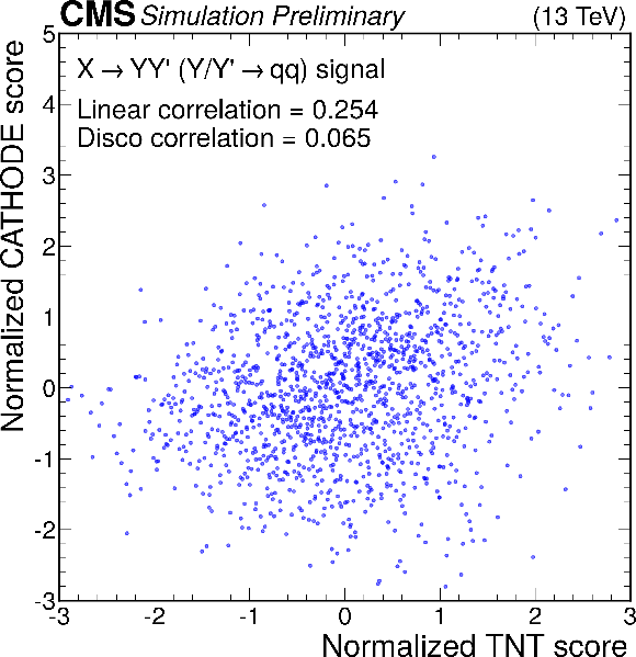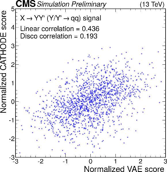 Anomaly score correlations of different methods on the $ \mathrm{X}\to \mathrm{Y} \mathrm{Y'} \to 4 \mathrm{q} $ signal model. Scores are transformed to follow a normal distribution. The Pearson linear correlation coefficient and distance correlation (DisCo) are listed for each pairing. See text for details. |