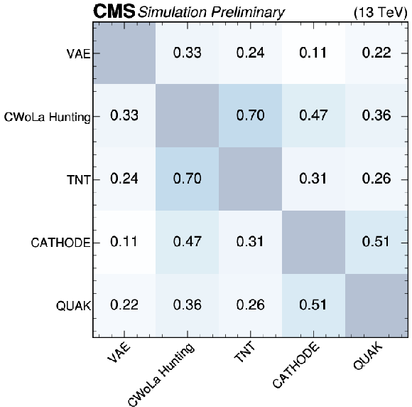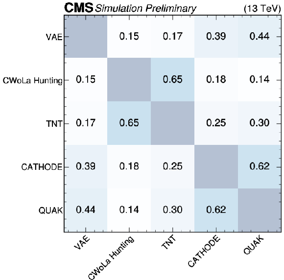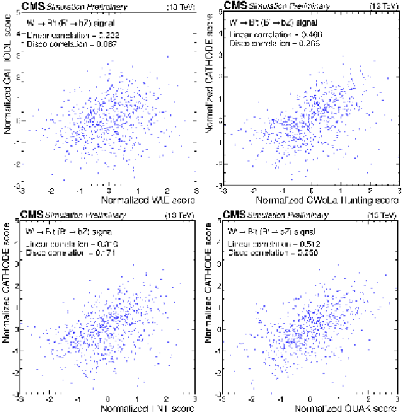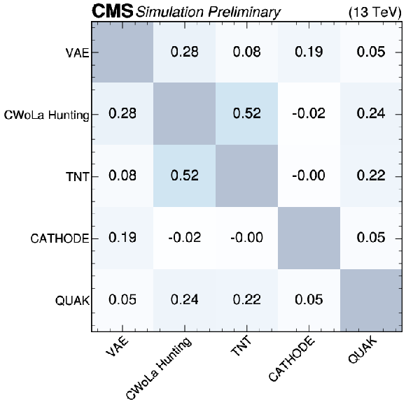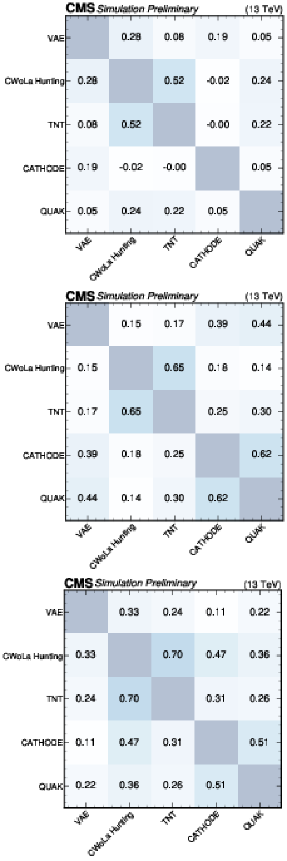 Summary plots showing the Pearson correlation coefficient for each pair of anomaly detection algorithms as evaluated on events from the SM backgrounds (top), $ \mathrm{X}\to \mathrm{Y} \mathrm{Y'} \to 4 \mathrm{q} $ signal (lower left), and $ \mathrm{W'} \to \mathrm{B'} \mathrm{t} \to \mathrm{b} \mathrm{Z} \mathrm{t} $ signal (lower right). In many cases, the correlations are weak, indicating complementarity between the different approaches. |