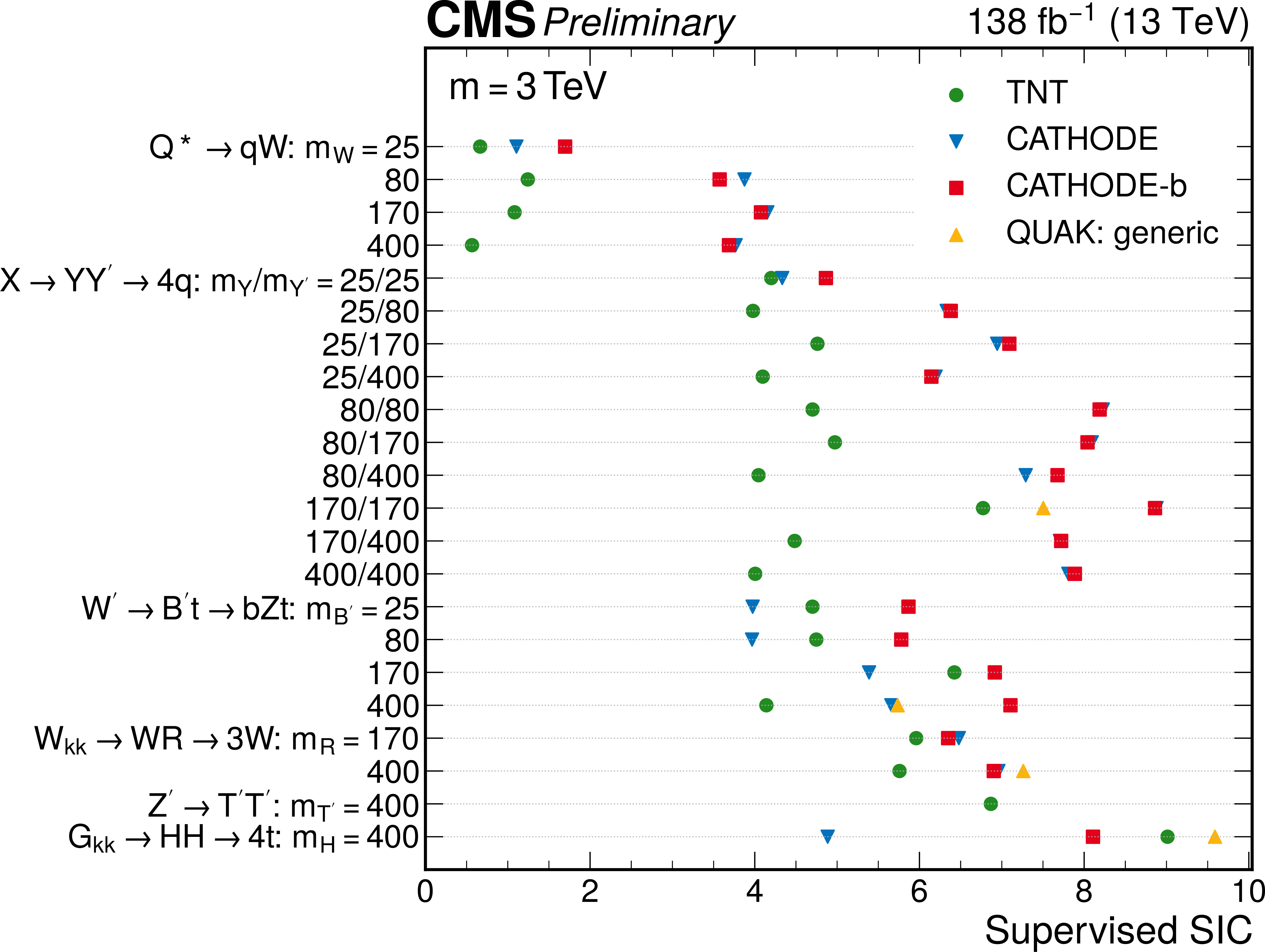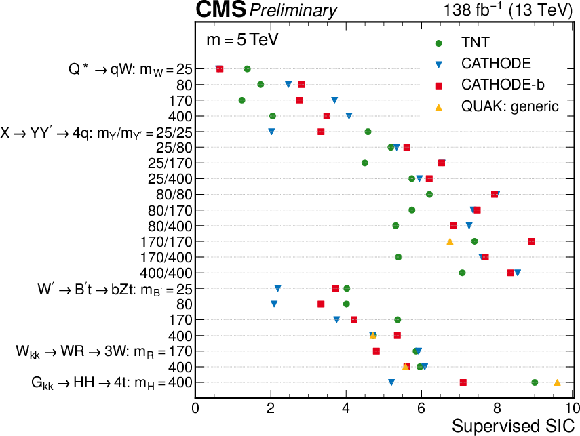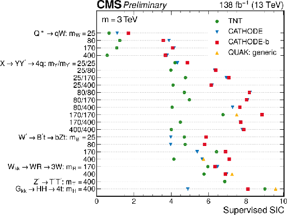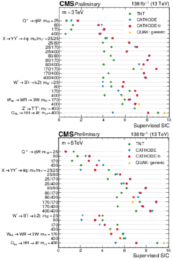Significance improvement obtained from supervised classifiers trained using the same inputs as the anomaly detection methods. The top (bottom) plot shows the 3 TeV (5 TeV) mass point for all signal models. The masses of intermediate decay particles are listed in GeV. |