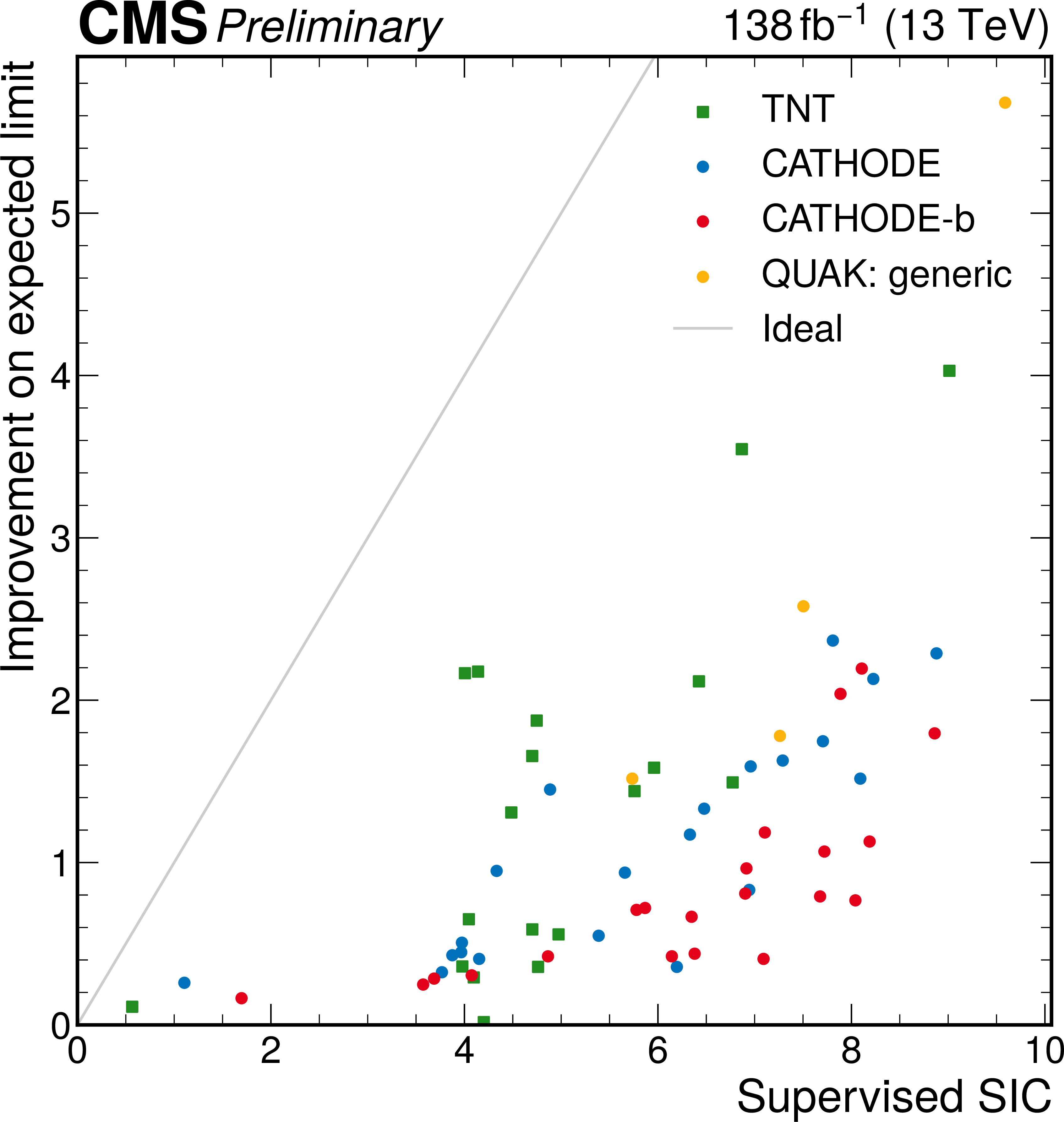 Comparison of anomaly detection and supervised classification performance. The improvement on the limit obtained after anomaly detection is compared to the significance improvement from classifiers trained using the same inputs as the anomaly detection methods. The 3 TeV mass point is shown for all models. |