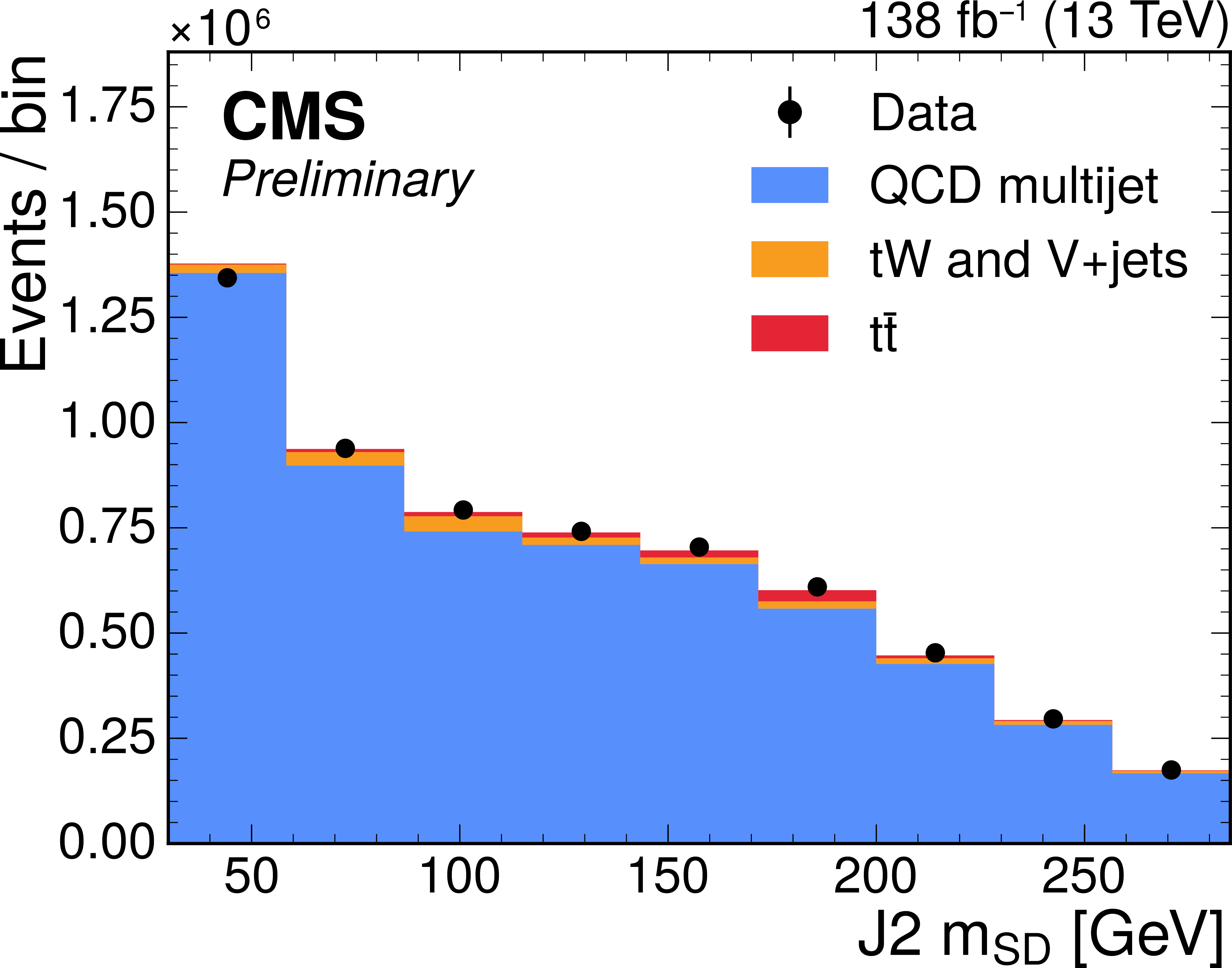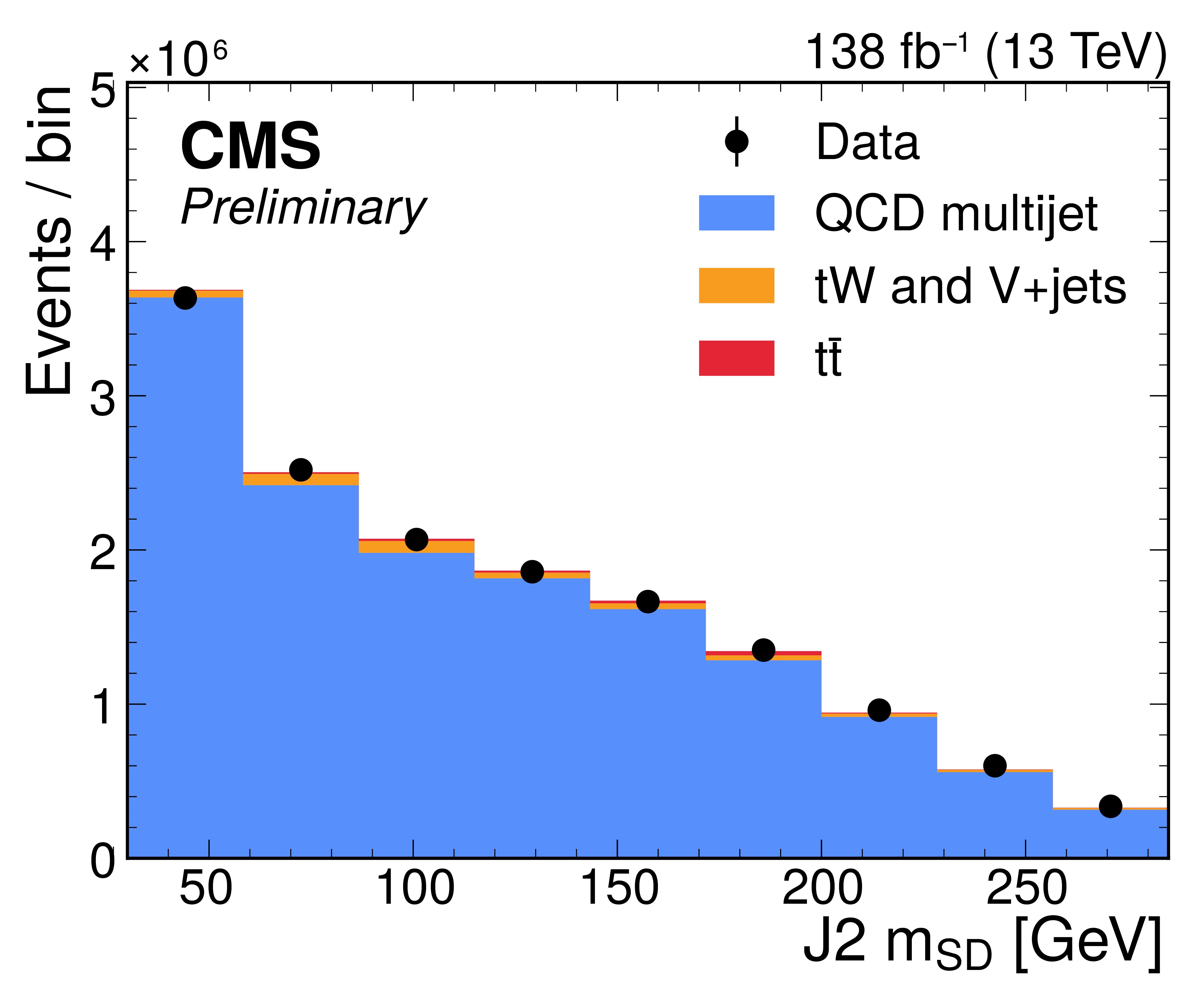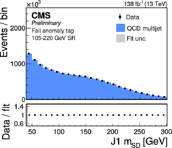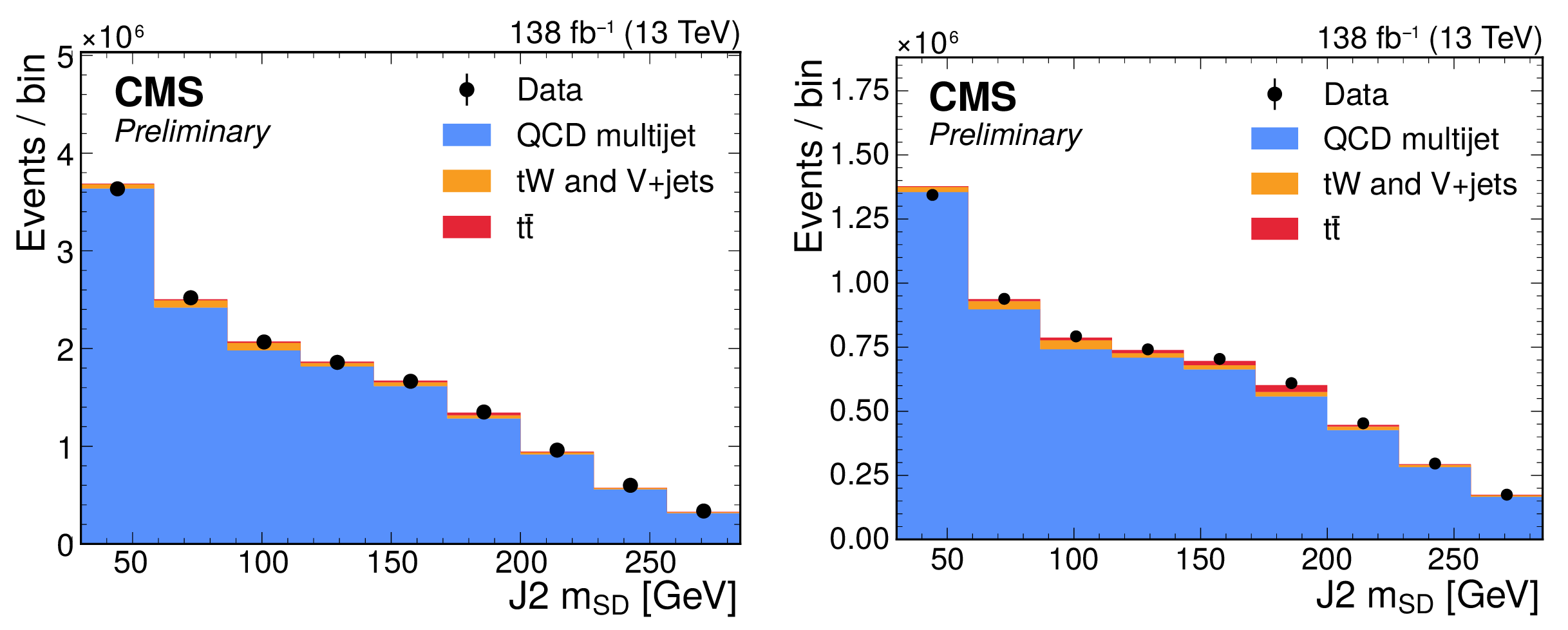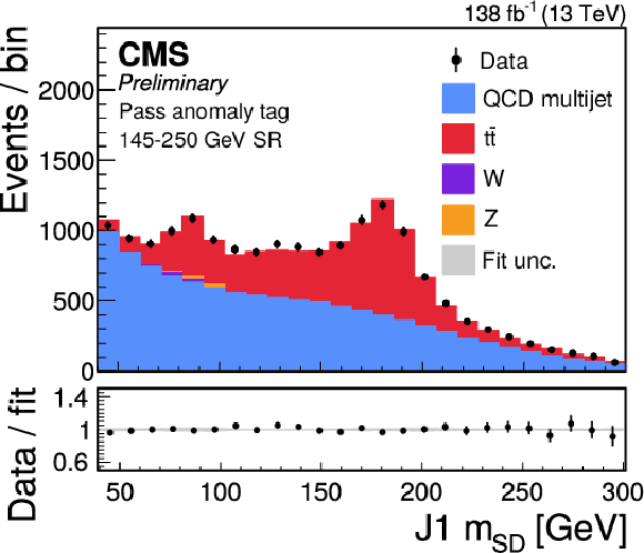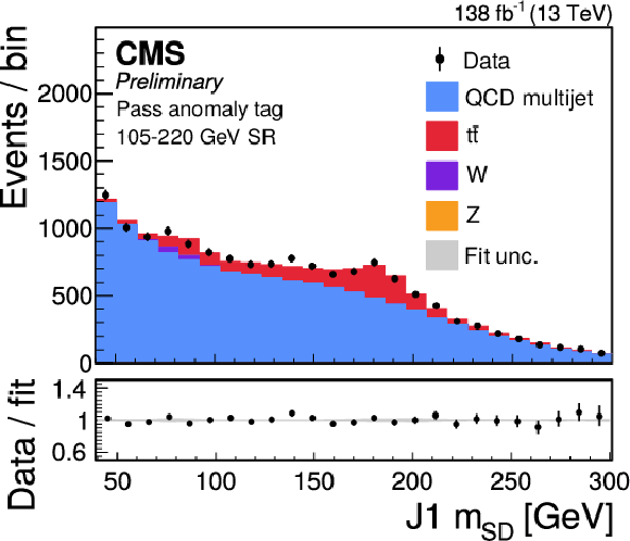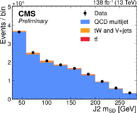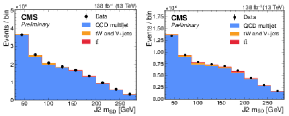 Distribution of the J2 soft-drop mass after the basic (left) and b-tagged (right) preselections. The black dots represent the data and the colored histograms correspond to simulated events. The b tagging preselection increases the relative contribution of $ \mathrm{t} \overline{\mathrm{t}} $ (red) in the sample, but in both cases the sample is dominated by the QCD multijet background (blue). Other background processes are shown in yellow. |