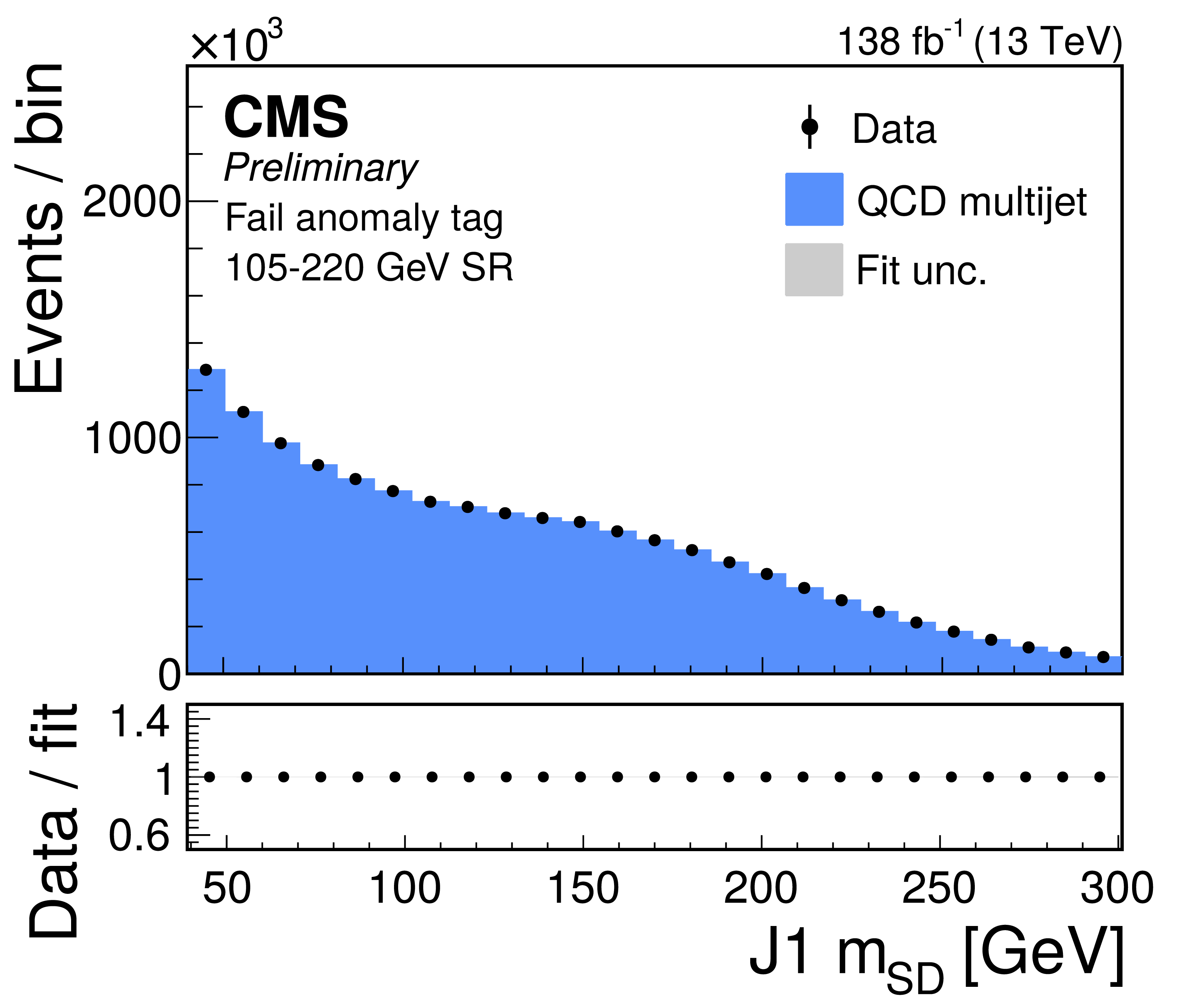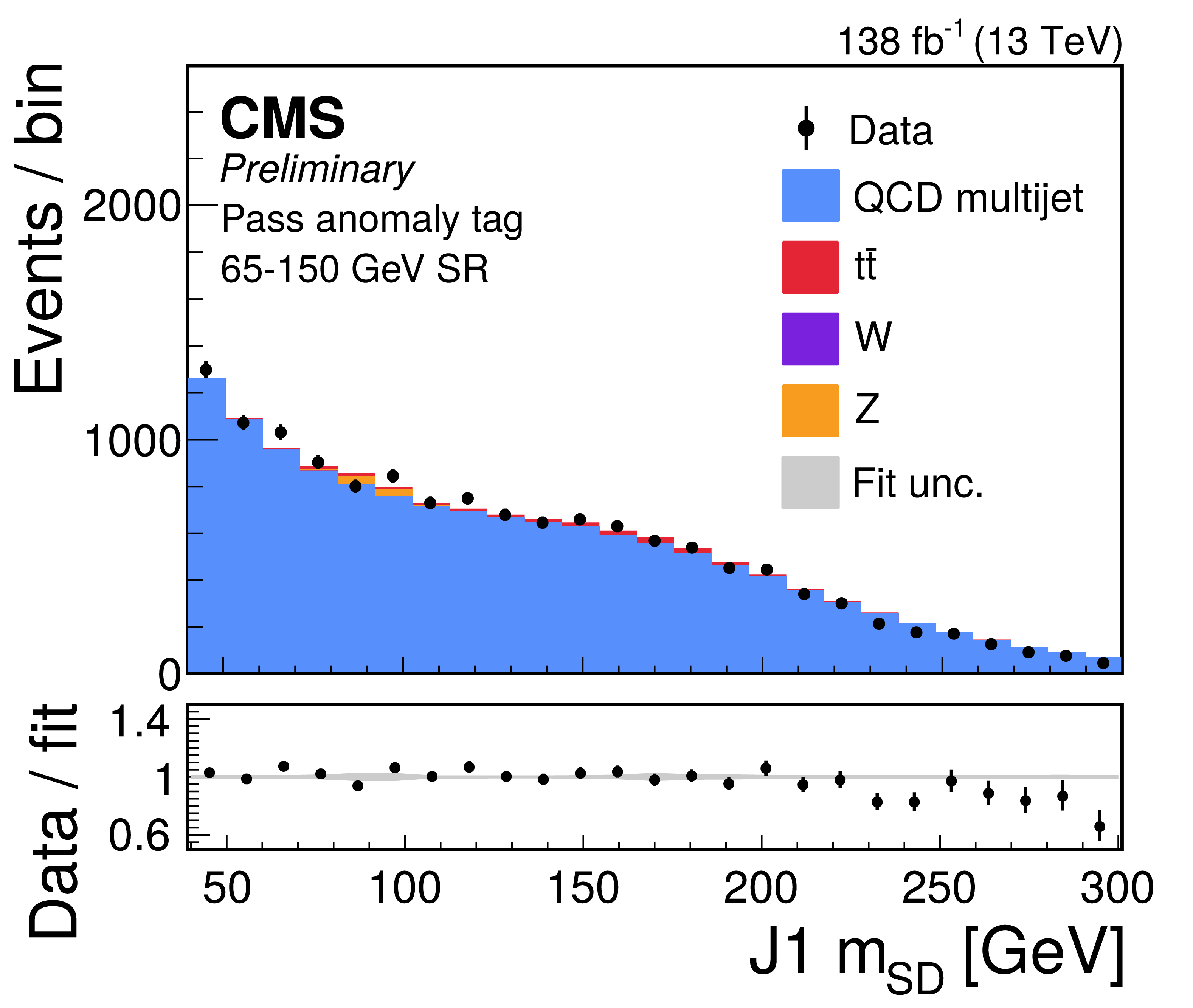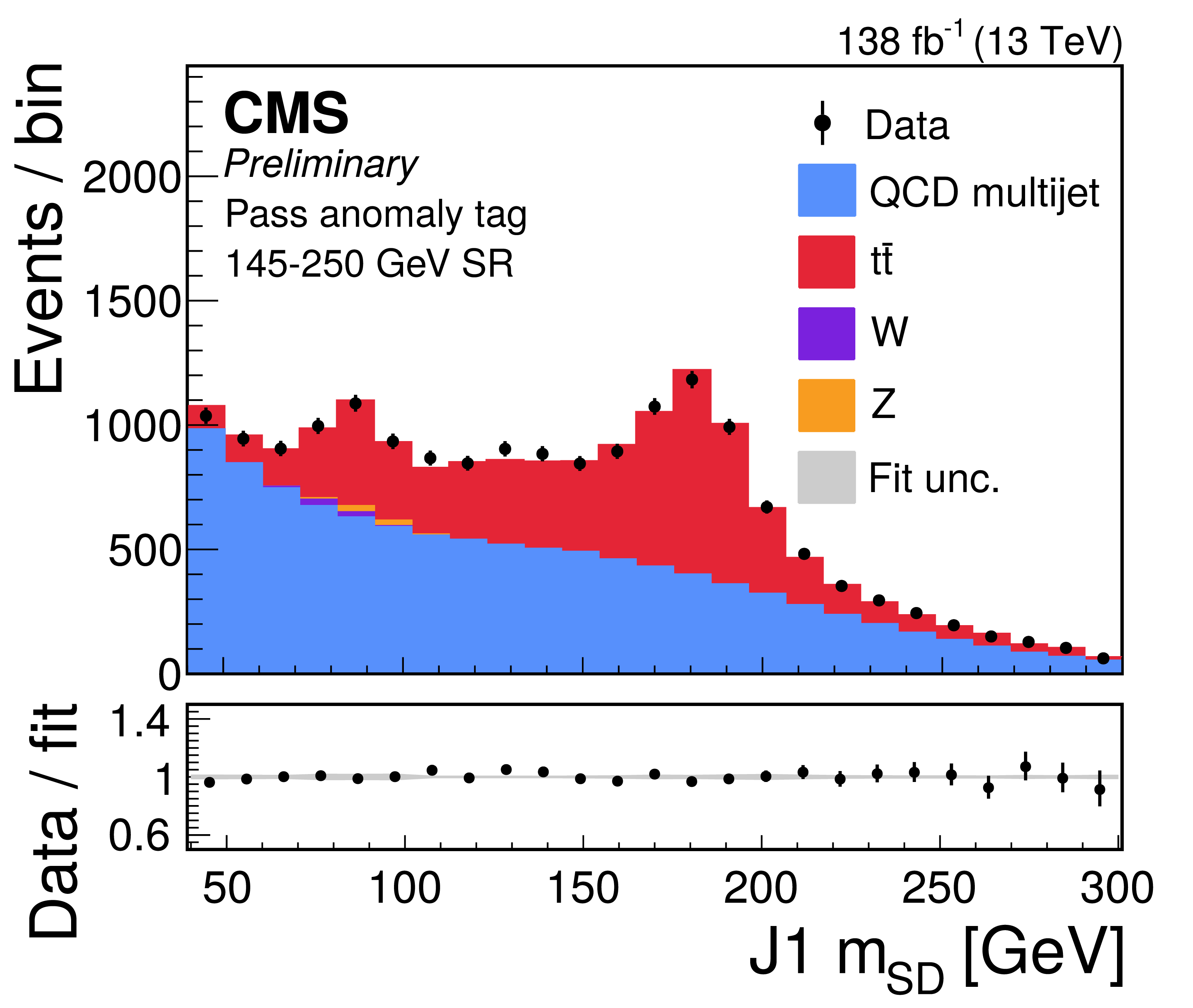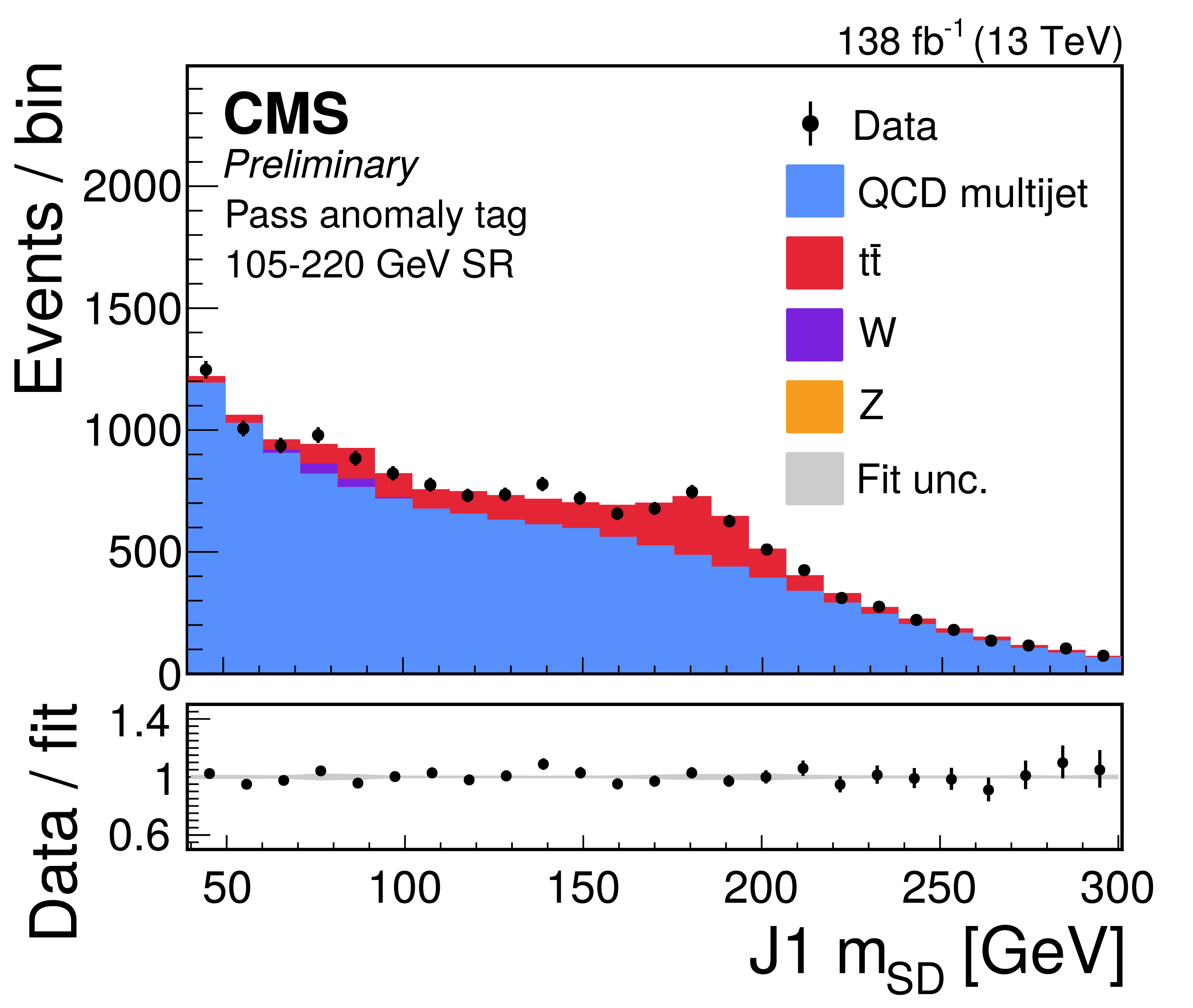 Distribution of the J2 soft-drop mass after the basic (left) and b-tagged (right) preselections. The black dots represent the data and the colored histograms correspond to simulated events. The b tagging preselection increases the relative contribution of $ \mathrm{t} \overline{\mathrm{t}} $ (red) in the sample, but in both cases the sample is dominated by the QCD multijet background (blue). Other background processes are shown in yellow. |