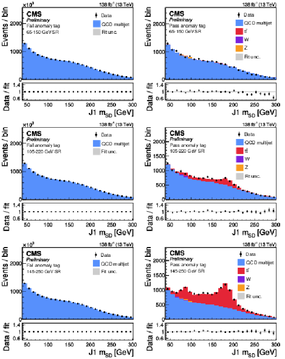 Post-fit plots of the fail (left) and pass (right) regions for the $ {\mathrm{t}\overline{\mathrm{t}}} $ extraction procedure performed for the 65-150 (upper), 105-225 (middle), and 145-250 GeV (lower). The data (black points with error bars) are compared to the fitted estimates of QCD multijet (blue), Z+jets (orange), W+jets (purple), and $ {\mathrm{t}\overline{\mathrm{t}}} $ (red). The lower panel shows the ratio between the observed data points and the fitted estimates. The gray shading denotes the systematic uncertainty. The contribution from $ {\mathrm{t}\overline{\mathrm{t}}} $ is clearly visible in the pass region of the 105-225 and 145-250 GeV signal windows. |