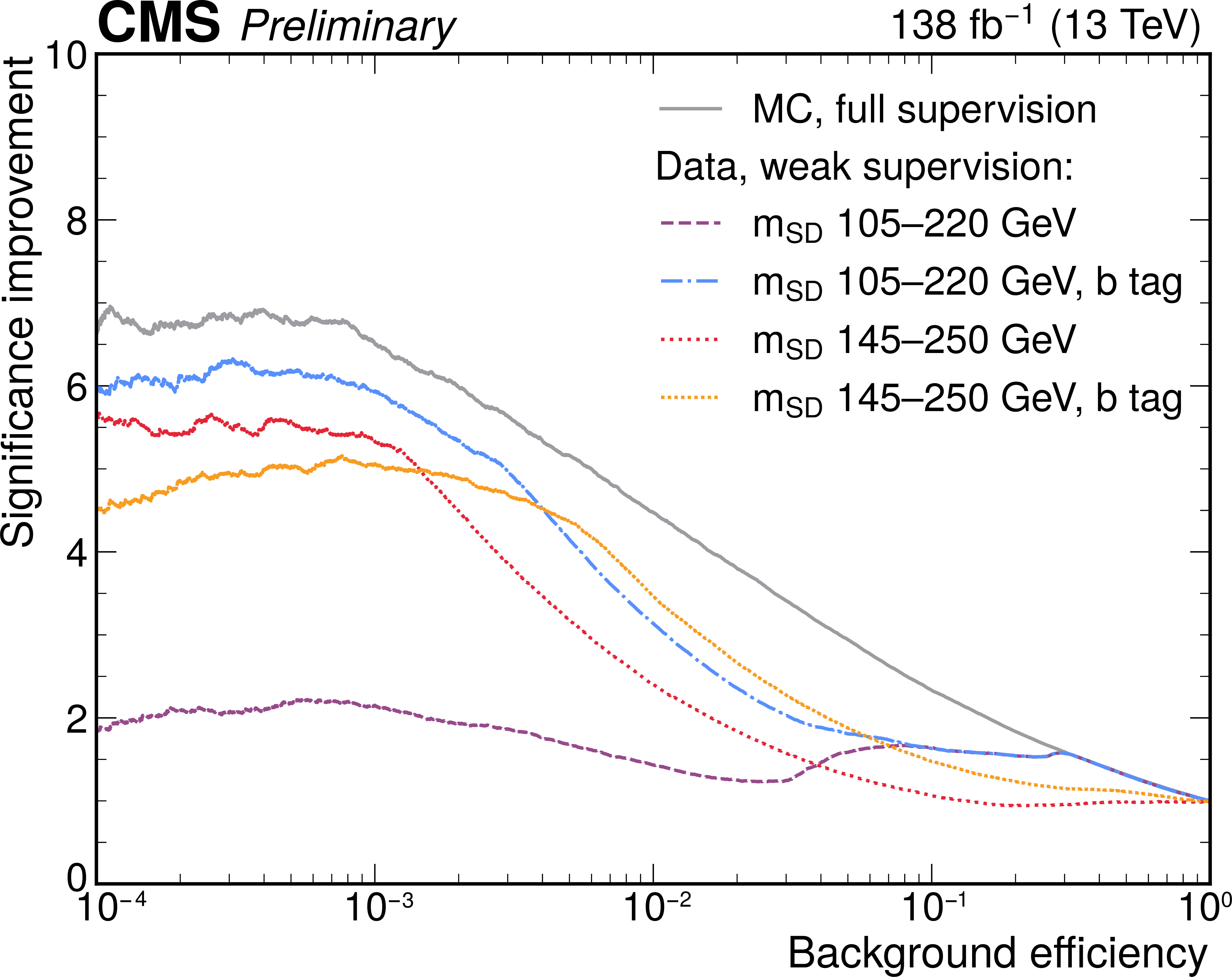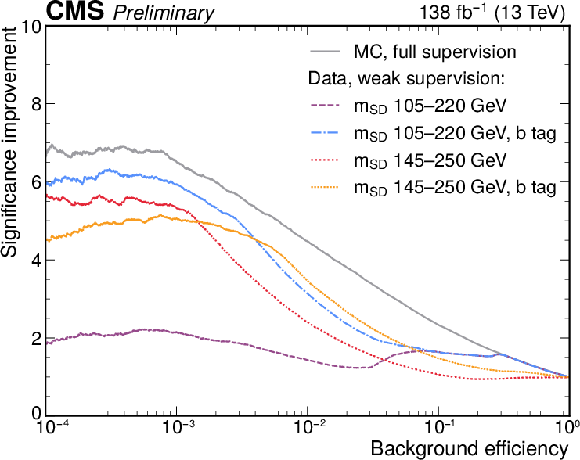 A comparison of the top identification performance of classifiers trained in different ways, evaluated in simulation. The two models trained in the 145-250 GeV mass window (red and yellow), as well as the one trained using the b tagging preselection in the in the 105-220 GeV mass window (blue), nearly match the performance of a supervised classifier (gray). The classifier trained with the baseline preselection in the 105-220 GeV mass window (purple) exhibits a smaller, yet larger than one, improvement. |