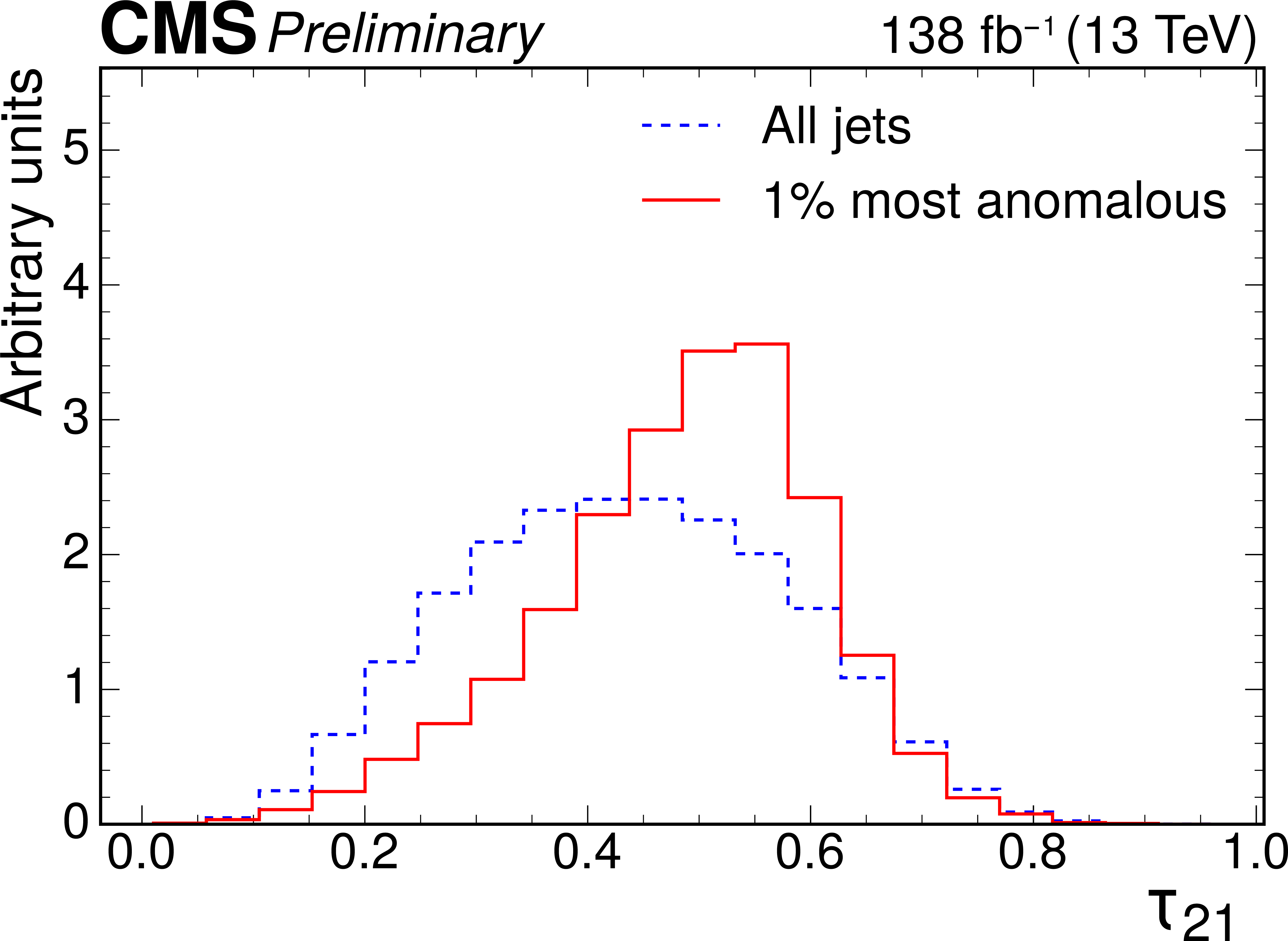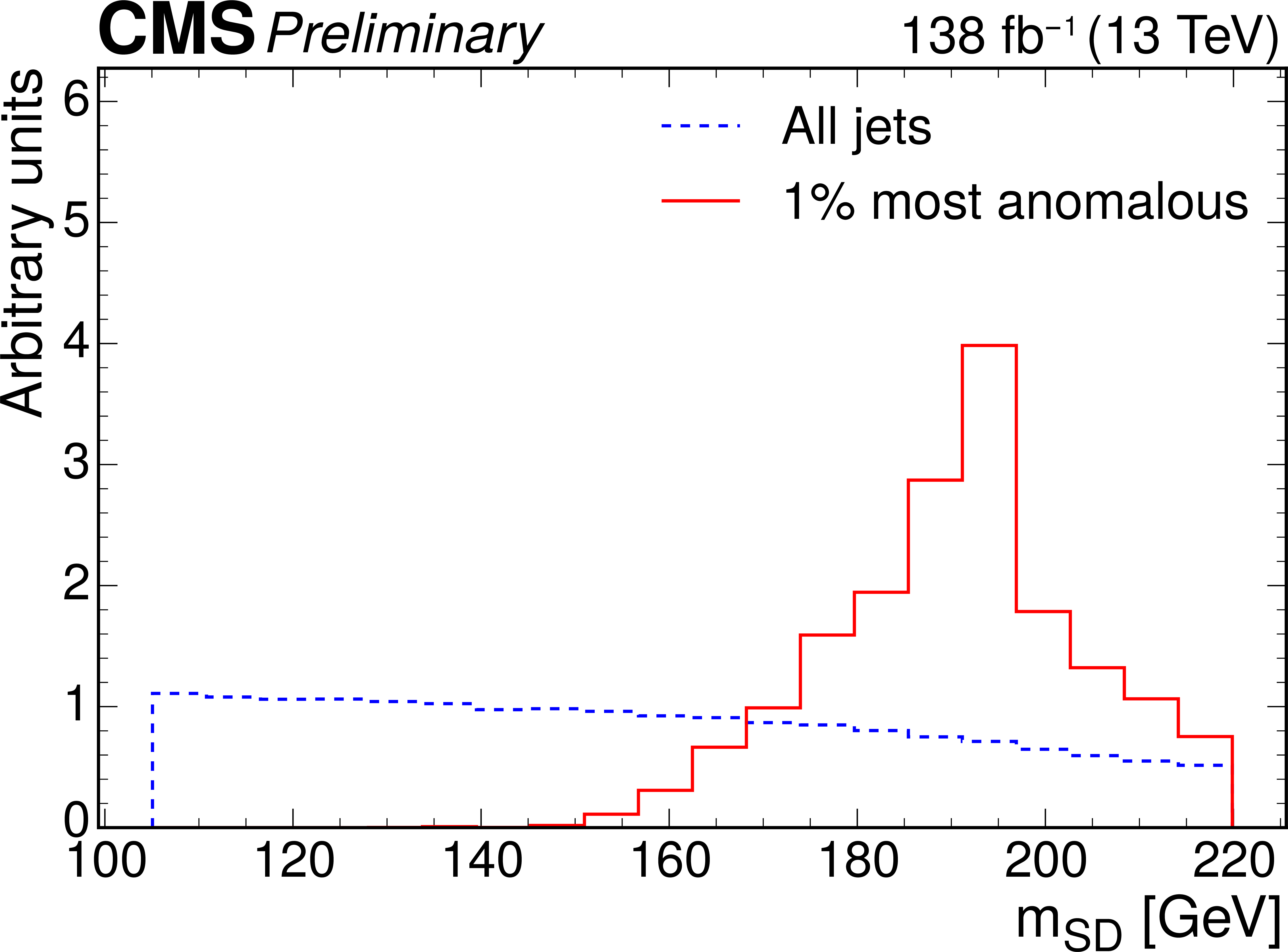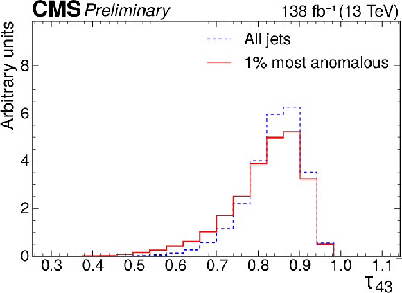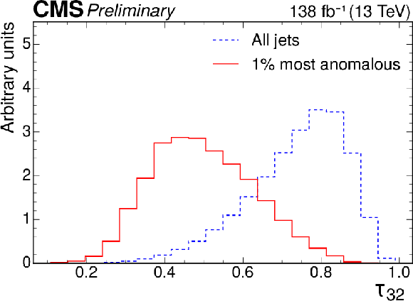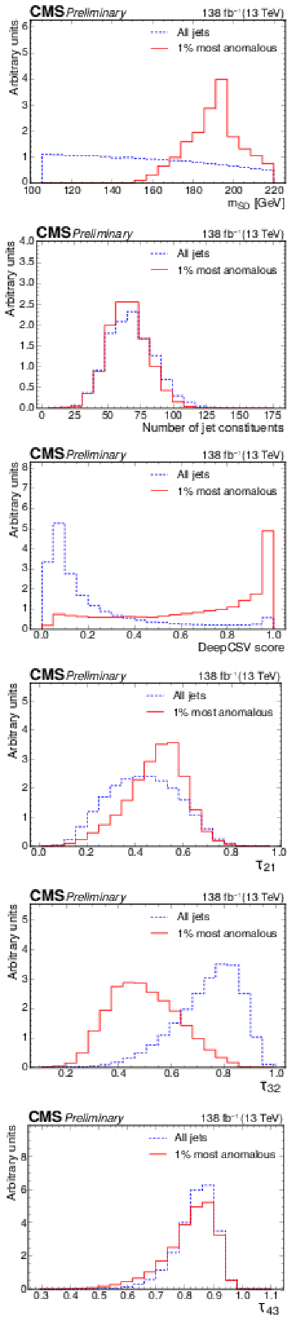 Excess interpretation example for the weakly supervised anomaly detection strategy applied to the $ \mathrm{t} \overline{\mathrm{t}} $ region with the b tagging preselection. The plots compare the properties of the jets with the highest anomaly score (red) to those for all jets in the region of the excess (blue). The variables shown are the soft-drop mass $ m_\mathrm{SD} $ (upper left), the number of jet constituents $ m_\mathrm{PF} $ (upper right), the DEEPCSV score (middle left), and the three subjettiness ratios $ \tau_{21} $ (middle right), $ \tau_{32} $ (lower left), and $ \tau_{43} $ (lower right). The three-pronged nature of the signal is clear from the low $ \tau_{32} $ scores, the presence of b tags from the high DEEPCSV score, and the jet mass ($ m_\mathrm{SD} $) distribution peaking at 175 GeV indicates the top quark mass. |