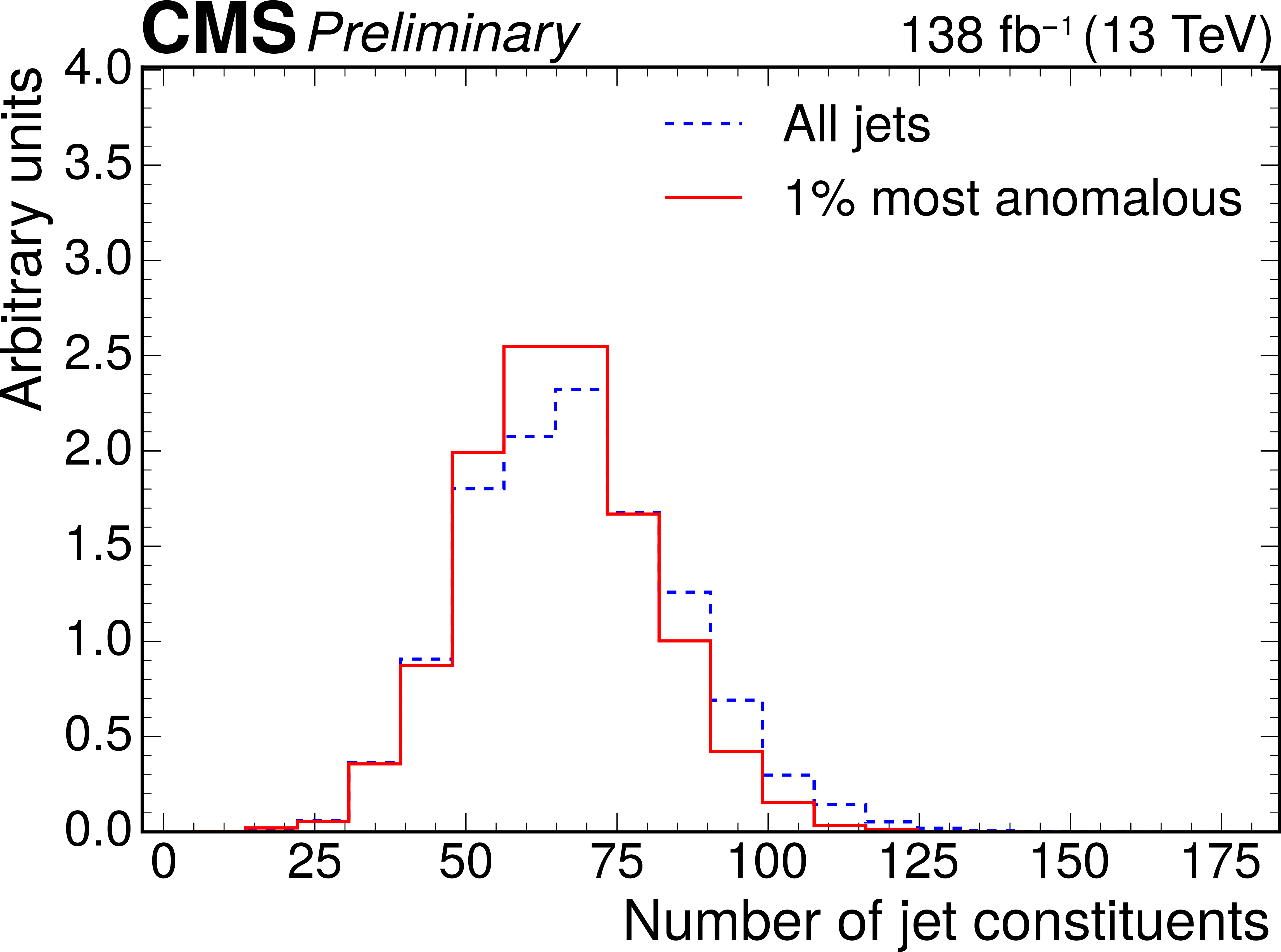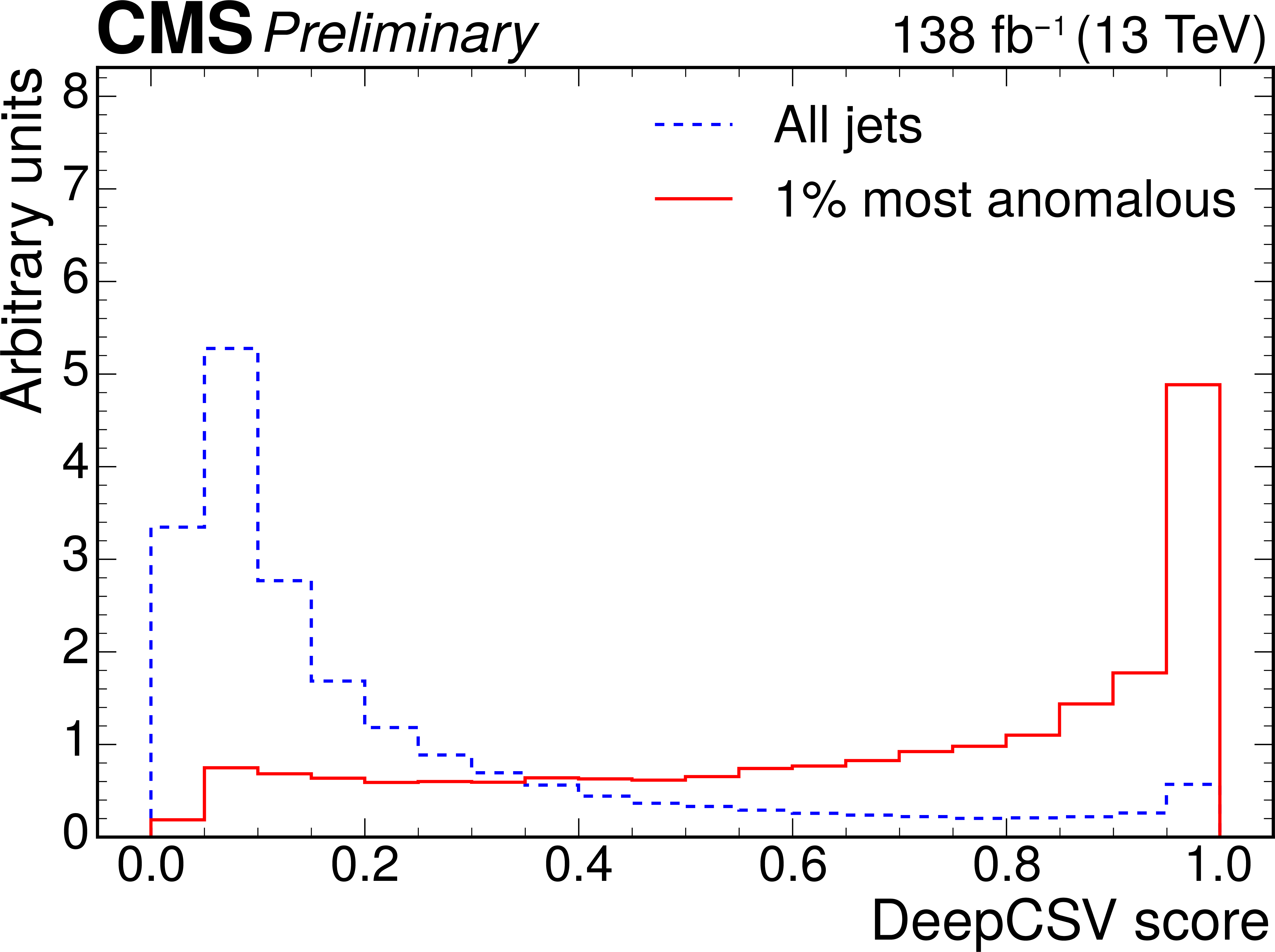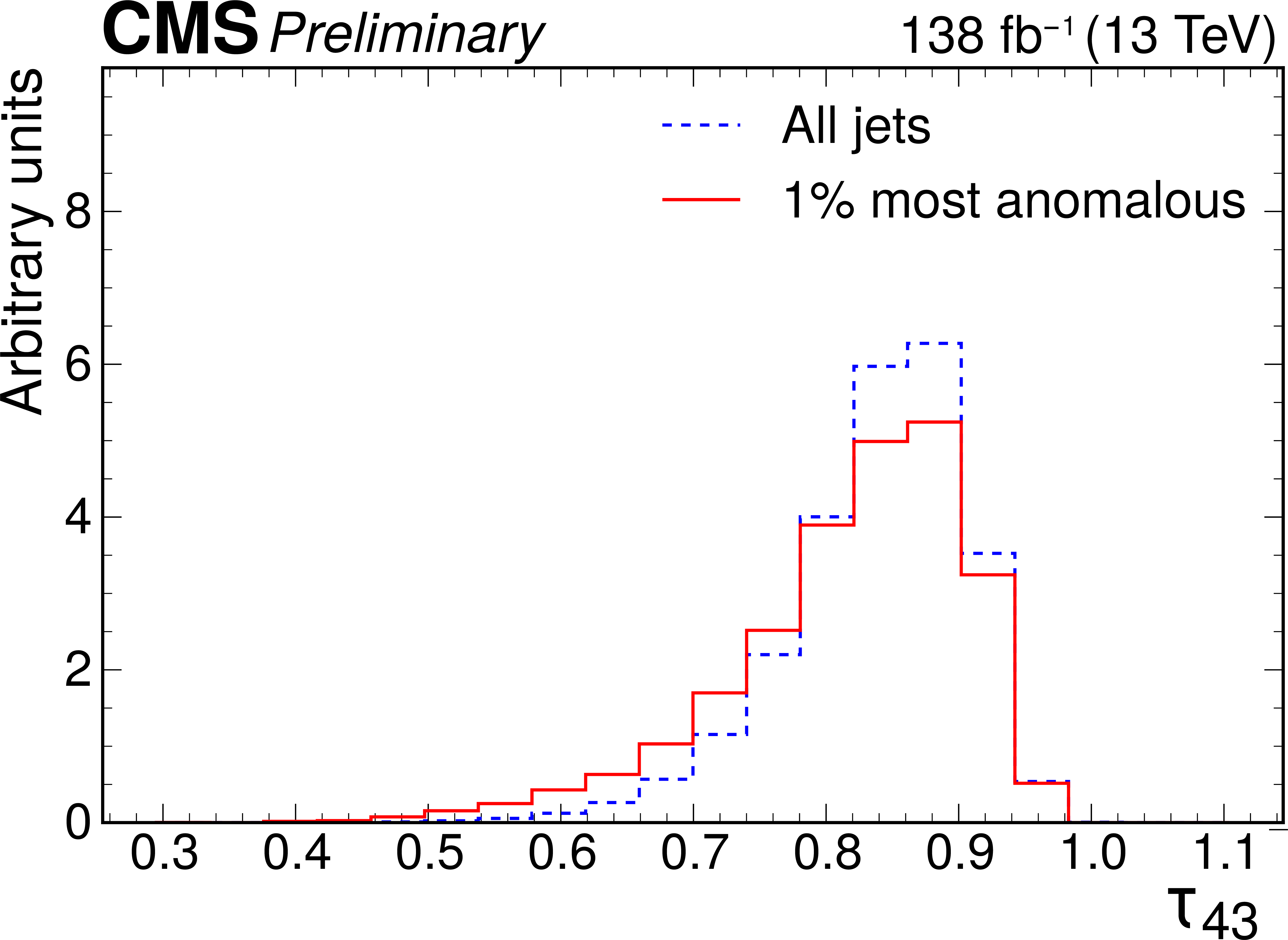 Excess interpretation example for the weakly supervised anomaly detection strategy applied to the $ \mathrm{t} \overline{\mathrm{t}} $ region with the b tagging preselection. The plots compare the properties of the jets with the highest anomaly score (red) to those for all jets in the region of the excess (blue). The variables shown are the soft-drop mass $ m_\mathrm{SD} $ (upper left), the number of jet constituents $ m_\mathrm{PF} $ (upper right), the DEEPCSV score (middle left), and the three subjettiness ratios $ \tau_{21} $ (middle right), $ \tau_{32} $ (lower left), and $ \tau_{43} $ (lower right). The three-pronged nature of the signal is clear from the low $ \tau_{32} $ scores, the presence of b tags from the high DEEPCSV score, and the jet mass ($ m_\mathrm{SD} $) distribution peaking at 175 GeV indicates the top quark mass. |