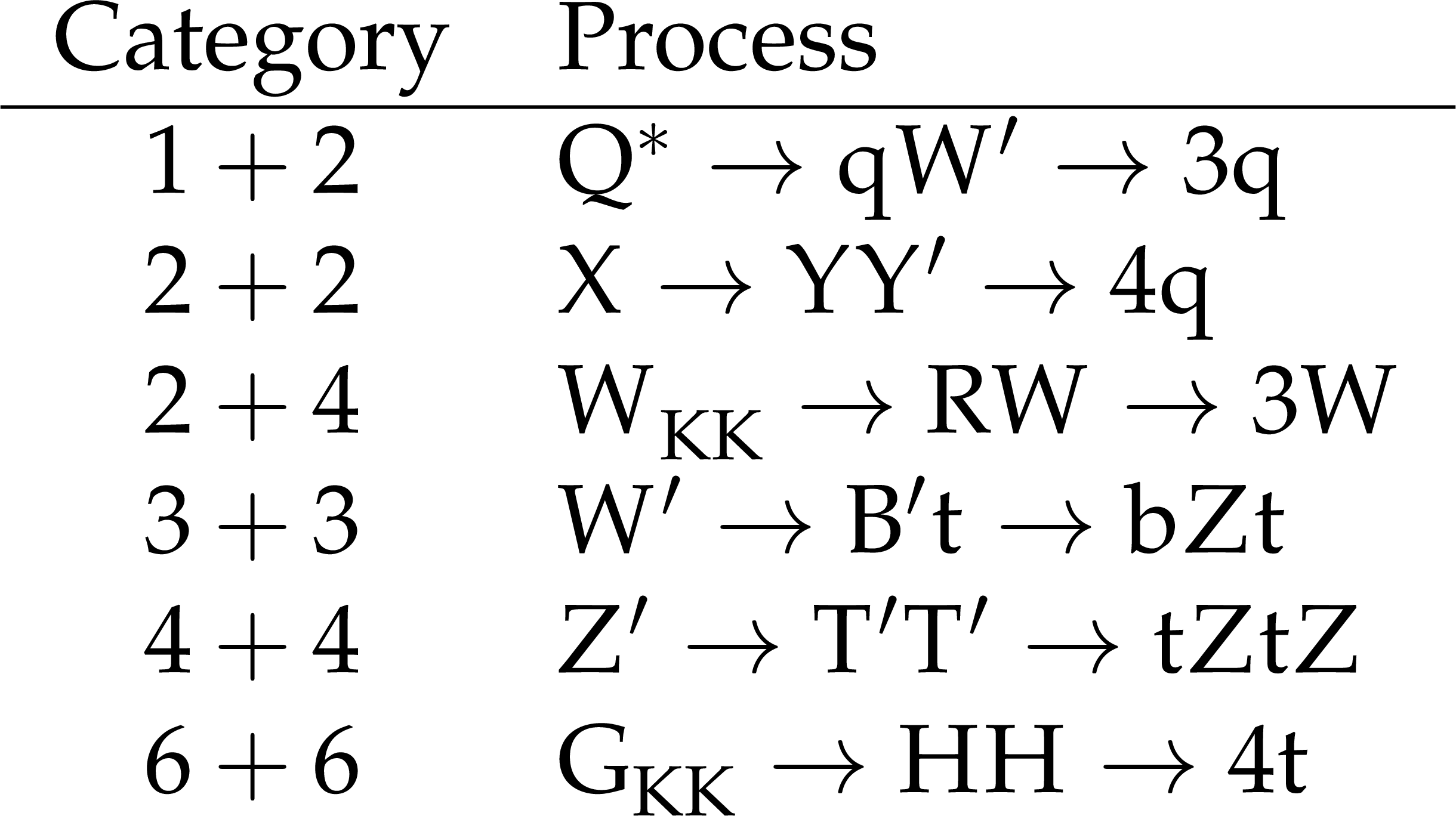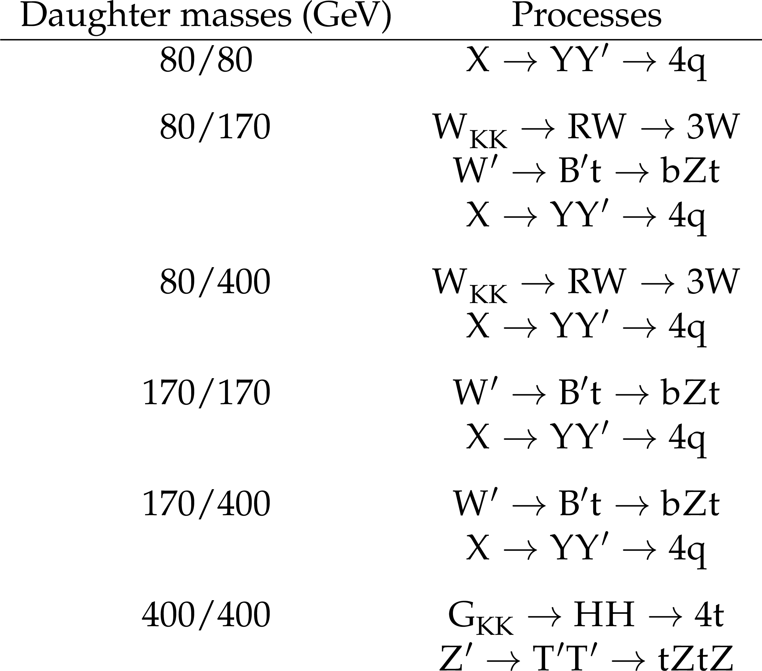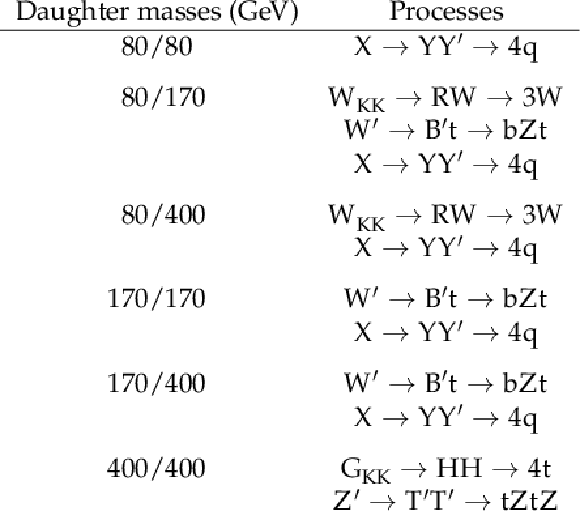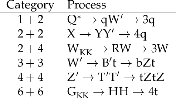 Signal processes considered in the analysis, categorized according to the number of partons produced in the decay of each jet. |