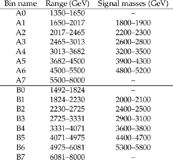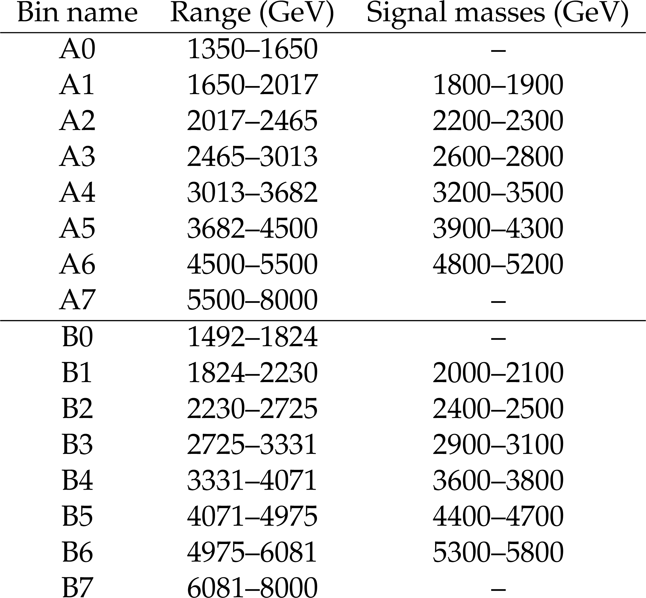 Mass regions used by the weakly supervised methods and resonance masses considered with each bin. Signal regions are required to have sideband mass regions on either side for reliable background estimation. This means only the A1-A6 and B1-B6 regions are used to seek signals, with the A0, B0, A7, and B7 regions used solely as sideband control regions. |