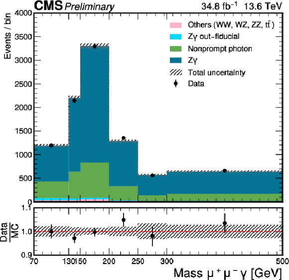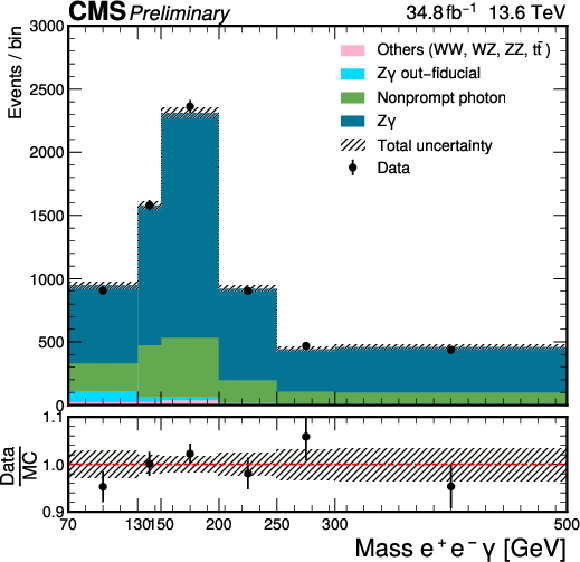 | Abstract: A measurement of the $ Z\gamma $ production cross section in proton-proton collisions at a center-of-mass energy of 13.6 TeV using the leptonic final states is presented. A data set corresponding to an integrated luminosity of 34.8 fb$ ^{-1} $, collected by the CMS experiment at the LHC in 2022 is used. Events with an oppositely charged pair of muons or electrons together with an isolated photon are selected. The measured fiducial cross section for the combined muon and electron channels is 1.896 $ \pm $ 0.006 (th) $\pm$ 0.054 (syst) $\pm$ 0.033 (stat) pb. | ||