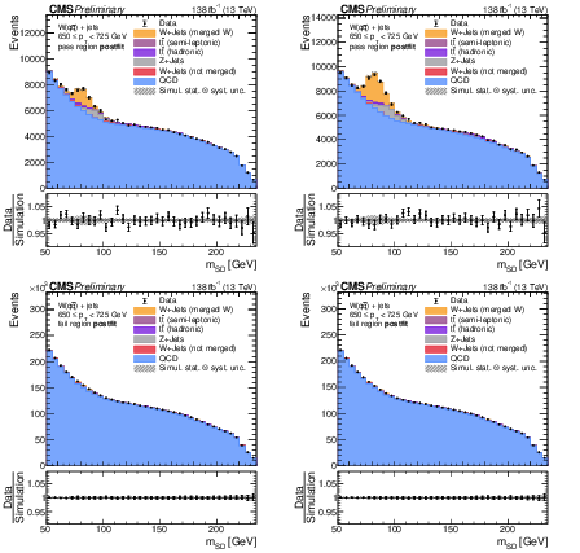 Reconstructed $ m_\mathrm{SD}^\mathrm{reco} $ distributions in the second $ p_{\mathrm{T}}^\mathrm{reco} $ bin with 650 $ < p_{\mathrm{T}}^\mathrm{reco} \leq $ 725 GeV in the signal (upper row) and control (lower row) regions defined using the $ N_{2}^{(1),\mathrm{DDT}} $ (left) and $ P^{\mathrm{PN, DDT}}_{\mathrm{W vs. QCD}} $ (right) taggers. All four data-taking periods (early 2016, late 2016, 2017, and 2018) are combined, resulting in a total integrated luminosity of 138 fb$ ^{-1} $. |
