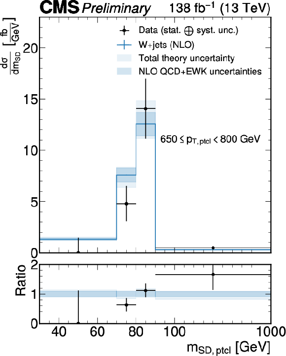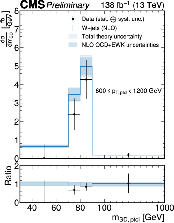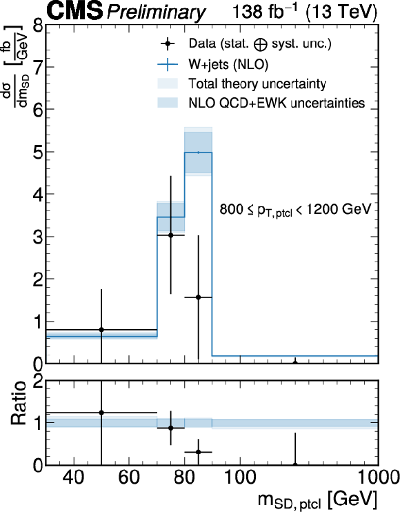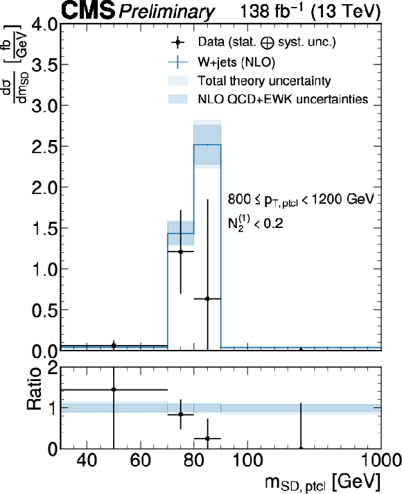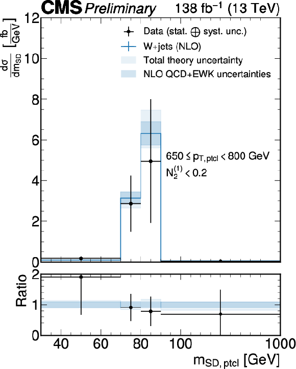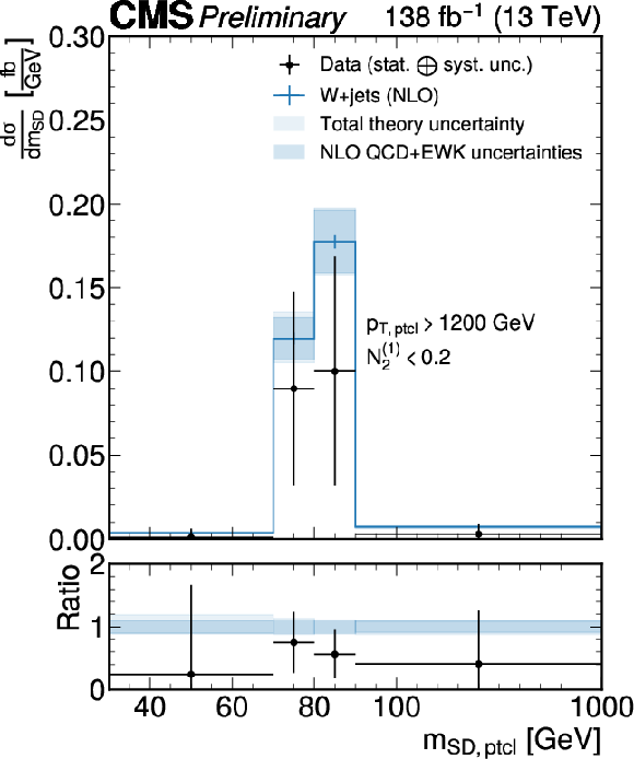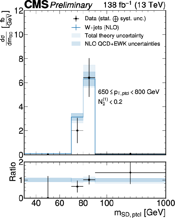 Unfolded jet mass distribution at the particle level for each $ p_{\mathrm{T}}^\mathrm{ptcl} $ bin obtained with $ P^{\mathrm{PN, DDT}}_{\mathrm{W vs. QCD}} $. The fiducial measurement region at the particle level includes the $ N_{2}^{(1)} < $ 0.2 selection. The unfolded data are shown as black markers, the blue lines show the predictions from MadGraph-5_aMC@NLO+PYTHIA at LO with MLM matching and supplemented by NLO QCD and EWK corrections. The theory uncertainty is the sum in quadrature of parton shower variations and the hadronization model uncertainty, as well as the uncertainties in the QCD and EW corrections, and is drawn as a light shaded blue band. The purely perturbative uncertainties are overlaid as a dark, shaded blue band. |