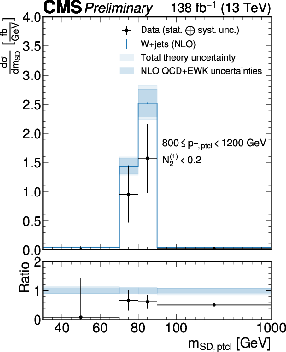 Jet mass distribution of the sum of all $ p_{\mathrm{T}}^\mathrm{ptcl} $ bins resulting from the unfolding using ParticleNet$ ^\mathrm{DDT} $ tagger without (left) and with (right) inclusion of a $ N_{2}^{(1)} < $ 0.2 cut at particle-level, with matching to a W boson in the particle-level definition. The unfolded data is shown as black markers, the blue line shows the true distribution from the simulation with theory uncertainties added as the shaded blue band. The matching to a W boson further removes contributions to the cross section where the jet originates from a quark or gluon recoiling against the W boson and, resulting in reduced shower and hadronization uncertainties. |