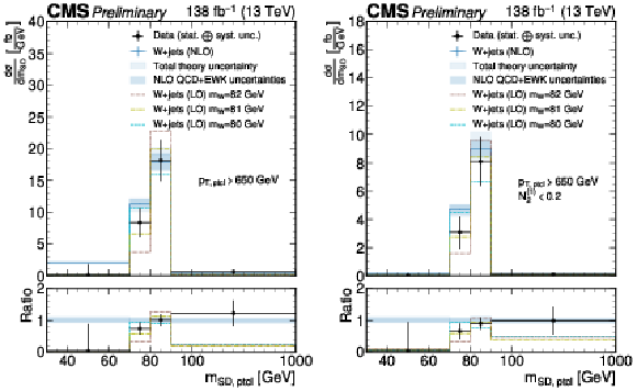 Unfolded jet mass distribution at the particle level for $ p_{\mathrm{T}}^\mathrm{ptcl} > $ 650 GeV, obtained by summing all $ p_{\mathrm{T}}^\mathrm{ptcl} $ bins. The results are obtained using the PARTICLENET} ^\MATHRM{DDT tagger without (left) and with (right) the $ N_{2}^{(1)} < $ 0.2 selection at the particle level without matching to a W boson in the particle-level definition. The unfolded data are shown as black markers. The blue lines show the predictions from MadGraph-5_aMC@NLO+PYTHIA at LO with MLM matching and supplemented by NLO QCD and EWK corrections. The theory uncertainty is the sum in quadrature of parton shower variations and the hadronization model uncertainty, as well as the uncertainties in the QCD and EW corrections, and is drawn as a light shaded blue band. The purely perturbative uncertainties are overlaid as a dark, shaded blue band. Predictions with different values of the W boson mass generated with PYTHIA at LO and scaled to match the total number of events in data are overlaid. |