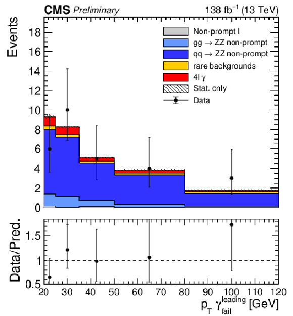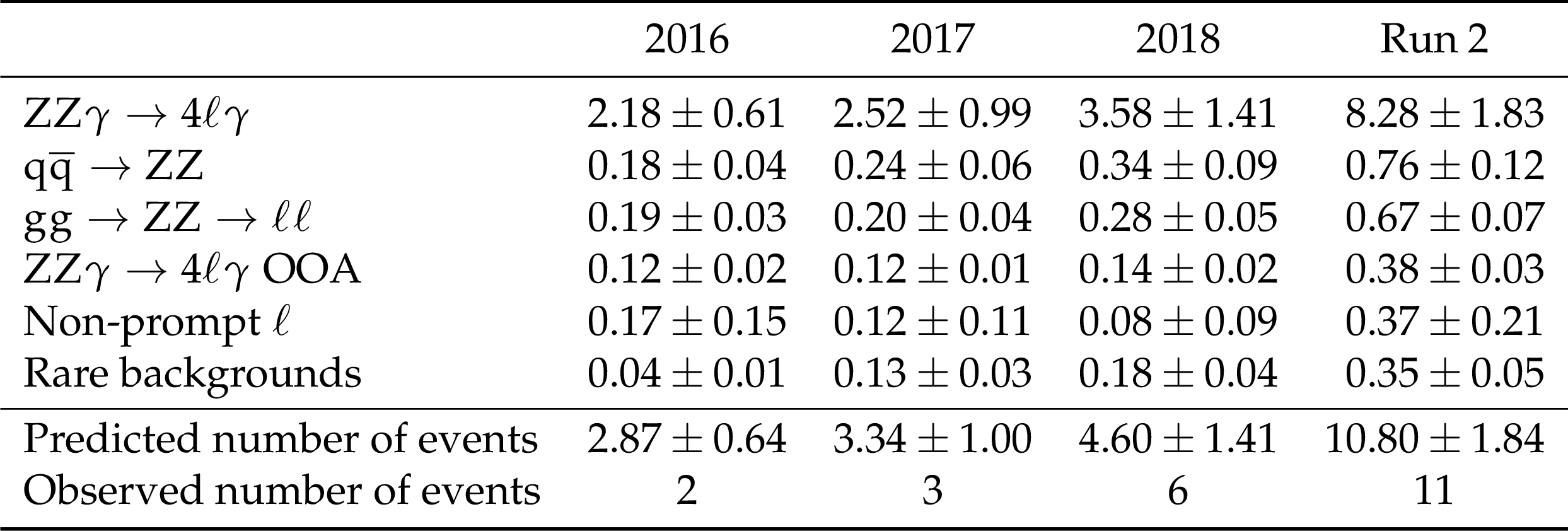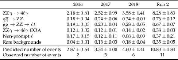 Post-fit yields in the triboson $ \mathrm{Z}\mathrm{Z}\gamma $ region. The uncertainties shown are the statistical uncertainties from the simulated samples and the data-driven non-prompt leptons background. The row labelled '$ \mathrm{Z}\mathrm{Z}\gamma\to4\mathrm{l}\gamma $ OOA (out-of-acceptance)' indicates the number of events in the signal sample that fail the fiducial selection. |