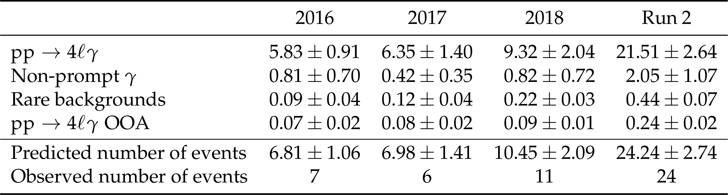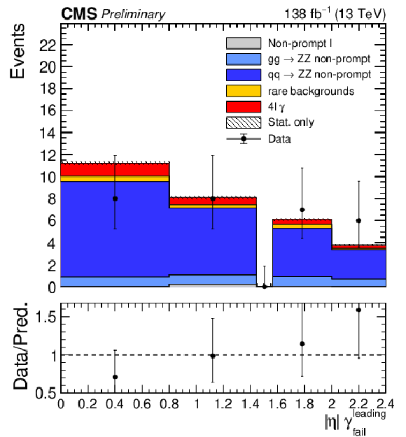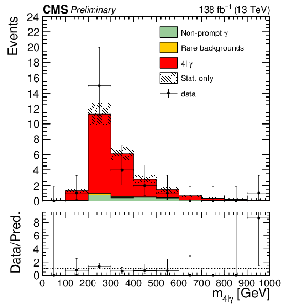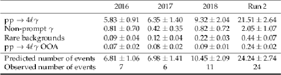 Post-fit yields in the inclusive 4$ \mathrm{l}\gamma $ region. The uncertainties shown are the statistical uncertainties from the simulated samples and the data-driven non-prompt photons background. The row labelled '$ \mathrm{p}\mathrm{p}\to4\mathrm{l}\gamma $ OOA (out-of-acceptance)' indicates the number of events in the signal sample that fail the fiducial selection. |