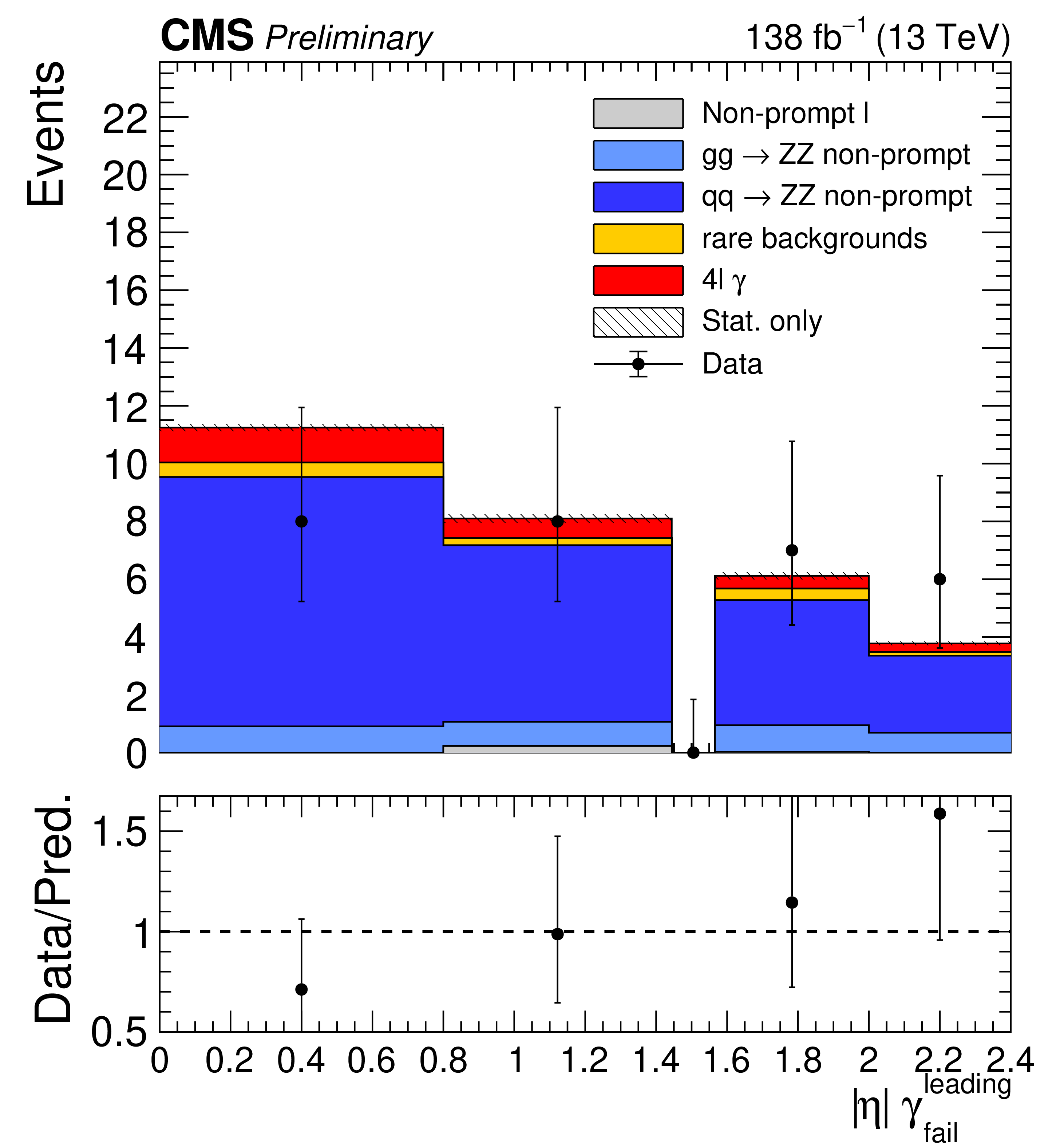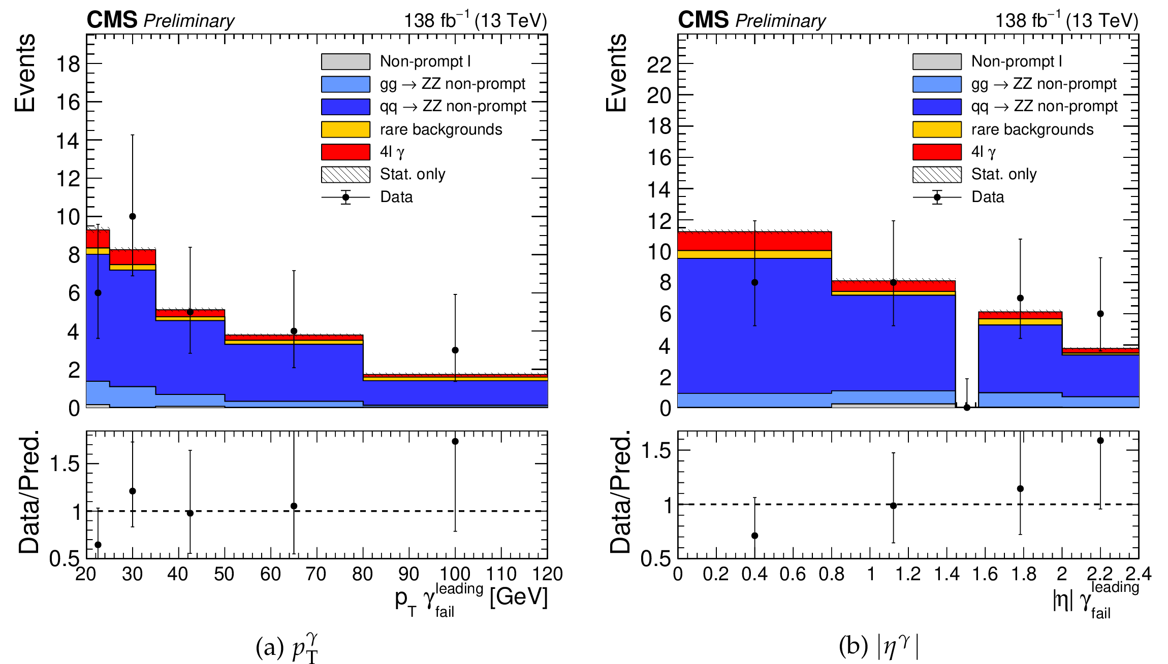 Momentum (left) and pseudorapidity (right) of the leading photon passing the loose selection and failing the tight cut-based ID in the non-prompt photon application region with four tight leptons. |