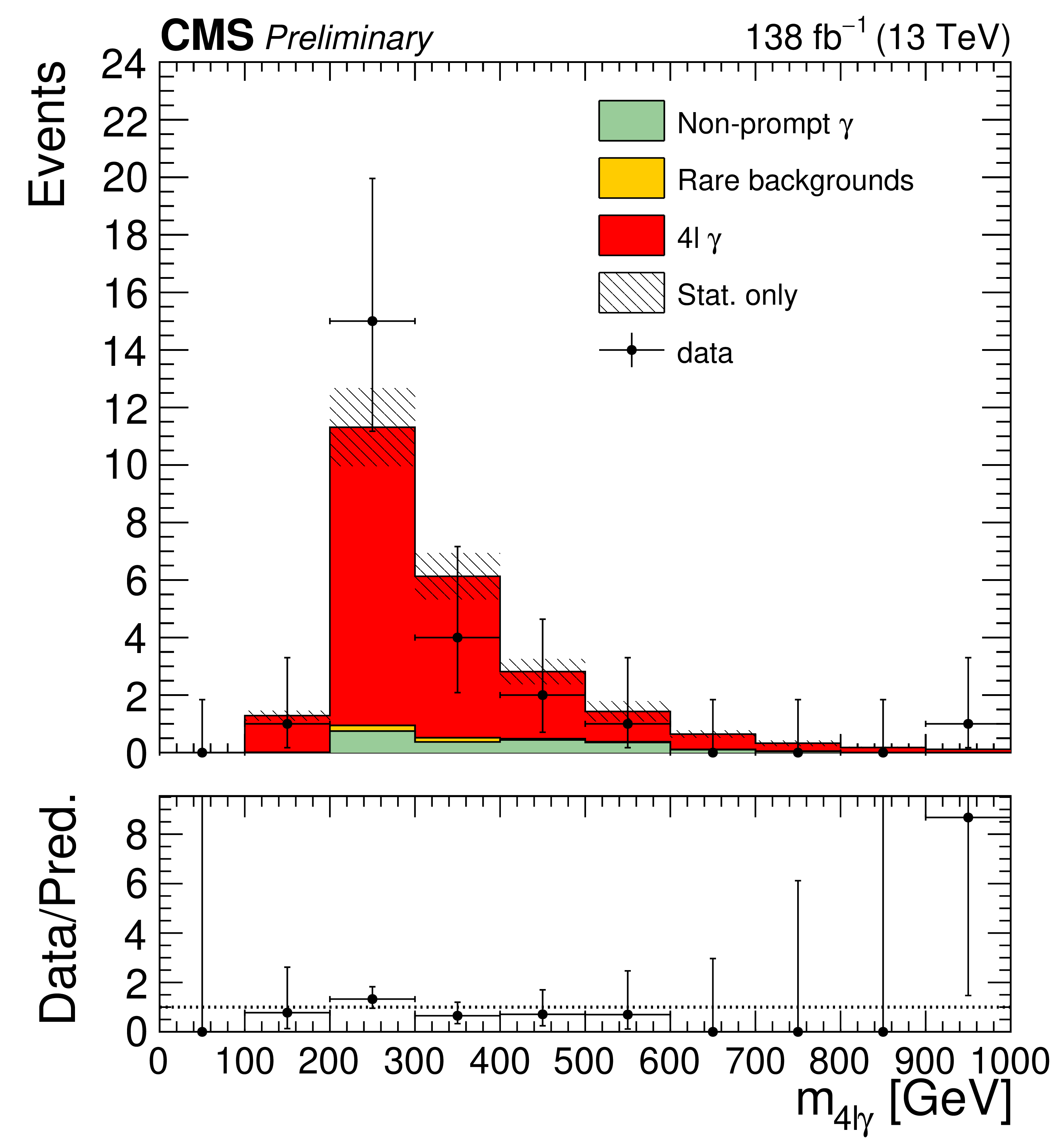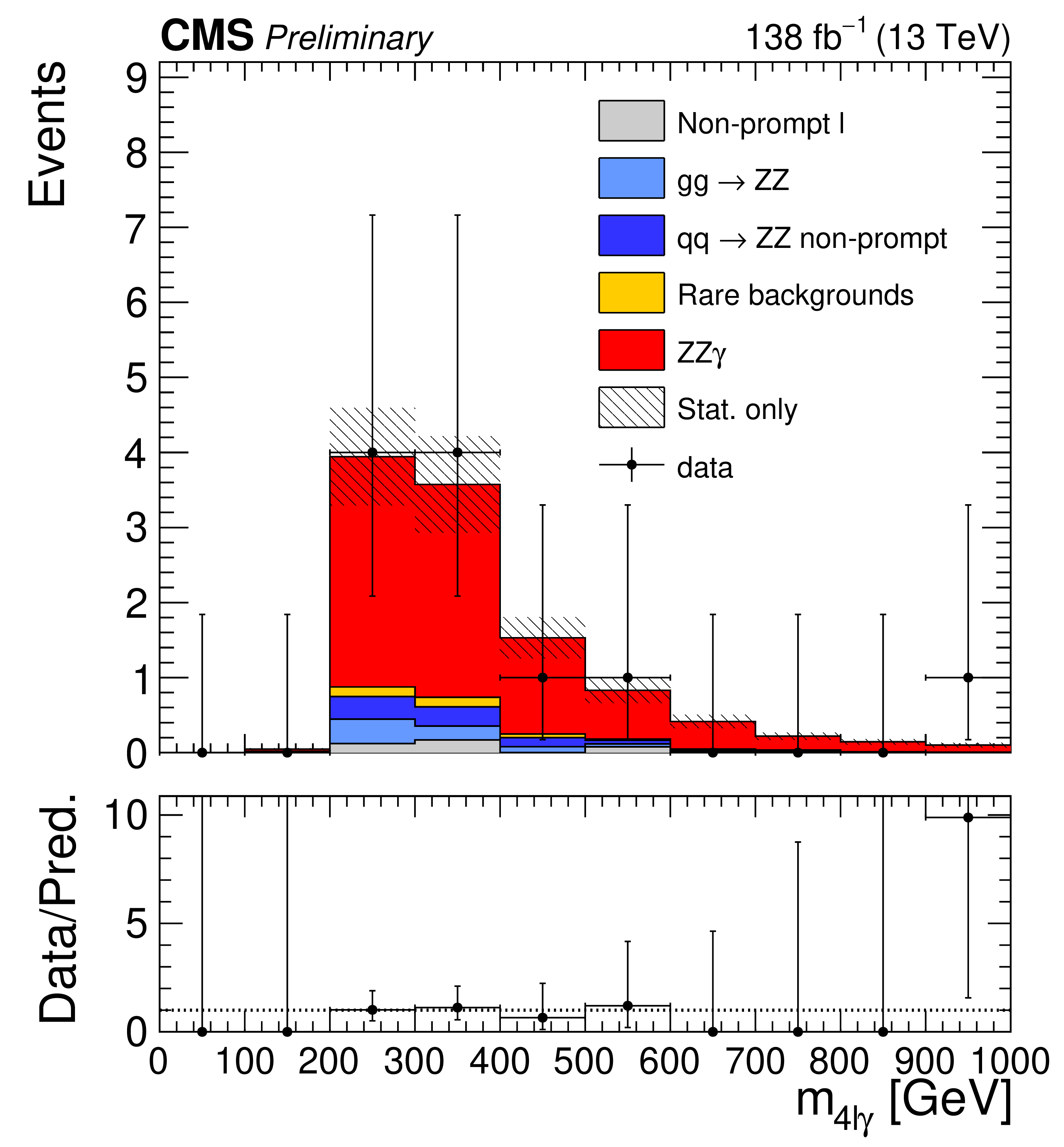 DataMC{mass of the $ \mathrm{Z}\mathrm{Z}\gamma $ system}{inclusive $ \mathrm{p}\mathrm{p}\to4\mathrm{l}\gamma $ cut-basedd |