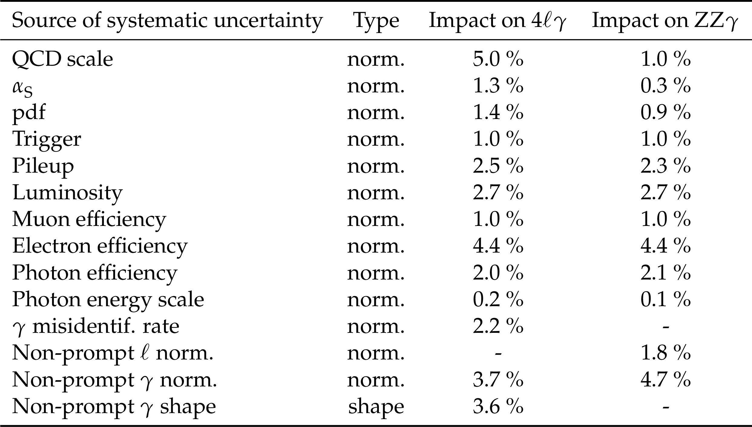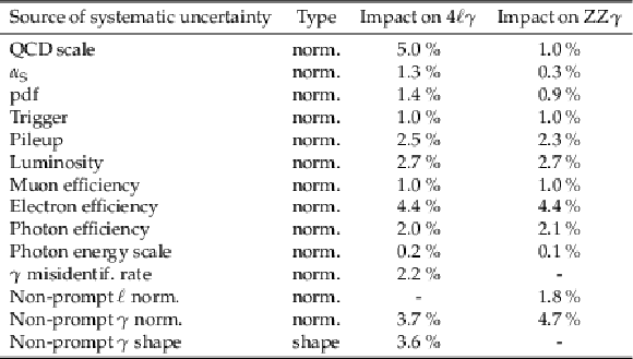 Sources of systematic uncertainty and their impact on the cross section measurement for the inclusive $ \mathrm{p}\mathrm{p}\to4\mathrm{l}\gamma $ final state and for the triboson $ \mathrm{Z}\mathrm{Z}\gamma $ final state. |