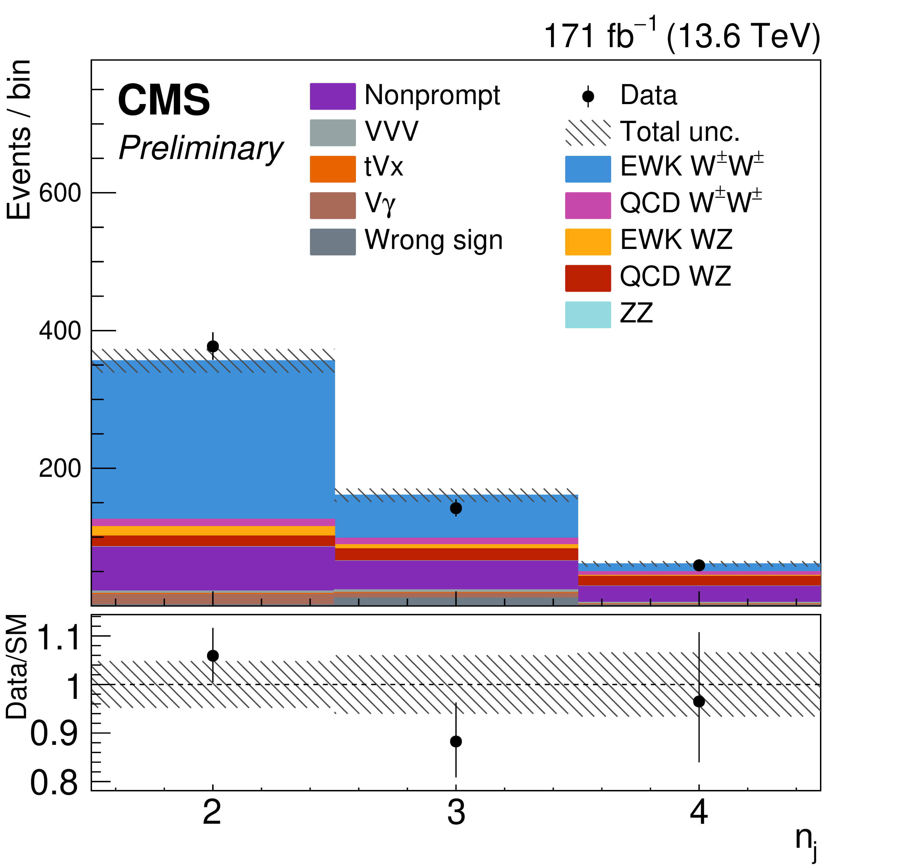 Distributions of $ m_{\mathrm{j}\mathrm{j}} $ (upper left), $ m_{\ell\ell} $ (upper right), $ \Delta\eta_{\mathrm{j}\mathrm{j}} $ (center left), $ \Delta\phi_{\mathrm{j}\mathrm{j}} $ (center right), and $ N_{\mathrm{j}} $ (lower) in the $ \mathrm{W}^\pm\mathrm{W}^\pm $ SR. The predicted yields are shown with their best fit normalizations from the simultaneous fit. Vertical bars on data points represent the statistical uncertainty in the data. The histograms for $ \mathrm{t}\mathrm{V}\mathrm{x} $ backgrounds include the contributions from $ {\mathrm{t}\overline{\mathrm{t}}} \mathrm{V} $ and $ \mathrm{t}\mathrm{Z}\mathrm{q} $ processes. The histograms for the wrong-sign background include the contributions from oppositely charged dilepton final states. The overflow is included in the last bin. The bottom panel shows the ratio of the number of events observed in data to that of the total SM prediction. The gray bands represent the uncertainties in the predicted yields. |
