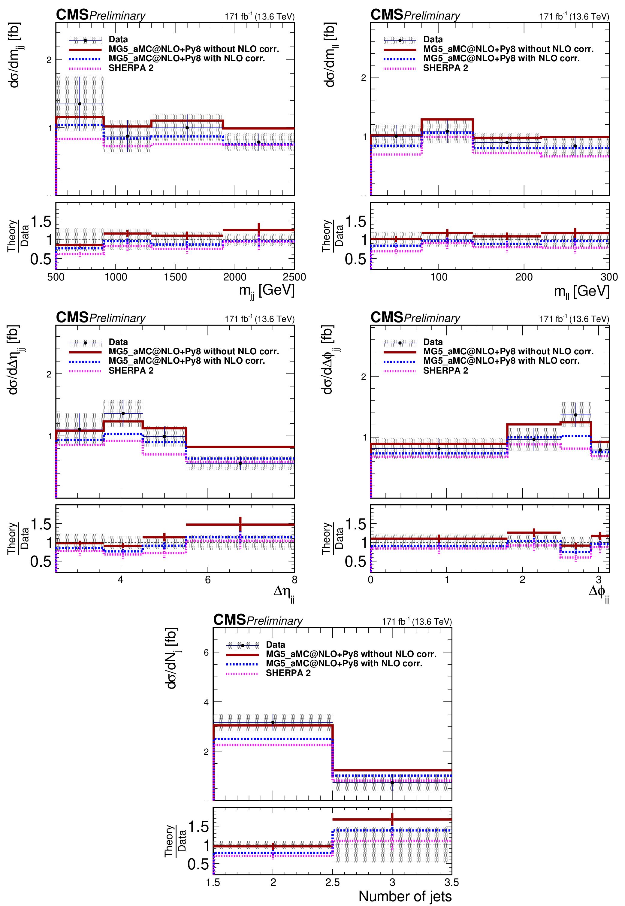Measured and predicted absolute EW $ \mathrm{W}^\pm\mathrm{W}^\pm $ cross sections in bins of $ m_{\mathrm{j}\mathrm{j}} $ (upper left), $ m_{\ell\ell} $ (upper right), $ \Delta\eta_{\mathrm{j}\mathrm{j}} $ (center left), $ \Delta\phi_{\mathrm{j}\mathrm{j}} $ (center right), and $ N_{\mathrm{j}} $ (lower). The ratios of the predictions to the data are also shown. The measurements are compared with the predictions from the MadGraph-5\_aMC@NLO and SHERPA generators. The shaded bands around the data points correspond to the measurement uncertainty. The error bars around the predictions correspond to the combined statistical, PDF, and scale uncertainties. Predictions without applying the $ \mathcal{O}(\alpha_\mathrm{S}\alpha^6) $ and $ \mathcal{O}(\alpha^7) $ corrections to the MadGraph-5\_aMC@NLO LO cross sections, as described in the text, are also shown. |