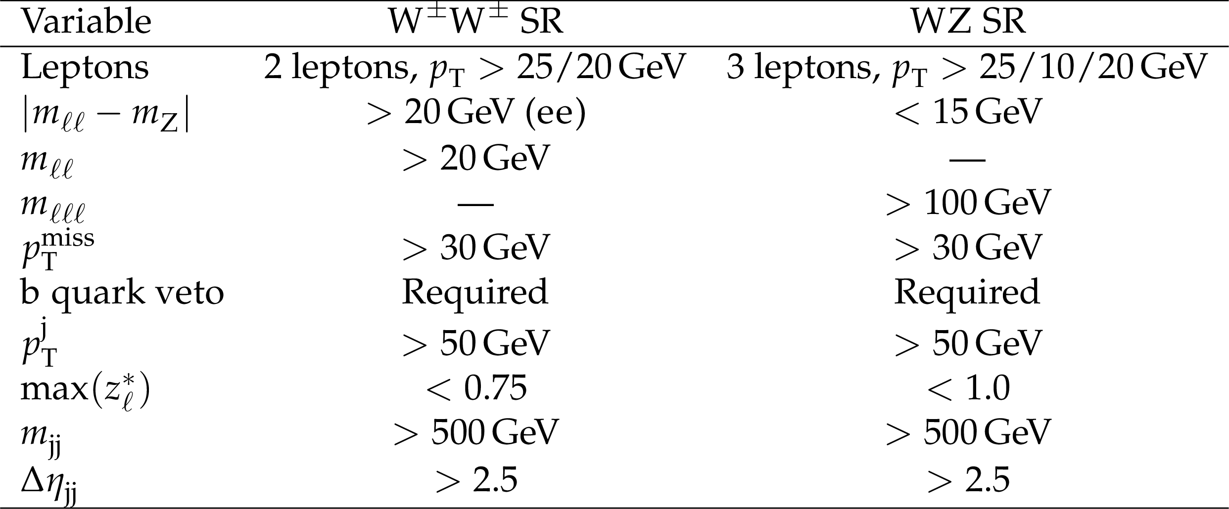 Selection criteria defining the $ \mathrm{W}^\pm\mathrm{W}^\pm $ and WZ SRs. The third lepton in the WZ selection refers to the single lepton from the decay of the W boson. The $ |m_{\ell\ell} - m_{\mathrm{Z}}| $ requirement is applied to the dielectron final state only in the $ \mathrm{W}^\pm\mathrm{W}^\pm $ SR. |