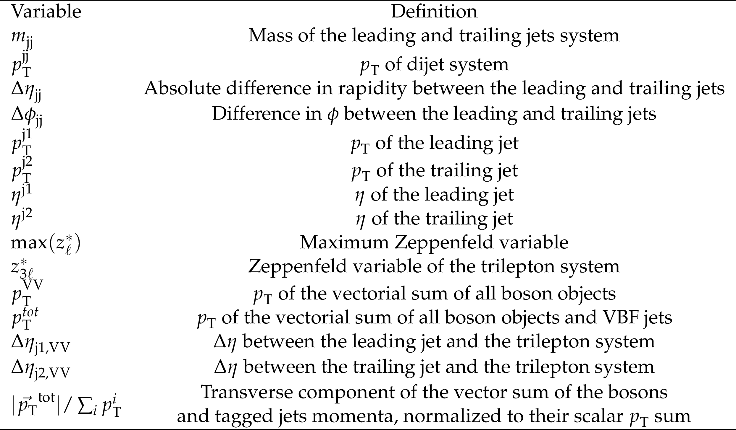 List and description of the input variables to the BDT used in the WZ SR. The Zeppenfeld variable is defined in Eq. (1), where $ \eta $ refers either to a single lepton or to the trilepton system. |