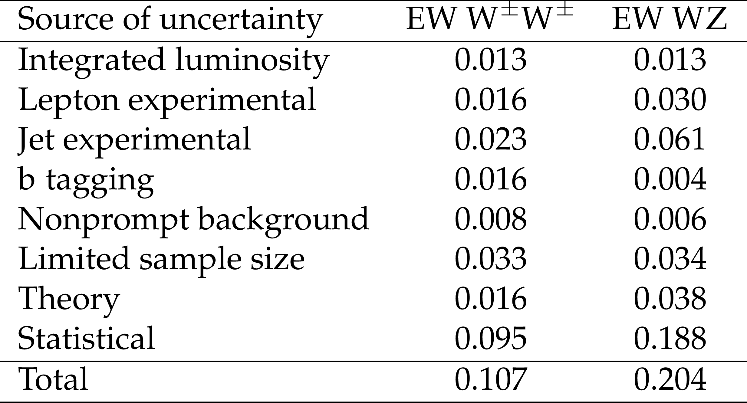 Systematic uncertainties in the signal strength $ \mu $, defined as the measured inclusive EW cross sections divided by the predicted cross sections. Lepton experimental uncertainties encompass the effects of the calibration of lepton momentum scale and resolution, as well as lepton trigger, reconstruction, identification, and isolation efficiencies. Jet experimental uncertainties encompass the effects of JES and JER. The limited sample size refers to the finite number of MC and data events used to estimate the backgrounds. |