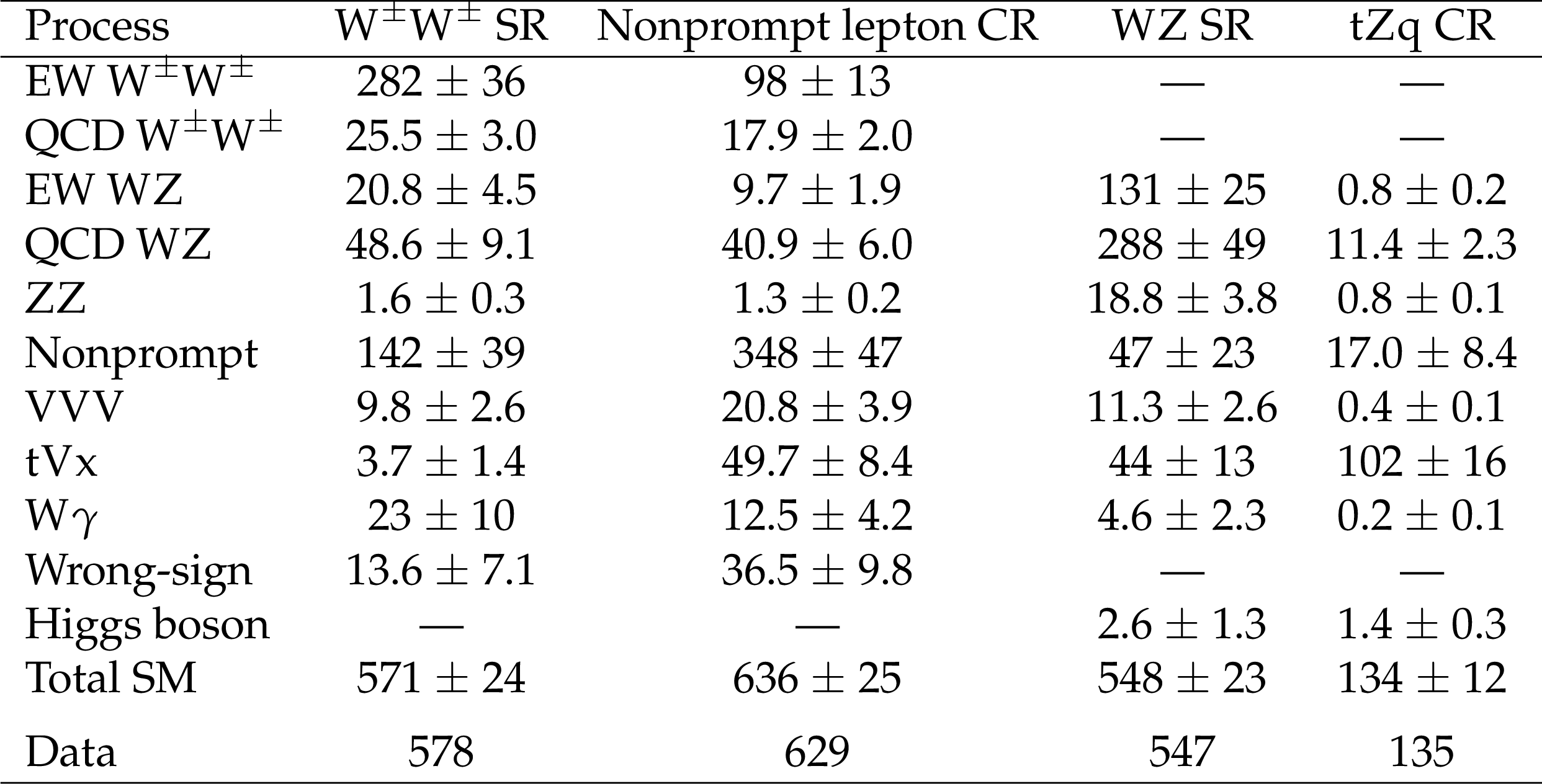 Expected yields from SM processes and observed data events in the $ \mathrm{W}^\pm\mathrm{W}^\pm $ SR, nonprompt lepton CR, WZ SR, and $ \mathrm{t}\mathrm{Z}\mathrm{q} $ CR. The combination of the statistical and systematic uncertainties is indicated. The expected yields are shown with their best fit normalizations from the simultaneous fit to the data. |