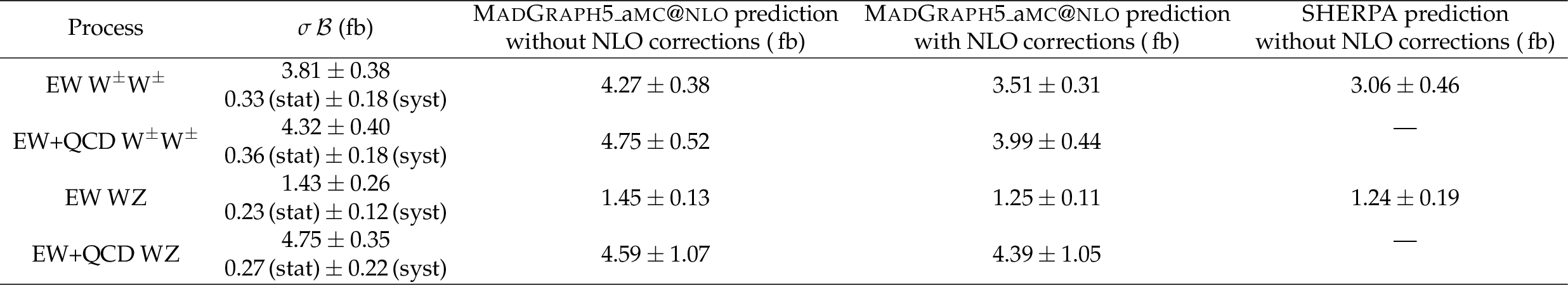 The measured inclusive cross sections for the EW $ \mathrm{W}^\pm\mathrm{W}^\pm $, EW+QCD $ \mathrm{W}^\pm\mathrm{W}^\pm $, EW WZ, and EW+QCD WZ processes, and the theoretical predictions with MadGraph-5\_aMC@NLO and SHERPA at LO. The EW processes include the corresponding interference contributions. The theoretical uncertainties include statistical, PDF, and scale uncertainties. Predictions with applying the $ \mathcal{O}(\alpha_\mathrm{S}\alpha^6) $ and $ \mathcal{O}(\alpha^7) $ corrections to the MadGraph-5\_aMC@NLO LO cross sections, as described in the text, are also shown. The predictions of the QCD $ \mathrm{W}^\pm\mathrm{W}^\pm $ and WZ processes do not include additional corrections. All reported values are in \unitfb. |