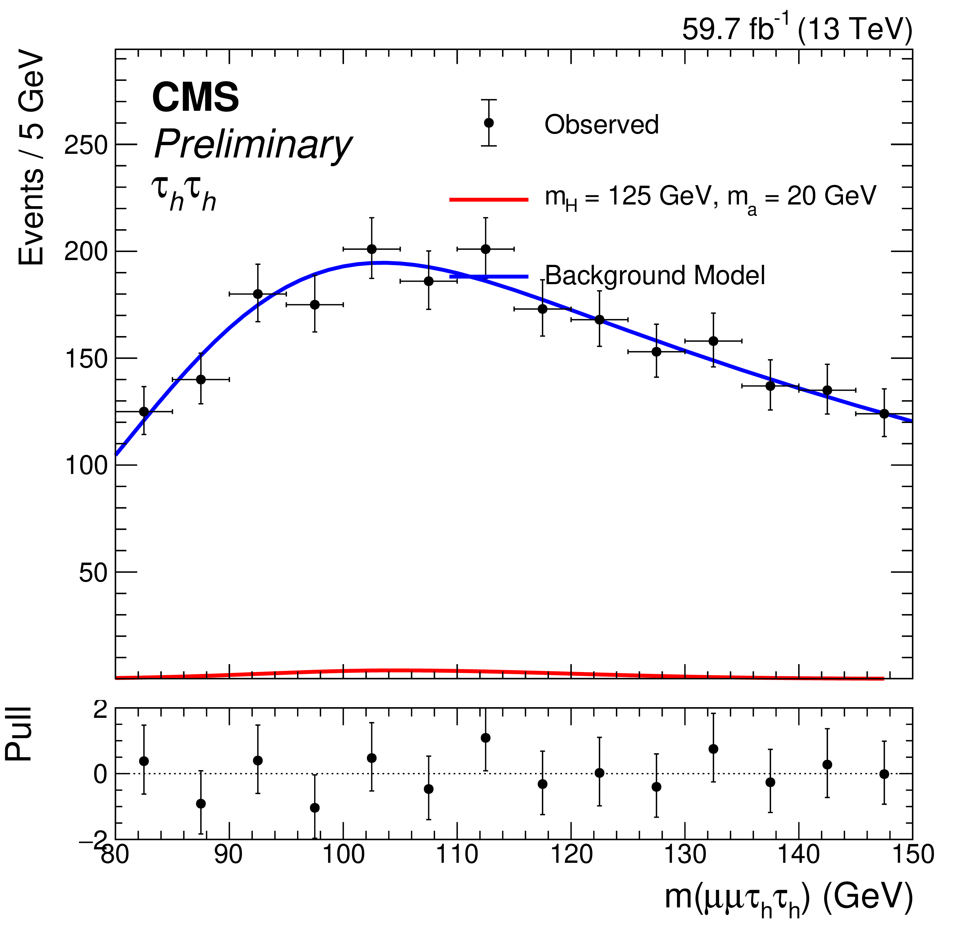 | 77 | CMS Collaboration | Search for an exotic decay of the Higgs boson to a pair of light pseudoscalars in the final state of two muons and two $ \tau $ leptons in proton-proton collisions at $ \sqrt{s}= $ 13 TeV | JHEP 11 (2018) 018 | CMS-HIG-17-029 1805.04865 |