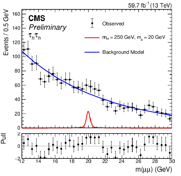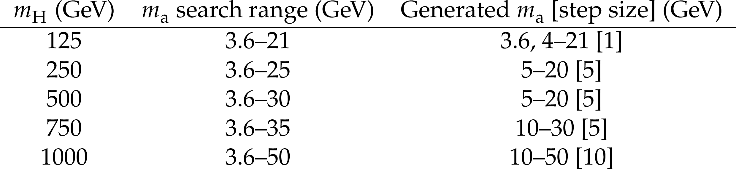 Values of the scalar mass $ m_{\mathrm{H}} $ and pseudoscalar mass $ m_{\mathrm{a}} $ considered in the search for $ \mathrm{H}\to\mathrm{a}\mathrm{a}\to\mu\mu\tau\tau $. The third column lists the generated pseudoscalar mass points; ranges are shown together with the step size in parentheses. As $ m_{\mathrm{H}} $ increases, the maximum value of $ m_{\mathrm{a}} $ to which the search is sensitive also increases. For $ m_{\mathrm{H}}=125 \text{GeV} $, the lightest neutral scalar corresponds to the SM Higgs boson. |