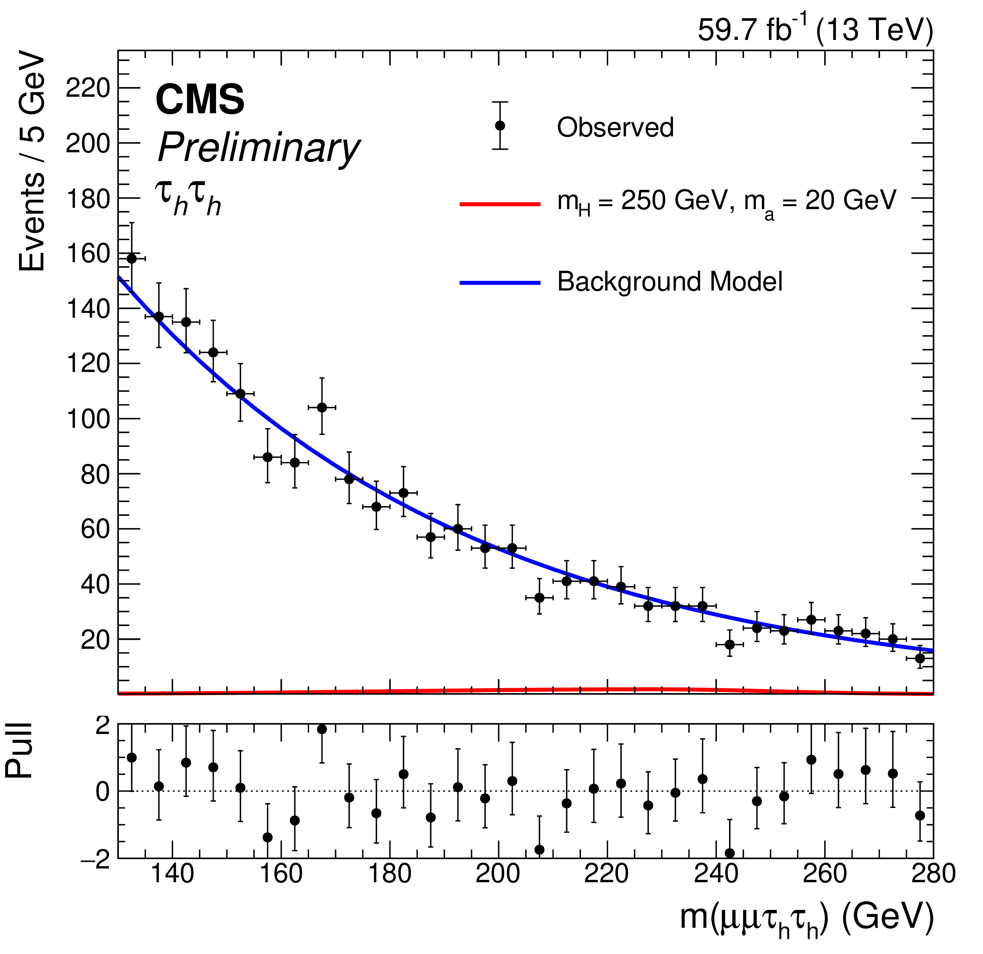 Projections of the post-fit two-dimensional background PDFs (blue) and observed data onto the $ m_{\mu\mu} $ (left) and four-body visible mass (right) axes for the $ \tau_\mathrm{h}\tau_\mathrm{h} $ channel for $ m_{\mathrm{H}} = 250 \text{GeV} $ using 2018 data. The rows correspond to pseudoscalar masses $ m_{\mathrm{a}} = $ 5, 11, and 20 GeV (from top to bottom). Sample signal distributions (red) are overlaid assuming $ \mathcal{B}(\mathrm{H}\to\mathrm{a}\mathrm{a}\to\mu\mu\tau\tau) = $ 5 $ \times 10^{-4} $. |