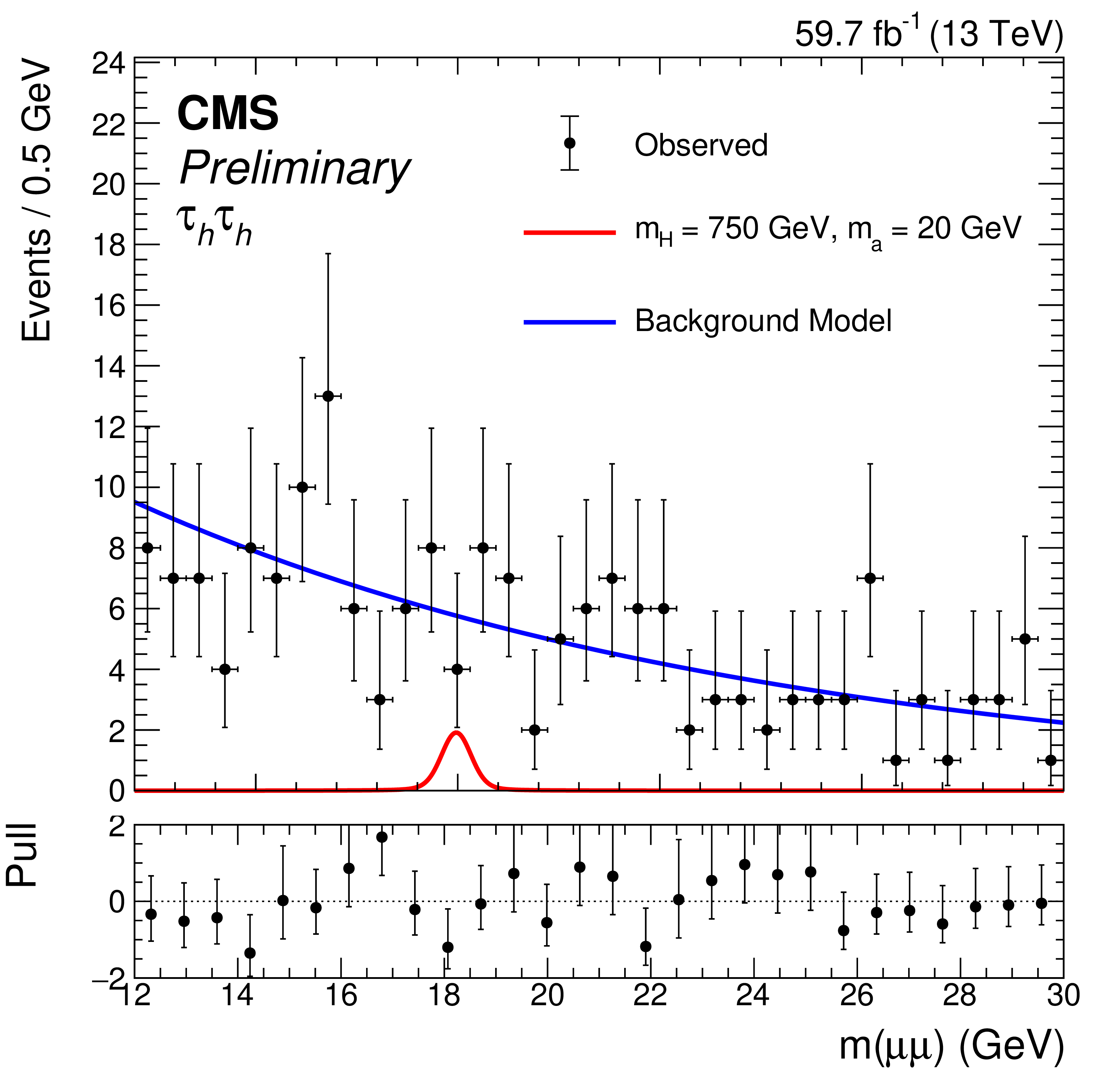 Projections of the post-fit two-dimensional background PDFs (blue) and observed data onto the $ m_{\mu\mu} $ (left) and four-body visible mass (right) axes for the $ \tau_\mathrm{h}\tau_\mathrm{h} $ channel for $ m_{\mathrm{H}} = 750 \text{GeV} $ using 2018 data. The rows correspond to pseudoscalar masses $ m_{\mathrm{a}} = $ 5, 11, and 20 GeV (from top to bottom). Sample signal distributions (red) are overlaid assuming $ \mathcal{B}(\mathrm{H}\to\mathrm{a}\mathrm{a}\to\mu\mu\tau\tau) = $ 5 $ \times 10^{-4} $. |