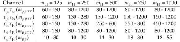 Four-body mass ranges utilized for the two-dimensional fit. For the $ \tau_{\mathrm{e}}\tau_\mathrm{h} $ channel an additional requirement is imposed on $ m_{\mu\mu} $, shown in the last row. All entries are in GeV. |