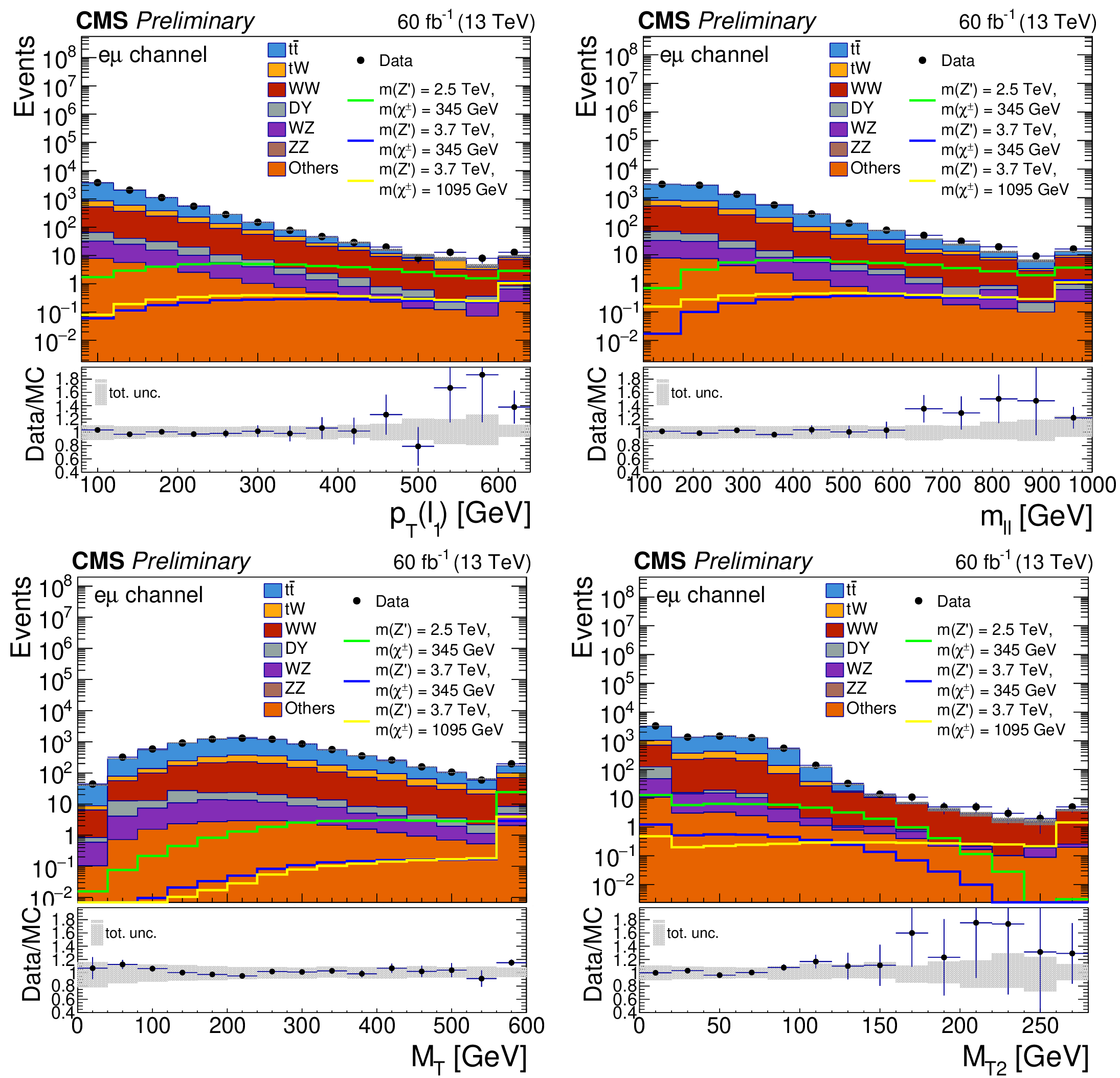 A few important kinematical variables are shown for the data set from the $ \mathrm{e}^\pm\mu^\mp $ channel using 2018 data. Leading lepton $ p_{\mathrm{T}} $ (top left), dilepton invariant mass (top right), transverse mass (bottom left) and stransverse mass (bottom right) distributions are shown. Several benchmark signal distributions are superimposed (colored lines), demonstrating good separation power between background and signal. The bottom panel of each plot displays the data-to-MC ratio (before fitting with systematics, i.e., prefit), along with the corresponding total uncertainty band (gray), which includes all systematic and statistical uncertainties except for normalization factor uncertainty of certain background processes. |