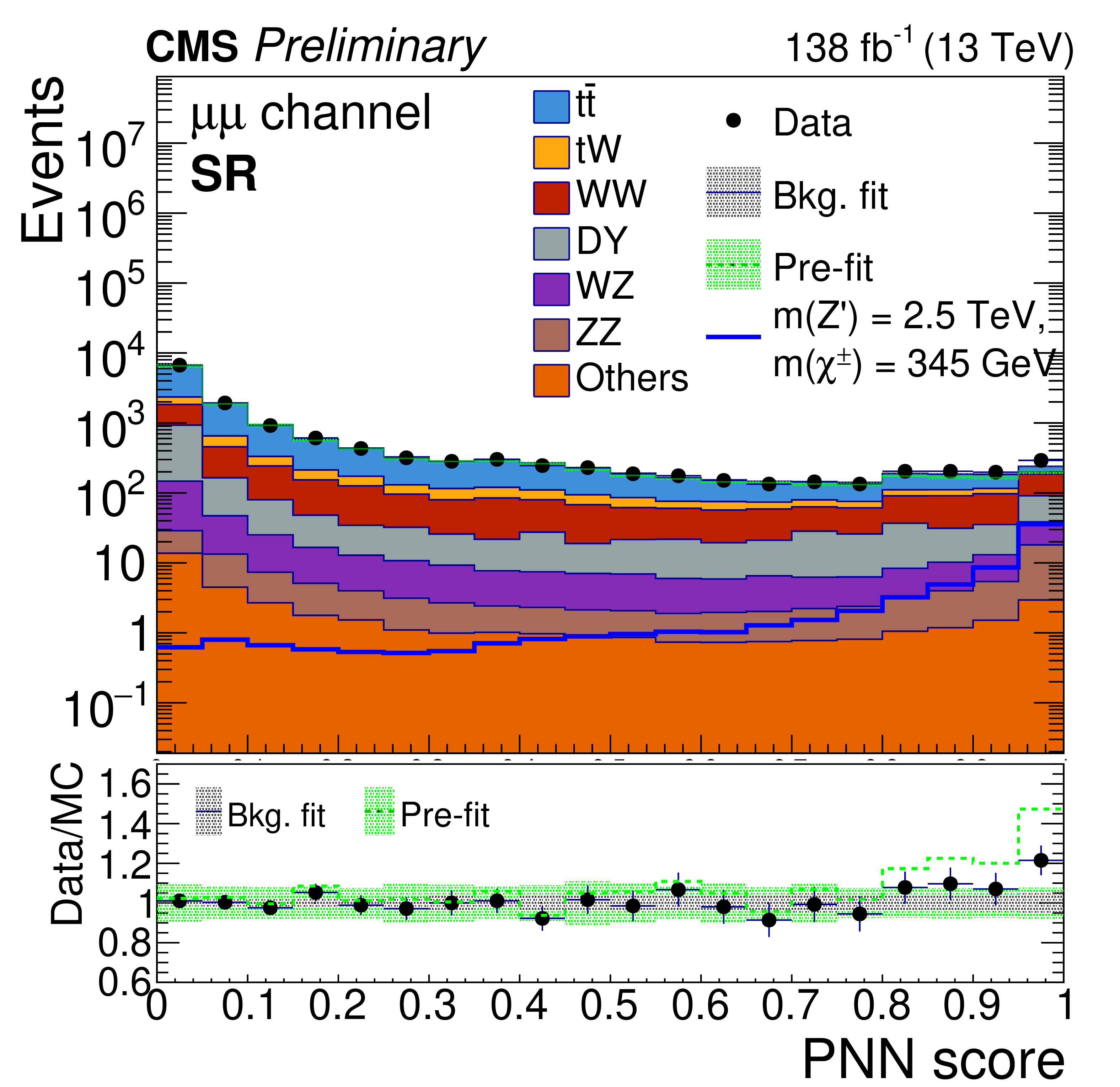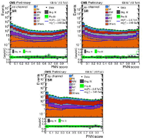 DNN score distributions obtained after the fit for the signal regions in the $ \mathrm{e}^+\mathrm{e}^- $ (top left), mm (top right), and $ \mathrm{e}^\pm \mu^\mp $ (bottom) channels. Signal distributions for a benchmark point with with $ m_{\mathrm{Z}^{'}}= $ 2500 GeV and $ m_{\tilde{\chi}_{1}^{+}}= $ 345 GeV are superimposed on the plots. The bottom panel of each plot shows data-to-MC ratios with background-only fit MC, along with the corresponding uncertainty band (gray) and with prefit MC, along with the corresponding uncertainty band (green). |