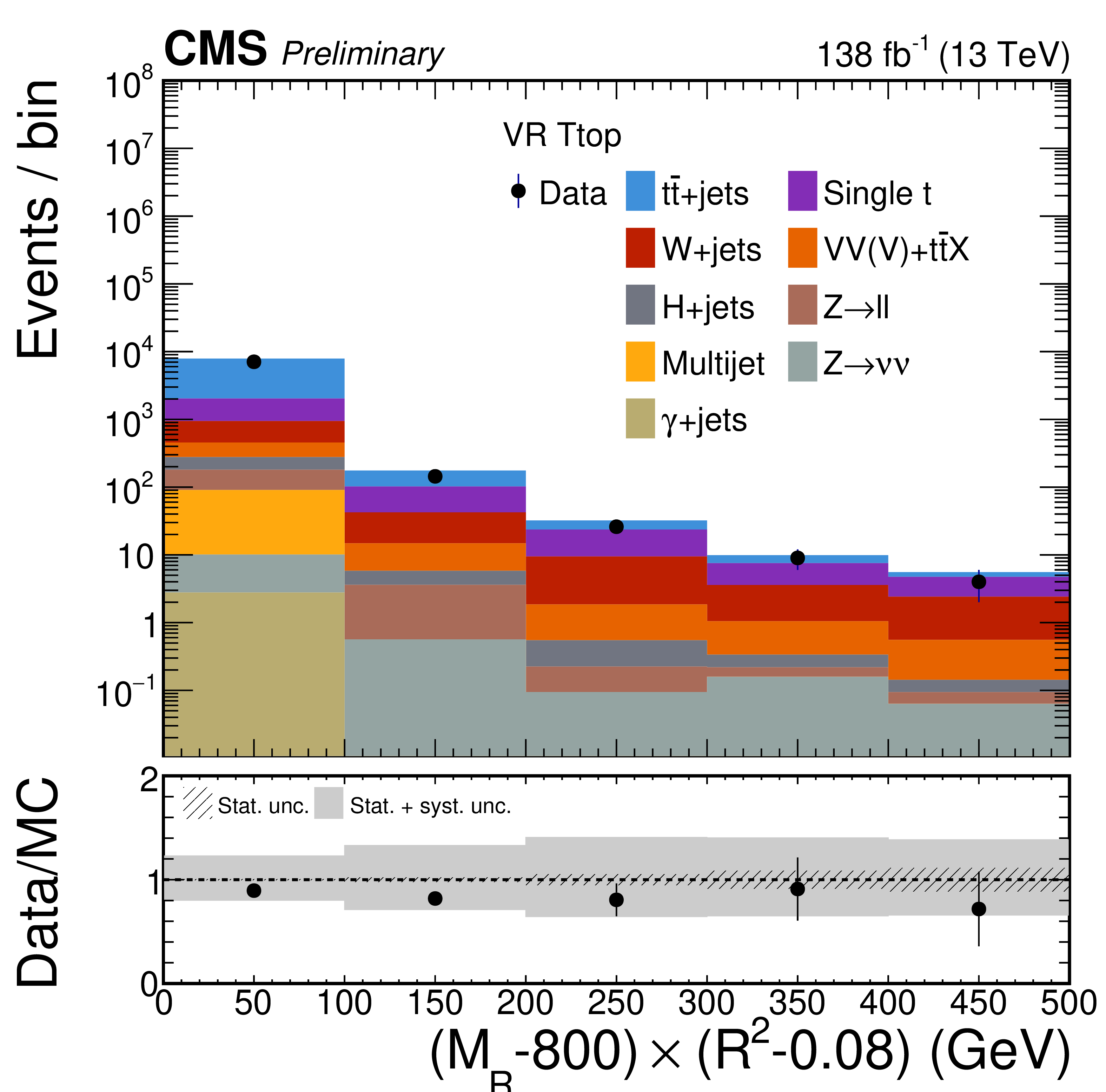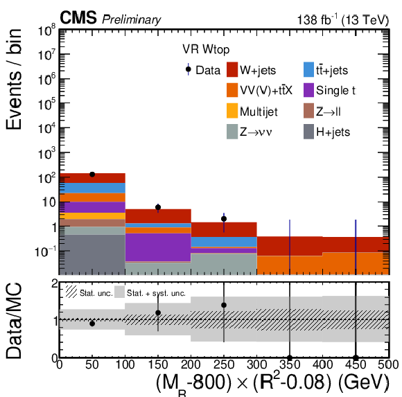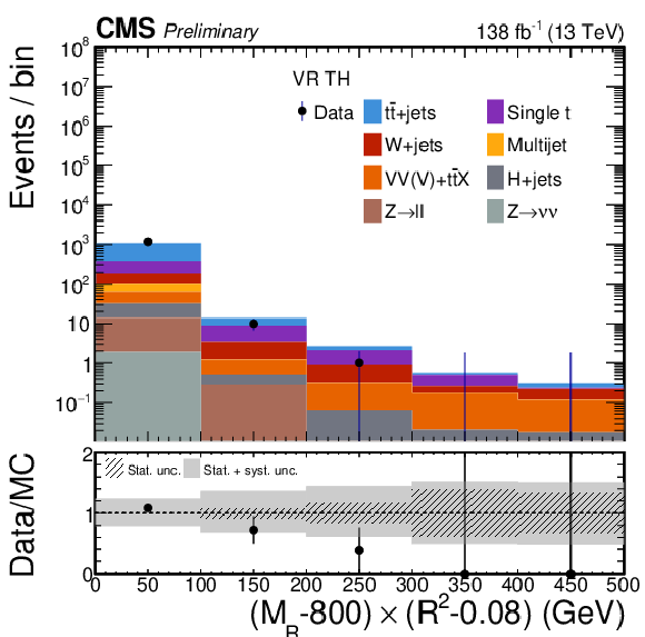 The $ (M_\mathrm{R}-800) $x$ (R^2-0.08) $ distribution observed in data is shown along with the background prediction (post-fit) obtained for the SRs. Data/background prediction ratio is shown in the lower panels, where the gray band is the total (systematic and statistical) uncertainty on the background prediction. |