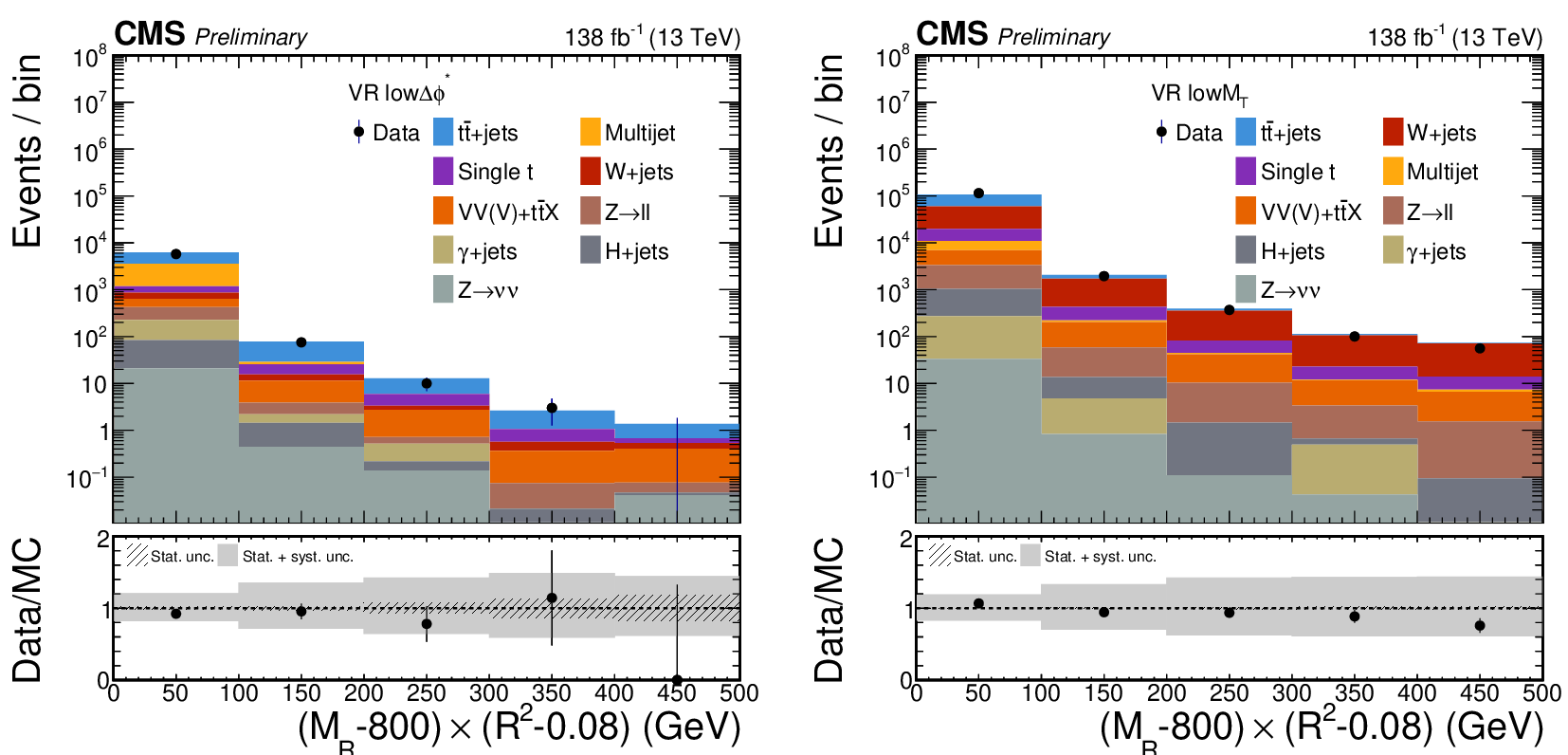 Data and estimated SM background distributions for $ (M_\mathrm{R}-800)\times(R^2-0.08) $ in VRs no 11, 12 defined in Table 5, to test the validity of CRs in cases with reverted $ \Delta\phi* $ or $ m_\mathrm{T} $, for the nonisolated leptonic regions: low $ \delta\phi^* $ (left), and low $ M_\mathrm{T} $ (right). CFs derived for the various background processes are applied event-by-event. Distributions are shown for the complete 2016-2018 data taking period, and include systematic uncertainties. |