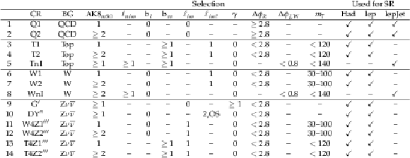 CRs used for background estimation. The region names W4Z and T4Z are abbreviations for WforZ and TforZ. $ \mathrm{b}_l $, $ \mathrm{b}_m $: b-quark jets identified with loose and medium working points. CRs 9-14 have additional selection criteria, corresponding to the $ ' $, $ '' $, and $ ''' $ signs next to the CR name: $ ' $: Photon added to $ {\vec p}_{\mathrm{T}}^{\kern1pt\text{miss}} $, $ '' $: Leptons added to $ {\vec p}_{\mathrm{T}}^{\kern1pt\text{miss}} $ and $ |\text{mass}(\ell\ell) - \text{mass}(\mathrm{Z})| < $ 10 GeV, $ ''' $: Lepton added to $ {\vec p}_{\mathrm{T}}^{\kern1pt\text{miss}} $. |