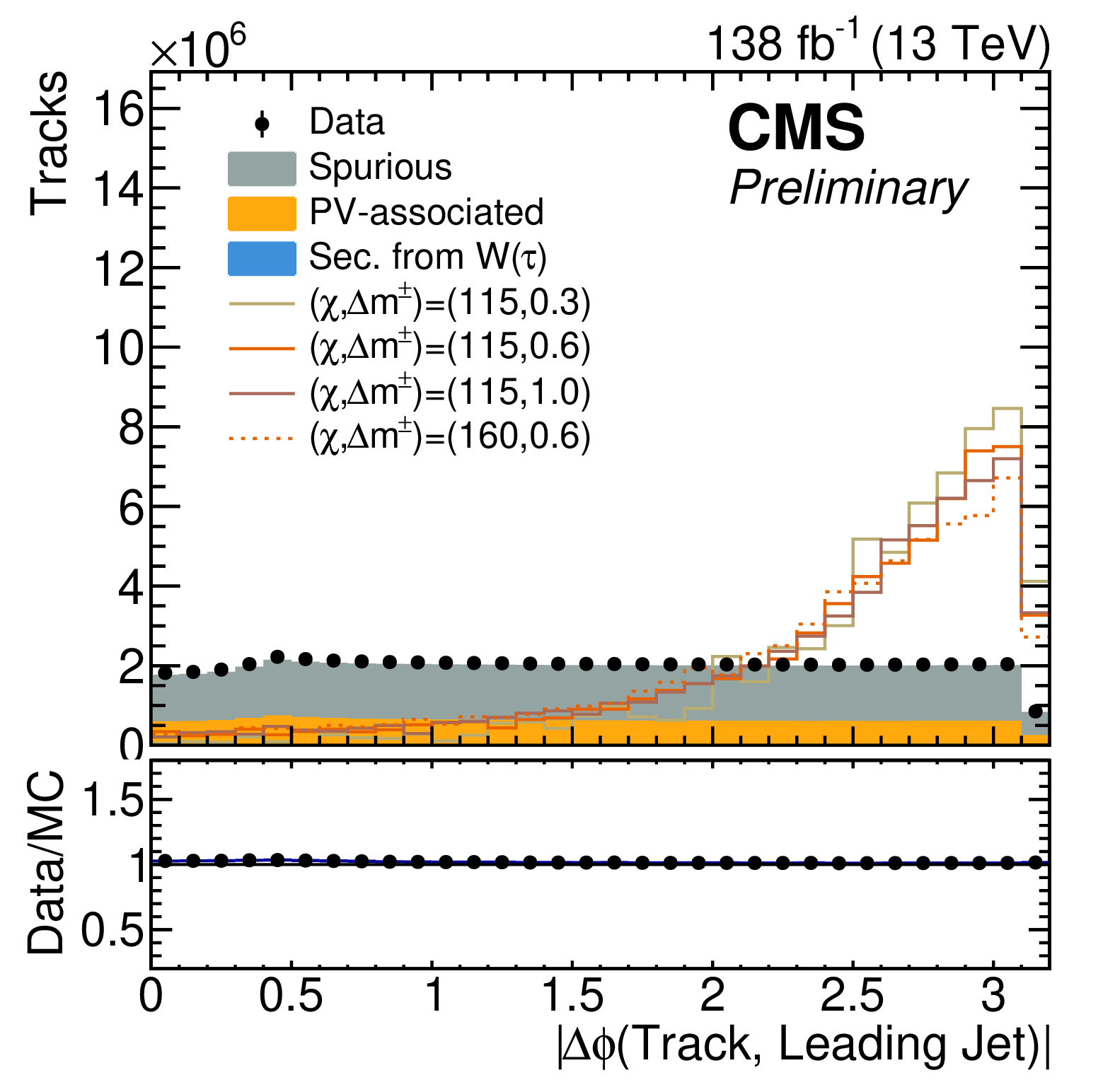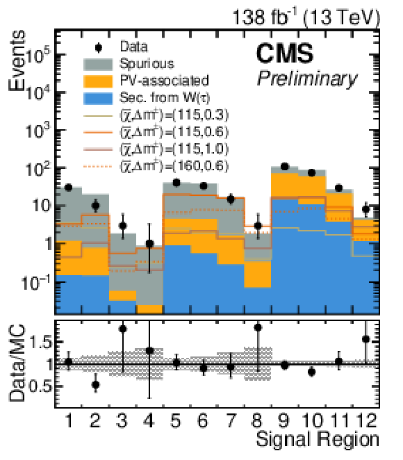 | Abstract: A search is presented for higgsino dark matter (DM) in final states with a low momentum (soft), isolated track and large missing transverse momentum. In the minimal supersymmetric standard model (MSSM), charginos are most often produced in association with a nearly mass-degenerate neutralino or another chargino, and predominantly decay into the lightest neutralino (DM candidate) and a soft pion. For a mass difference $ \Delta m^{\pm} $ less than 1 GeV, a discernible displacement of the pion's track with respect to the primary vertex can arise, reaching up to about 1 cm for the smallest allowed $ \Delta m^{\pm} $. A parameterized multivariate classifier is employed to distinguish the signal track from background tracks, optimally targeting a range of $ \Delta m^{\pm} $ by exploiting the track transverse momentum, impact parameter, and event topology to varying degrees depending on the assumed $ \Delta m^{\pm} $. The analyzed data correspond to an integrated luminosity of 138 fb$^{-1} $ collected by the CMS experiment in proton-proton collisions at $ \sqrt{s}=$ 13 TeV. No evidence of new physics is observed, and limits are set at the 95% confidence level in the mass plane of the model. Assuming MSSM cross sections, values of $ \Delta m^{\pm} $ between 0.28 and 1.15 GeV are excluded for a 100 GeV mass chargino, and chargino masses up to 185 GeV are excluded for $ \Delta m^{\pm} $ of 0.55 GeV. | ||