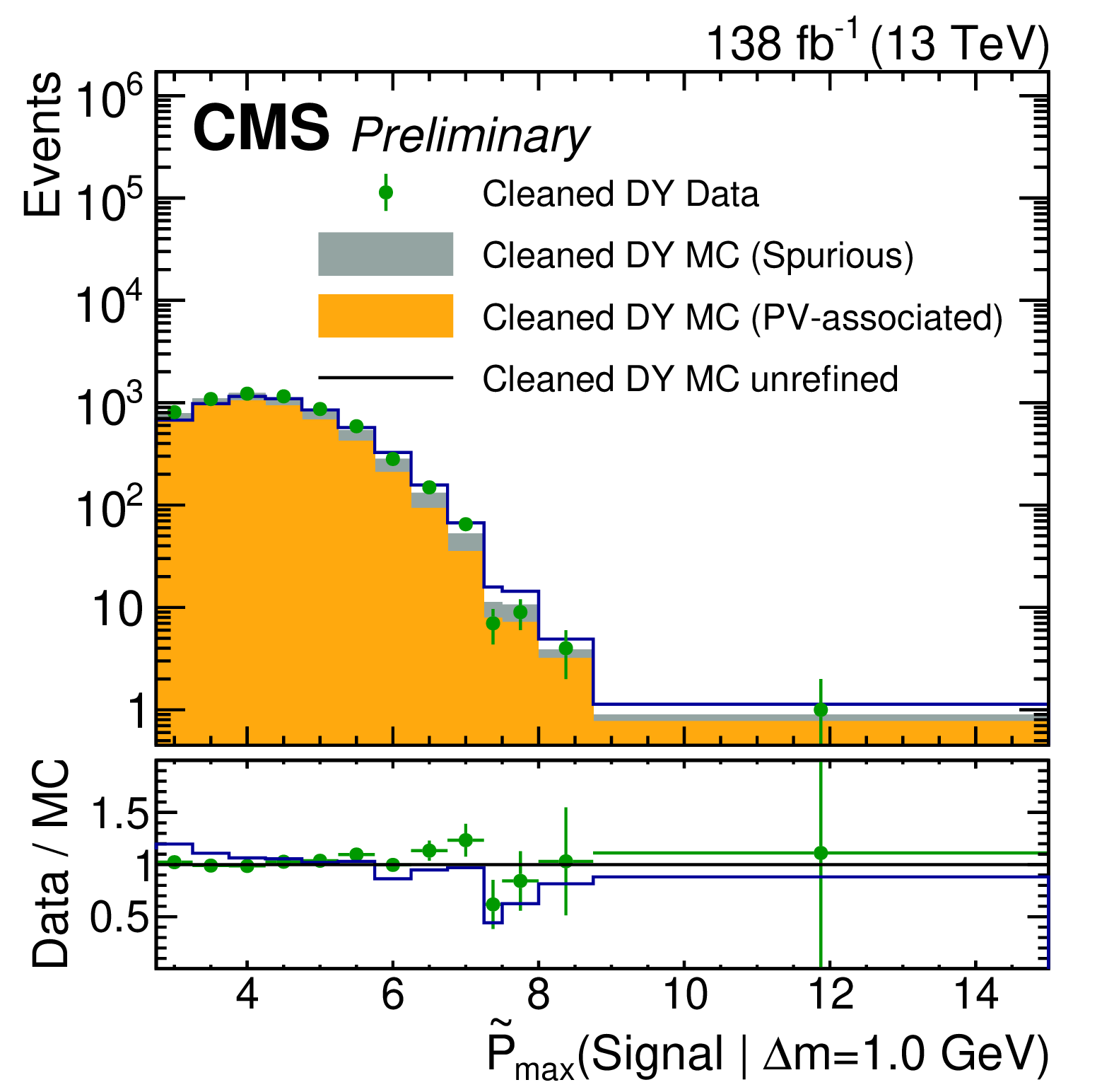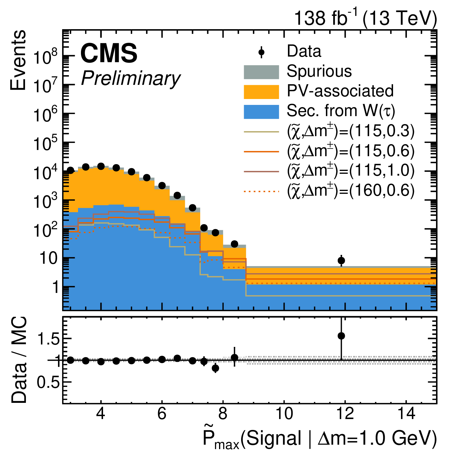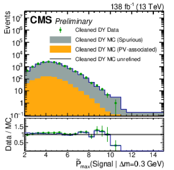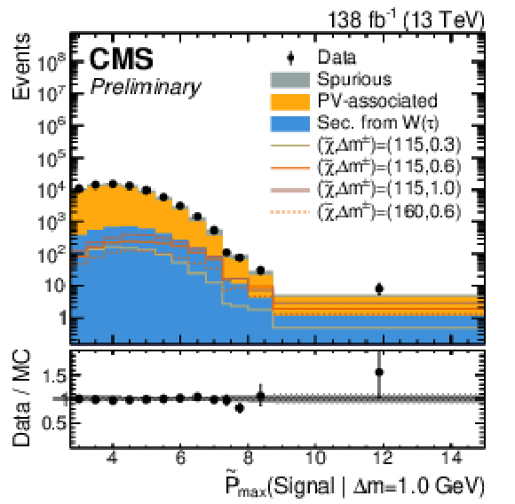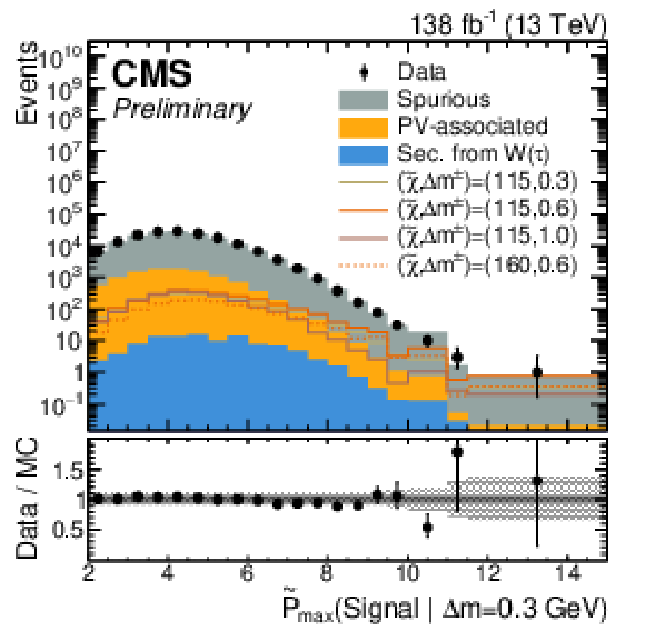 The first three plots show the expected and observed data in the signal-sensitive observables $ \mathrm{ \tilde{P} }_{\text{max}}(\text{Signal} | \Delta m = 0.3,\,0.6,\,1.0\ \text{GeV}) $. In the lower ratio panel, the gray shaded region shows the relative statistical uncertainty in the background estimate, while the black vertical error bars indicate the total uncertainty in each bin. The fourth plot shows the output of the $ \tau $ node of tracks with a loose selection of $ \mathrm{ \tilde{P} }_{\text{max}}(\text{Signal} | \Delta m = 0.3\ \text{GeV}) > - $2, indicating the $ \tau $-based signal proxy region. |