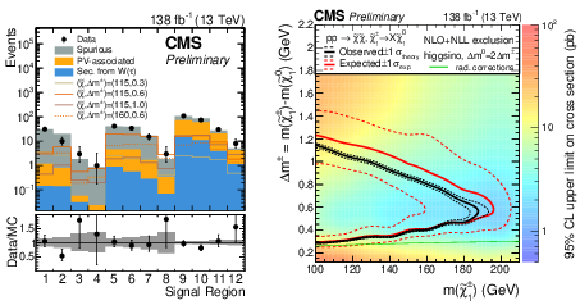Left: Expected and observed counts in the 12 SRs. The black error bars and gray band in the lower panel show the relative statistical uncertainties in the data and prediction. Four signal benchmark models are shown, corresponding to the inclusive production of all possible pairs of higgsino-like electroweakinos. Right: The heat map shows the 95% CL upper limit on the cross section. The expected (red) and observed (black) bounds indicate the region to the left of which the model space is excluded, assuming theoretical cross sections calculated at NLO-NLL [56,57]. Red dashed lines show the expected limits varied by the experimental uncertainties while black dashed lines are the observed limits with theoretical cross sections varied by their uncertainty. Branching fractions of the chargino are taken from [58]. |