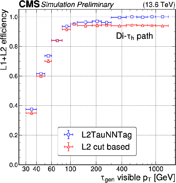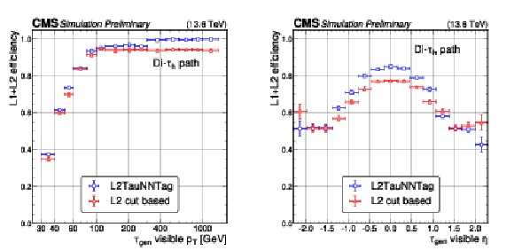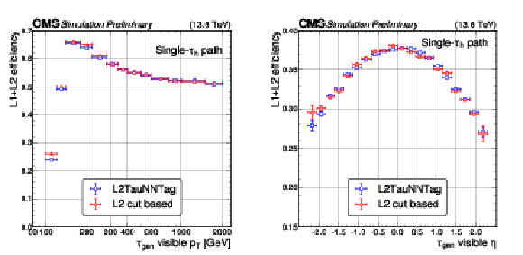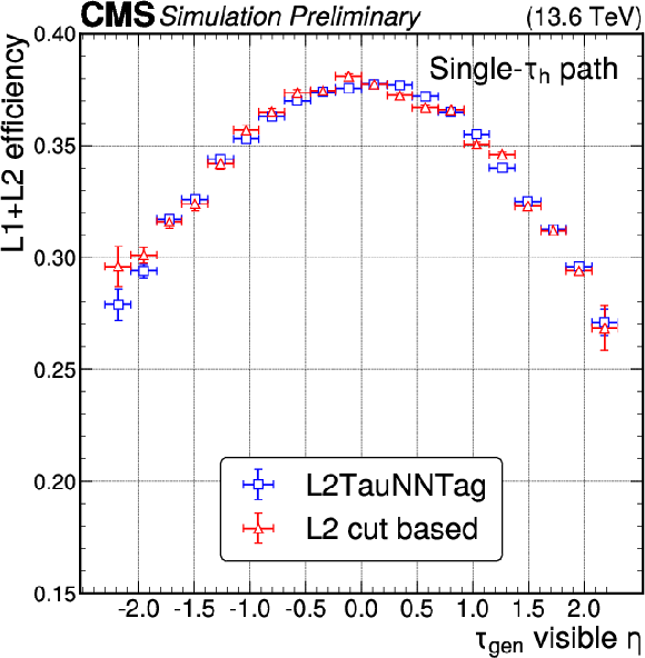 Performance of the L2TAUNNTAG in the di-$ \tau_\mathrm{h} $ HLT path, using simulated VBF $ \mathrm{H}\to\tau\tau $ and BSM $ \mathrm{Z}^{'}\to\tau\tau $ events. The absolute efficiency of the reconstructed L2 $ \tau_\mathrm{h} $ candidates as a function of the visible generator-level $ \tau_\mathrm{h} p_{\mathrm{T}} $ (left) and $ \eta $ (right) are shown, where ``visible'' refers to the fact that the contribution of neutrinos is not taken into account. The uncertainties shown by the error bars are from the number of events available in the sample. Some of the error bars are smaller than the markers and are not shown. |