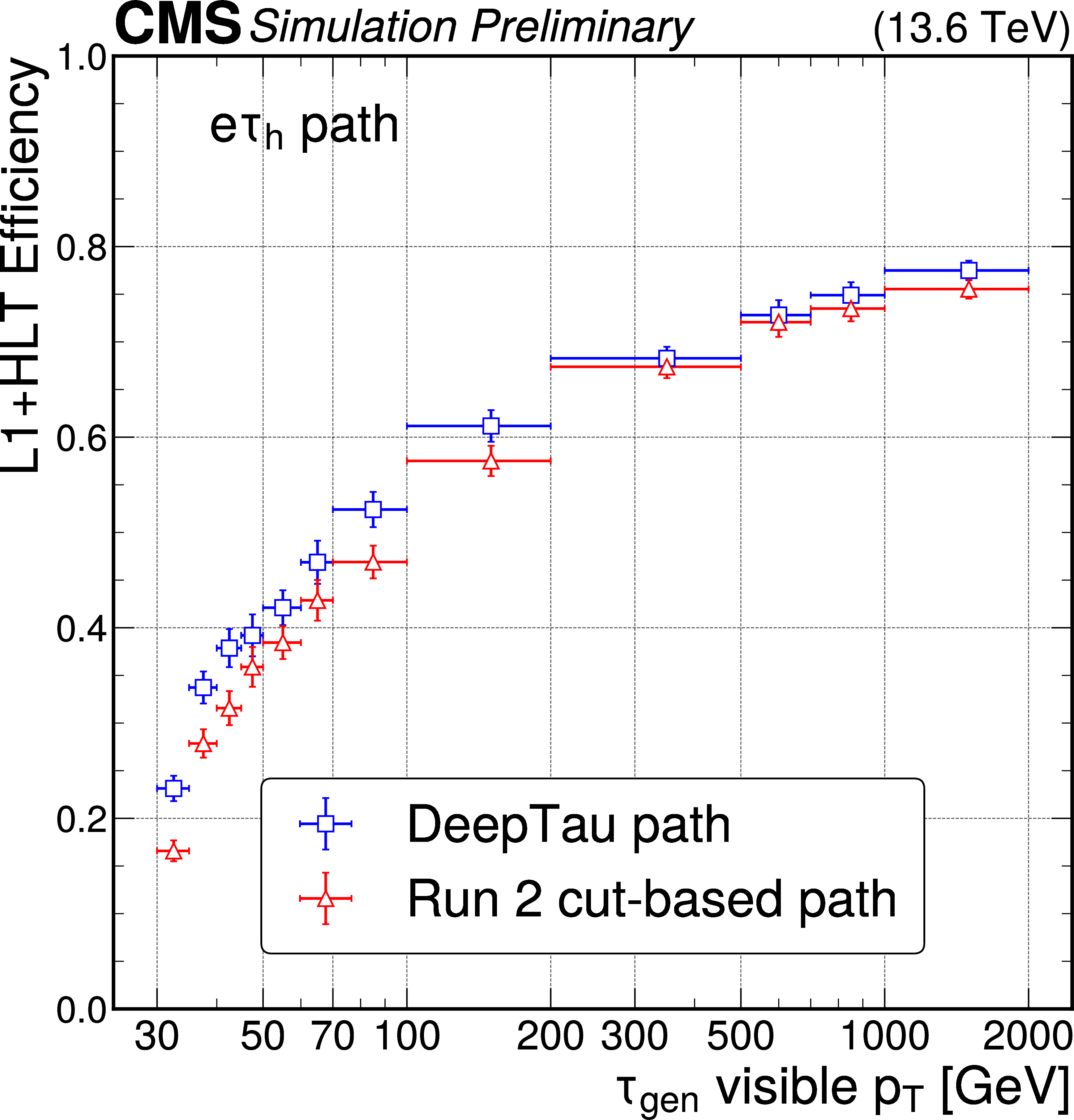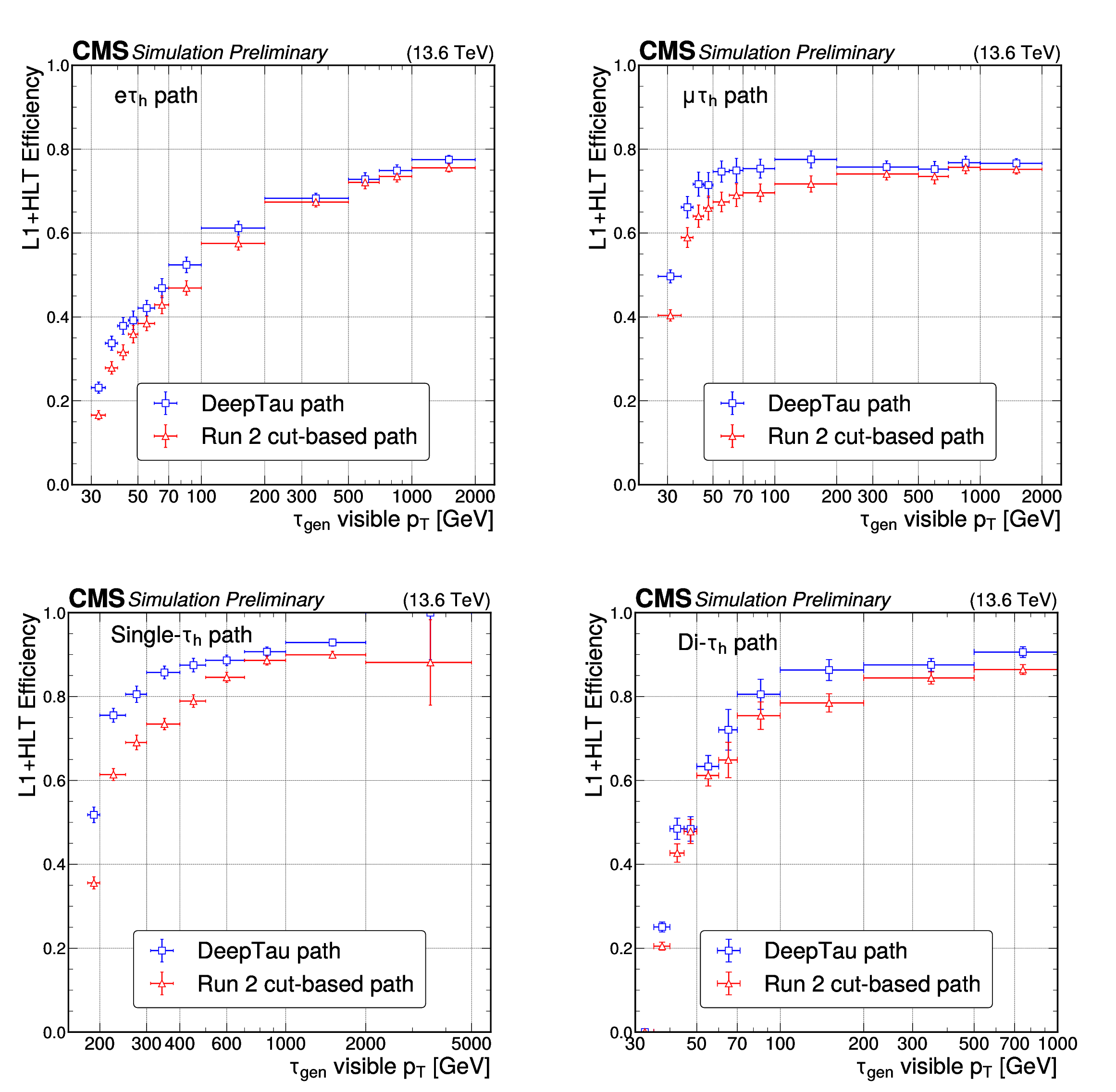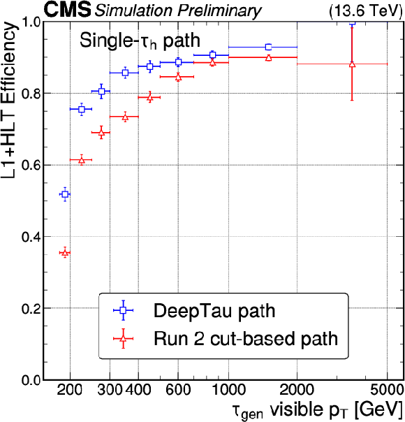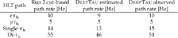 Rate estimation and observation for several $ \tau_\mathrm{h} $ HLT paths. The first column is the expected rate of the Run 2 cut-based paths linearly scaled to Run 3 luminosity. The second column is the rate of DEEPTAU paths estimated with Run 2 data and scaled to Run 3 luminosity. The third column is the rate of DEEPTAU paths observed in Run 3. The Run 2 estimation is based on an instantaneous luminosity of 1.68 $ \times $ 10$^{34}$ cm$^{-2}$s$^{-1} $. The Run 3 projection is evaluated with 2.0 $ \times $ 10$^{34}$ cm$^{-2}$s$^{-1} $. The Run 3 observed rates are recorded with 1.87 $ \times $ 10$^{34}$ cm$^{-2}$s$^{-1} $. The rates are inclusive calculations not excluding shared contributions from other algorithms or paths. |