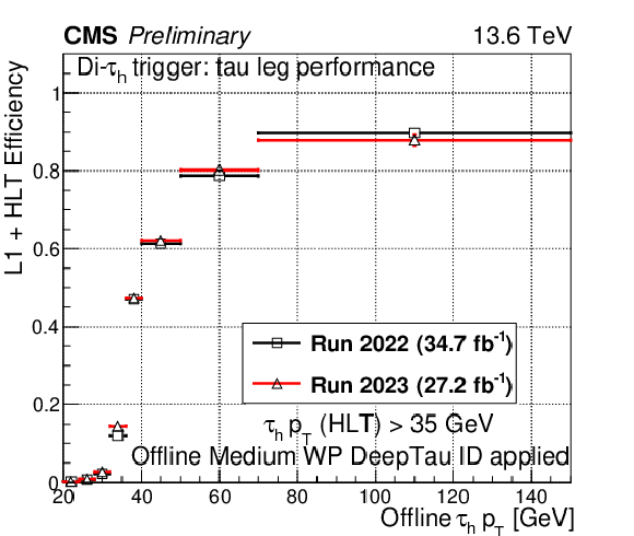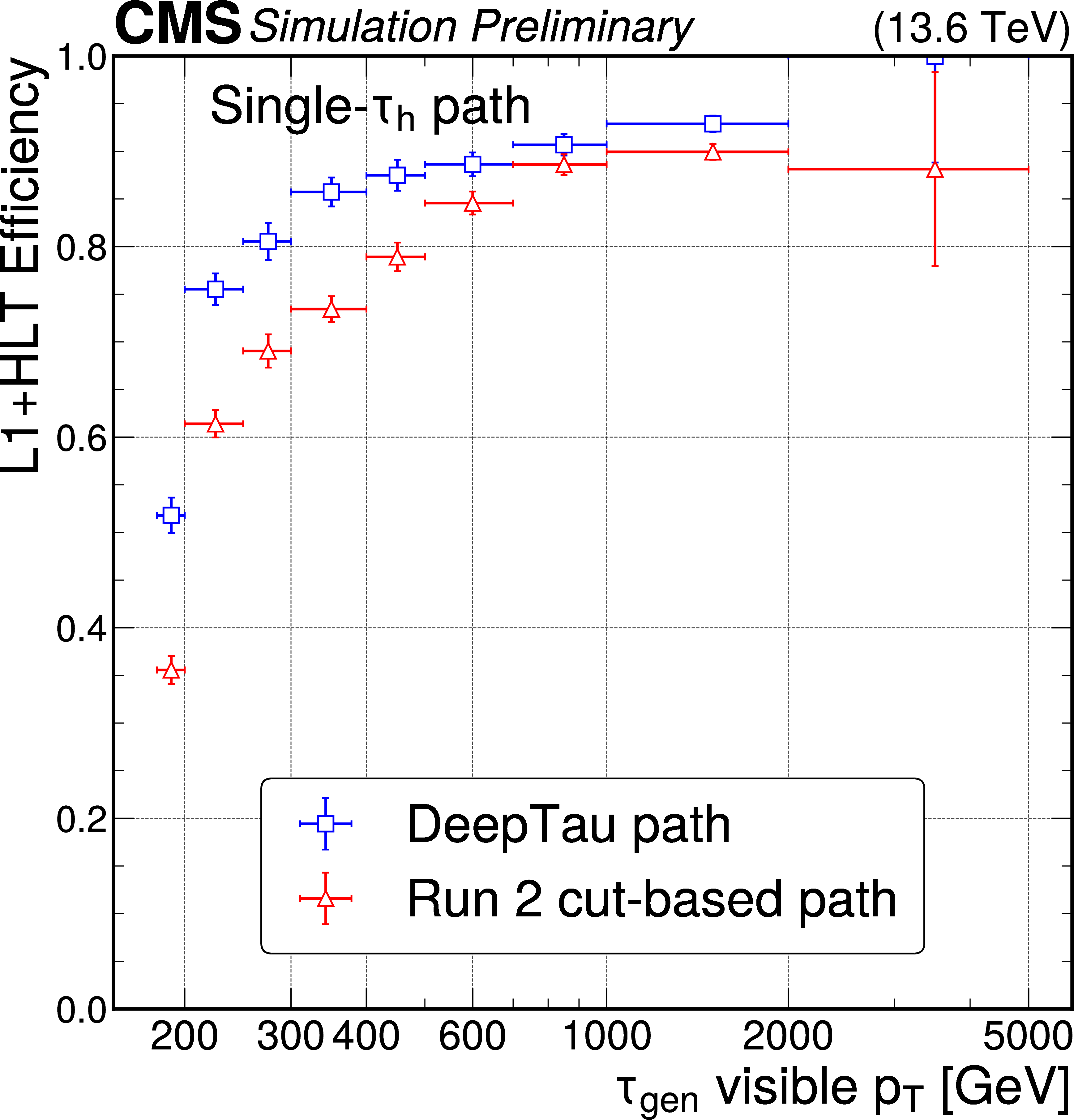 | Performance of the high-level hadronic $ \tau $ triggers of the CMS experiment in proton-proton collisions at $ \sqrt{s} = $ 13.6 TeV | ||